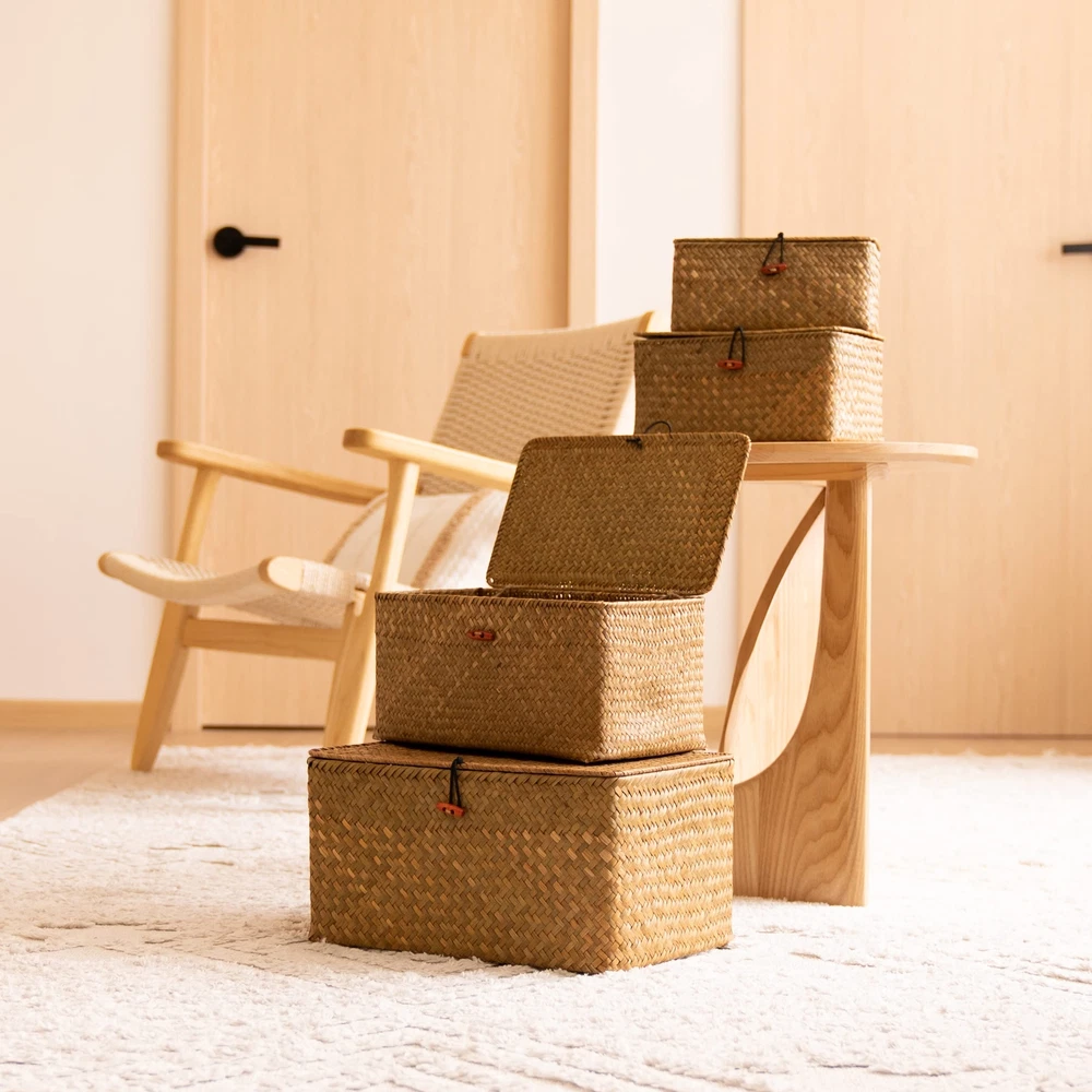 Dimensions: XL: 14.2 x 9.4 x 7.1H, L: 12.2 x 7.1 x 5.9H, M: 10.2 x 5.9 x 4.7H, S: 9.1 x 4.7 x 3.9H. Material: 100% Natural Seagrass with iron wire frame, provides durable quality and soft touch. Save Space: Perfect for storage DVDs, CDs, books, remote control, buttons, snack in living room. Skin-care products, socks, Card issuance in bedroom. Toiletries, towels in bathroom. That will make your home organized. Features: These storage baskets with lids that could protect your things from dust. The pastoral design style will make your home full of nature. Easy Cleaning: Wipe gently with damp cloth and store in a dry area.