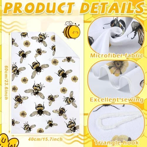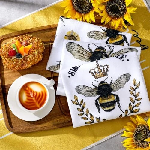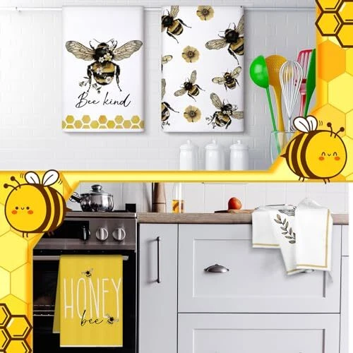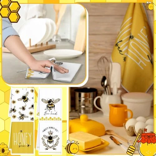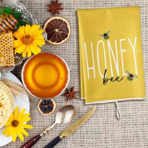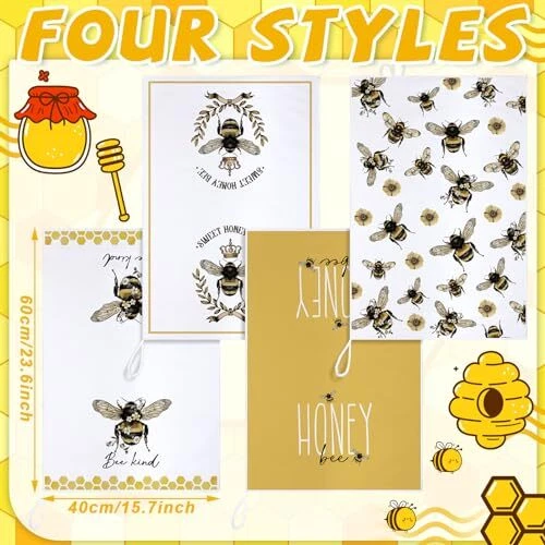 Features: Kitchen gifts: These farmhouse tea towels are thoughtful gifts for your family, friends and cooking enthusiasts at housewarming parties, birthday parties, Thanksgiving, Christmas and other occasions. Practical cleaning functions: The bee bathroom hand towels are very suitable for cleaning dishes, counters, drying dishes, TV sets, furniture and tiles, which will be good home and kitchen helpers. Specifications: Material: polyester Color: as pictures shown Size: about 40 x 60 cm/ 16 x 24 inches Package includes: 4 x Bee and flower dish towels Notes: Manual measurement, please allow slight errors on size. The color may exist slight differences due to different screen display. Various Styles: you will receive 4 different styles of dish towels, enough to meet your daily replacement and different washing and drying needs, and it is also a good idea to share with your family and friends Cute Bee Designs: each bee and flower tea towel comes with an innovative design pattern, the main black, white and yellow color mix is full of farmhouse sense, and lovely bee patterns will add more fun to your kitchen decor Use for a Long Period: these cute towels are made from reliable polyester, and do not scratch your hands or skin, which are tasteless, resistant to wear and tear, and do not fade or break easily, making them proper for a long term use; If you feel that the softness is not enough, you can use it after wetting Versatile Occasions: these lovely hand towels can be applied in a variety of places, such as kitchens, restaurants, hotels, offices, gyms, markets, cafes, sweet shops, shops, bathrooms, canteen and other occasions, and they can be easily hung with the hook design Considerate Size: bee and flower holiday tea towels are about 40 x 60 cm/ 16 x 24 inches, they are of a reasonable size and are easy to carry and store, can be put in a drawer or cabinet when not in use without taking up too much space, to keep the kitchen clean