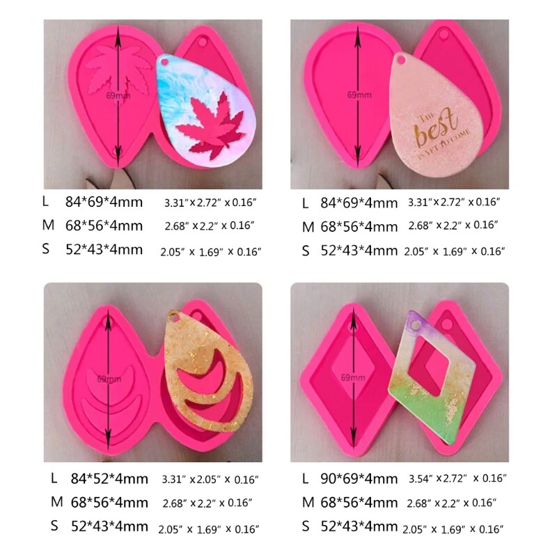 brand new and high quality Features: Made of silicone, eco-friendly, non-toxic, flexible, reusable and durable. Non-stick, easy to separate, temperature resistant, easy to clean, eco-friendly, low carbon, can be recycled. Simple and useful, healthfulness, corrosion resistant and adaptability Use: For earrings, jewelry pendant, DIY making, Perfect for you and your family DIY together. Unique Gift for Someone You Value: Give your gifts to your loved ones, friend on birthdays, Christmas, New Years, weddings, Warm Tips: We only provide silicone mold. Please make your own! 2. After squeezing and deforming, you only need to rest for a while, and then the 3. After use, please wash with water, then dry, store it flat, and store in a cool place. 4. Please avoid heating and for sharp tools. Silicone Molds only,other accessories in the picture is not included. Specification: Material: Silicone Optional Size: S, for M, L S Size: app.5.2x4.3x0.4cm/2.05x1.69x0.16in for M Size: app.6.8x5.6x0.4cm/2.68x2.2x0.16in L Size: app.8.6x6.9x0.4cm/3.31x2.72x0.16in Color: Pink Quantity: 4 Pcs Note: No retail package. Please allow 0-1cm error due to manual measurement. pls make sure you do not mind before you bid. Due to the difference between different monitors, the picture may not reflect the actual color of the item. Thank you! Package Contents: 4 Pcs x Silicone Molds