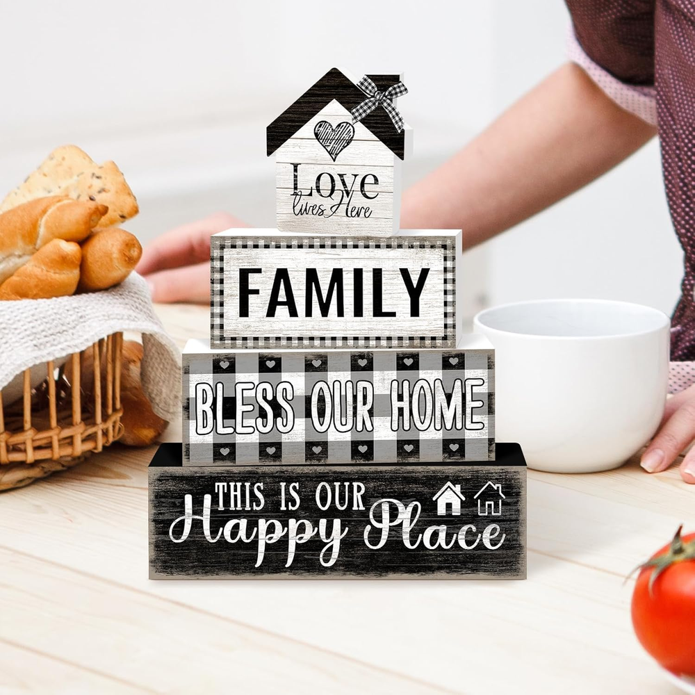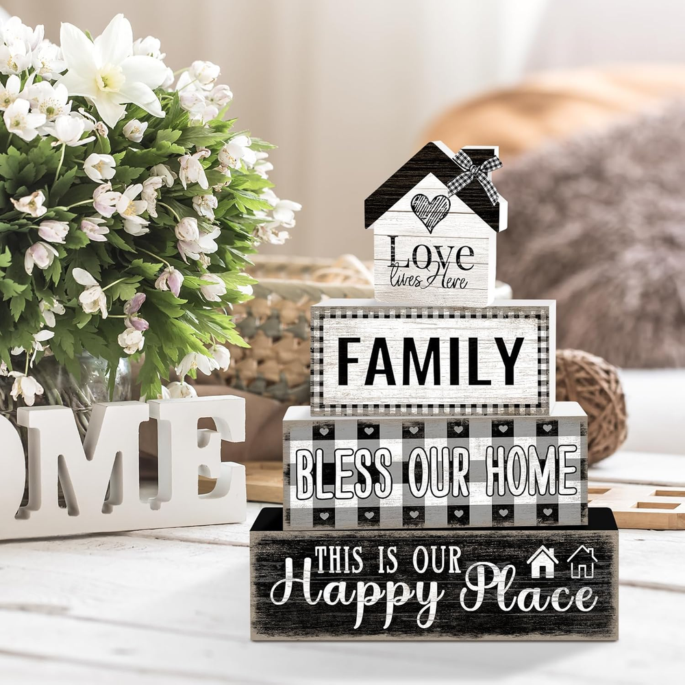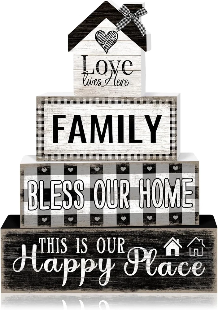 Store New Arrivals Add to Favorite View Feedback Contact 4 Pcs Farmhouse Family Wooden Tiered Tray Decor Set, Rustic Bless Our Home Wood Table Decor Buffalo Plaid Distressed Stack Block Signs Tabletop Centerpieces for Home Kitchen Shelf Mantle Decorations Description Item model number LQ2503315007 Style Family Mounting Type Tabletop Batteries required No Product Dimensions 6 x 1.3 x 5.1 inches Material Wood Shape Rectangular Item Weight 7.8 ounces Color Farmhouse Family Theme Family Brand TOMPOP Manufacturer TOMPOP Warm Rustic Family Vibes: This farmhouse-style decor set brings a cozy, nostalgic touch to your home with retro-inspired designs, rustic wood textures, and heartfelt words like “Family,” “Love,” and “Home.” Vintage-Inspired Faux Book Stack: Featuring a distressed wood finish and hand-painted lettering, these stacked book blocks evoke a charming, well-loved look that beautifully complements rustic, vintage, cottagecore, and country-style interiors. Ideal Size for Versatile Displays: Includes three wooden blocks (5.9” x 1.3” x 1.7”, 4.9” x 1.3” x 1.7”, and 4” x 1.3” x 1.7”), plus one small love home. Perfect for tiered trays, mantels, kitchen shelves, or entryway tables. Crafted with Quality & Care: Made from premium solid wood, this farmhouse block set boasts a sturdy construction and a beautifully hand-distressed finish. A timeless accent that celebrates the heart of your home all year round. Heartfelt Gift Idea: Whether for Mother's Day, a housewarming, a wedding, or just to show appreciation, this retro farmhouse block set makes a thoughtful gift that adds lasting warmth to any space. Add a touch of warmth and rustic charm to your home with this Farmhouse Retro Faux Book Stack, featuring heartfelt words like “Family,” “Love,” and “Home.” Inspired by the timeless beauty of country living, this decorative tabletop piece captures the essence of togetherness and simple joys. Crafted in a vintage stacked book design with distressed wood textures and hand-painted details, it brings nostalgic flair to any space. Whether styled on a tiered tray, coffee table, mantel, or kitchen shelf, it effortlessly enhances your home with cozy farmhouse character. Perfect as a year-round accent or a meaningful gift for weddings, Mother’s Day, housewarmings, or any occasion celebrating love and family. ABOUT US We offer the best prices around on high quality products. Our E-store includes media such as books, movies, music and games while offering electronics, toys, sporting apparel, clothing, tools, general home, garden items and more. SHIPPING We are always working hard to ensure your package arrives as soon as possible. Please understand that some factors like weather, high postal traffic, and the performance of shipping companies are outside of our control. We offer free shipping to the lower 48 states and ship within 2 business days of payment, usually sooner. We do not accept P.O. Boxes. Please provide a physical address. RETURNS We offer a 30-Day Return Policy on items which you are not completely satisfied with. You have the option for a full-refund or an exchange of the item. No returns are available on items shipped outside of the USA. PAYMENT We accept PayPal. CONTACT US This page content is yet to come Please ad us to your favorite seller and visit again later Thank You CUSTOMER SATISFACTION We try our very best to make sure every customer is completely satisfied. If there's a problem, message us! We're happy to help.