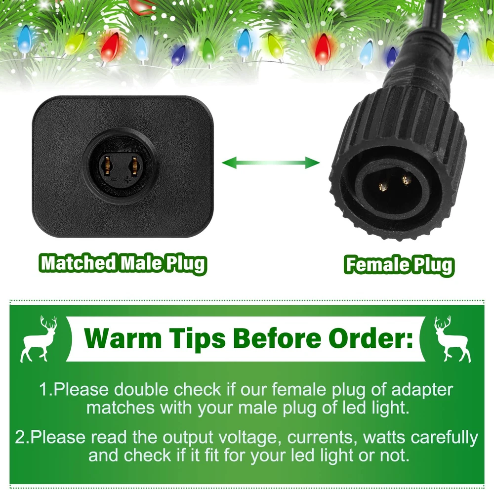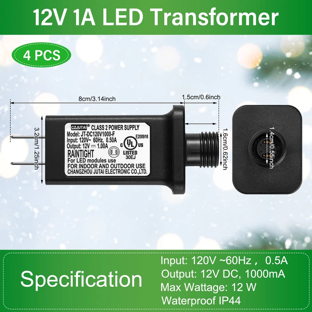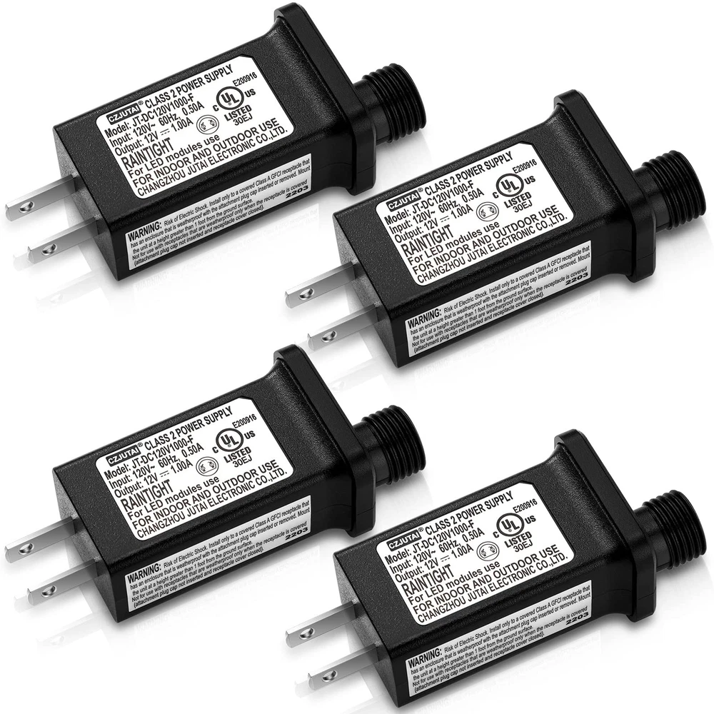 What You Will Get: you will receive 4 Christmas light plug adapters for your use at Christmas, which will help you to create a beautiful Christmas atmosphere with light for your Christmas party decoration. Notice:The number on the side of the product represents the date and does not affect the use. Class 2 Power Supply Specification: the input power of adapter for Christmas lights is 120V, 60HZ, and the output is 12V12W 1A, please check the voltage, current, wattage and (+/-) two holes of your connector before purchasing Stable Waterproof Power Supply: class 2 power supply transformer has IP44 rainproof, which can be applied indoor and outdoor, which are suitable for most home power supply in the US Product Modes: low voltage transformer plugs have a constant light mode, which is beautiful on the Christmas tree, it can meet your daily using needs; The adapter does not contain a wire Widely Appliable: Christmas lights adapters are suitable for low-voltage Led devices, such as holiday decorative lights, Christmas trees, line lights, lawn lights, curtain lights, table lamps, fountain lights, inflatable equipment, step lights, etc., Christmas inflatable decorative power adapter