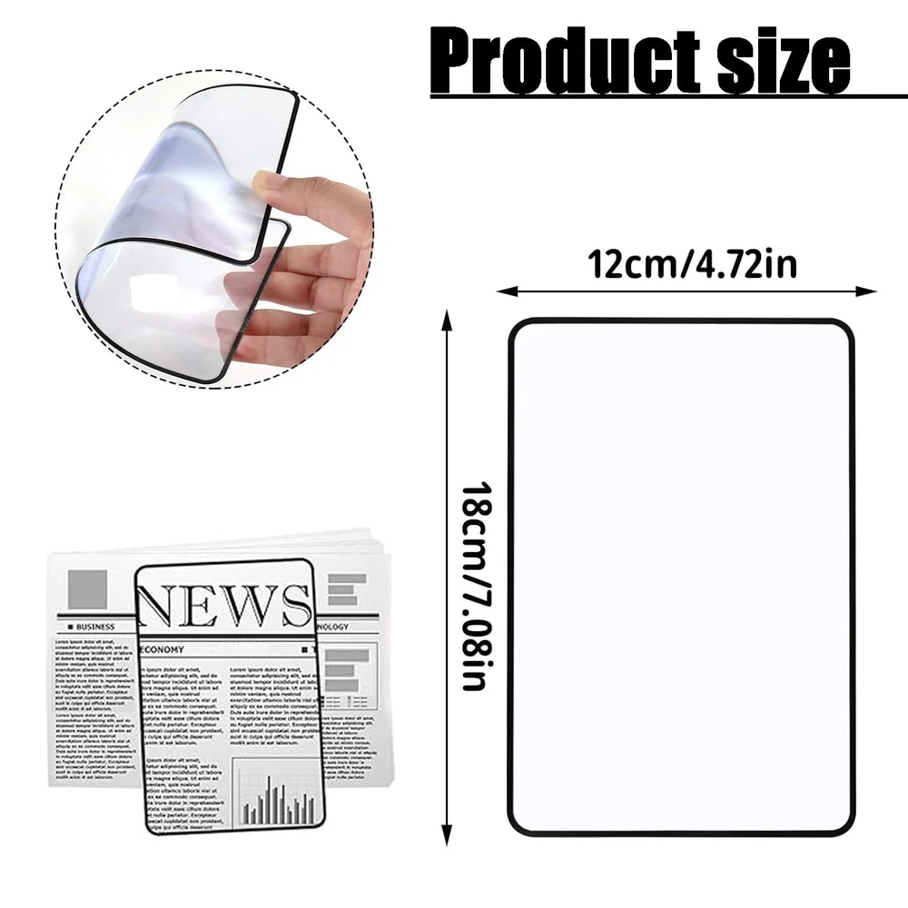 4 Pcs Page Magnifying Sheet-3X Lightweight Flat Optical Plastic Lens,Bookmark 【Flexible Pvc Material】These 3X magnifying sheets are made of quality PVC material, provide excellent magnification to produce superb image clarity, and featured ultra-light and ultra-thin, lightweight and flexible, not easy to break, and easily carry around. Ideal for longer reading time. 【Large Viewing Area】This sheet magnifying glass provides a clear image and will not make your eyes feel uncomfortable, it can magnify up to 300%; Size is about 7 x 4.72 inches/ 18 x 12 cm, Rectangular magnifying sheet covers a large viewing area, you don't need to move your hands all the time to get the best view. 【Ideal Reading Magnification】All the magnifying lenses included in this papckage magnify up to 300%. It is considered the most comfortable magnification for reading small prints, ideal for Viewing and checking tiny hobby and crafting materials, small electronic gadget parts such as screws and pins. 【Easy to use】Magnifying sheet not only a magnifying sheet but also can be a useful bookmark which makes you read simply. 【Package includes】You will receive 4 pieces page reading magnifier, You can put them where you might use them, such as your home, car, office and so on.You can use it as a bookmark. Package includes: 4 x Sheet magnifying glass Specifications: Material: PVC Color: White transparent+black edge 3X lens focal length: 2.5inch to 3.5inch Size: 7 x 4.7 inch/ 18 x 12 cm Shipping We offer FREE shipping on all orders! We ship within Three business days of payment, usually sooner. We use a selection of shipping services such as UPS, FedEx, USPS etc. We only ship to the lower 48 states, no APO/FPO addresses or PO Boxes allowed. Local pickups and combined shipping options are not provided at this time. Return You can return a product for up to 30 days from the date you purchased it. Any product you return must be in the same condition you received it and in the original packaging. Please keep the receipt. Feedback Customer satisfaction is very important to us. If you have any problem with your order, please contact us and we will do our best to make you satisfied. Contact Us If you have any queries, please contact us via ebay. We usually respond within 24 hours on weekdays. Please visit our eBay store to check out other items for sale! Thank you for shopping at our store.
