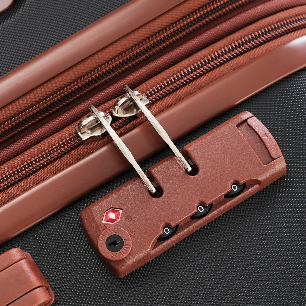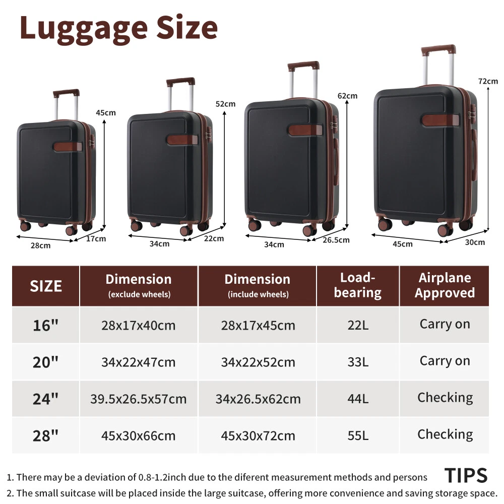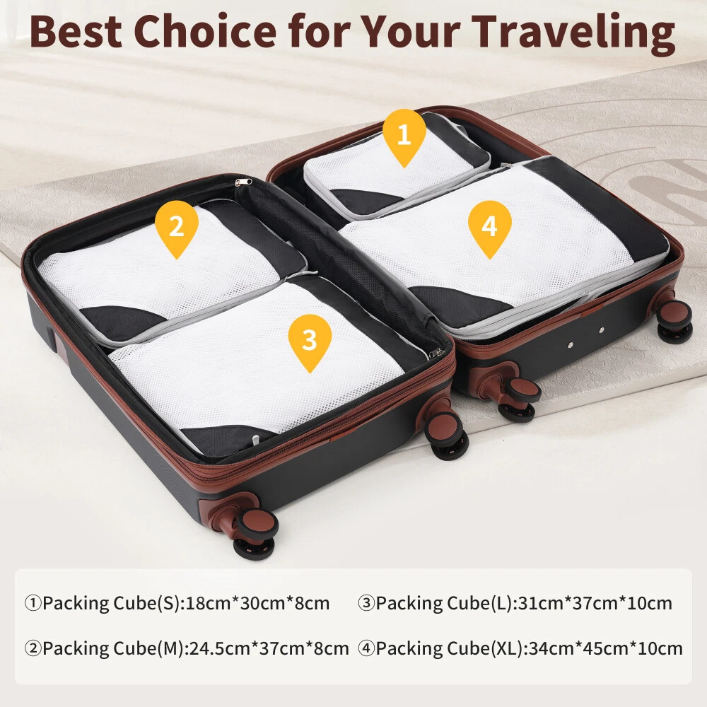 4 Piece Luggage Set with Compression Packing Cubes for Suitcase Expanable Spinner Wheels Lightweight Suitcase with TSA Lock 16 IN+20IN+24IN+28IN Product Features [Suitable Luggage Set] Luggage set includes 4 suitcases-16"+20"+24"+28"and 4 compression packing cubes for suitcase, enjoy a matching small and large luggage to travel with together or separately depending on how much you decide to bring with you on your trip. [Feather Weight Construction] Keep your load as lightweight as possible while traveling with our luggage pieces manufactured with feather light ABS material formulated for high durability while not weighing the luggage down. [Safeguard 3-Digit Lock] Rest easy while traveling and know that your belongings are under safe keeping with the built in customizable 3-digit lock that keeps out potential thieves when you aren't with your luggage. [360° Spinner Wheels] Each luggage is fitted with quad smooth-glide base 360 degree swivel spinner wheels for easy transportation through terminals, on concrete, cobblestone and more. [Spacious & Organized Packing] The 24"& 28" suitcases feature a built-in expandable feature, allowing you to increase packing space by 25%. The luggage interior also features elastic cross over straps and mesh pockets for easy organization. [Lightweight Travel Accessories ]: Super light fabric of compression packing cubes ensure packing your clothes neatly in luggage without adding extra weight. Great for when you want to minimize weight as much as possible and save space within your suitcase. [Luggage Size-included accessories]: 16 IN luggage dimensions:11"x6.7"x17.7"; 20 IN luggage dimensions: 13.2"x8.7"x20.4";24 IN luggage dimensions:15.6"x10.4"x24.4";28 IN luggage dimensions:17.7"x11.6"x28.3". Description We have perfected our hard case luggage collections, with high quality material molded body coveted. Instructions for Reset the combination lock 1.The lock is Pre set to 0-0-0; 2. Push the button on the broadside, while in this position, set each number to your preference; 3. Release the button and your combination is now set; 4.Take care when setting the numbers to not release the button while setting it.