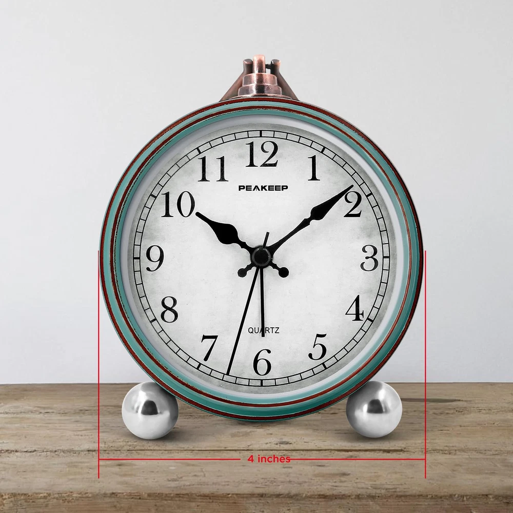 This vintage alarm clock is 4 inches in diameter, metal frame antique design will add funky decorative feel to your bedroom, bedside, bookcase, TV table, fireplace mantle etc. Quartz analog clock offers a very silent non-ticking movement and accurate time. This bedside alarm clock has a beep noise that starts out at pace and progressively get faster and louder in 4 stages. A big alarm switch ensures you turn the alarm on/off easily. There's a button in the back to press and hold to turn the light on, so it's not using up battery juice keeping it lit all the time - only when needed. It’s an easy basic battery operated alarm clock, run by 1 AA battery (not included), easy for elderly and .