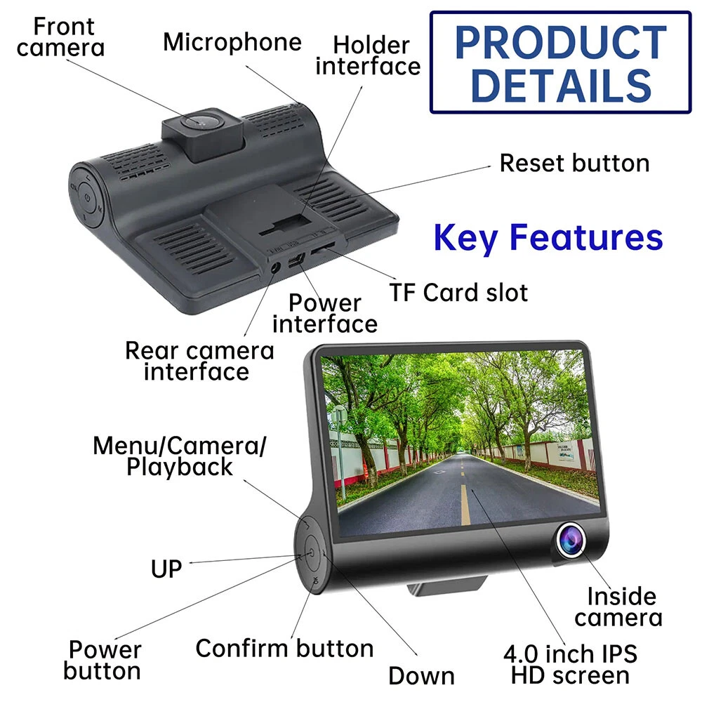 Features: * 3 Lens Camera Dash Cam: The car DVR camera has 3 lens to record, the front camera is Full HD 960P, the rearview camera and the inside camera is 480P, can record anywhere around your car and inside of your car. The best dash cam Supports “Picture in Picture” * Smart G-Sensor: Motion Detection and Parking Monitoring systems will automatic detect ignition/motion/crash/vibration. G-Sensor will keep the important fragment recorded by G-sensor in your Micro SD Card, but not overwrite them by the Loop Recording system. Parking Mode triggered by the G-sensor can be considered as a sentry, recording any motion and significant impact happen around your car when you leave. * FULL HD 960P & Superior night vision dash cam: Dash cameras for cars have Full-HD video resolution 1920X1080, using H.264 photography compression technology and Smooth Image Processing. Crystal clear full high definition video quality, high video quality even when driving at night. * Loop Recording: It supports up to 32GB of TF memory cards when the storage space is full, this dash cam will automatically cover the earlier segment. With Loop Recording enabled, you will never worry about buying an additional card when capacity is full (TF card not included in the package) Item Specifics: Material: ABS Colour: Black Product Size: 4 Inches Pixels: 960P/480p Support TF card: 8-32G Product Size: (20x11.5x7) CM Weight: 400G Built-in Lithium Battery Capacity: 200MAH Front Wide Angle: 170° Car Wide Angle: 120° Reversing Wide Angle: 140° Loop Recording: Support Package Including: 4'' Dual Lens Dash CamX1 Car Power SupplyX1 Rear CameraX1 Extension CableX1 Sucker*1 User Manual*1 Notice: 1. TF card is needed but is NOT included in the package. 2. When the memory is full, the machine will delete the earliest video files, retain the latest video files.