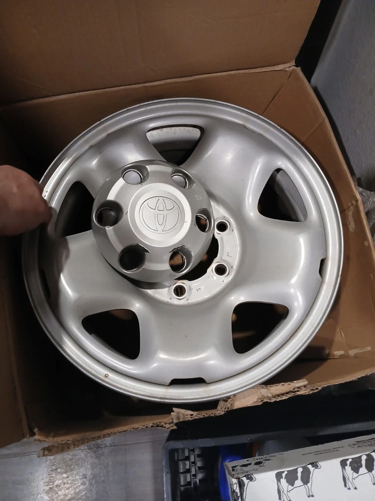 Elevate your vehicle's aesthetics and performance with this set of four authentic Toyota Tacoma steel wheels, complete with lug caps. These 16-inch rims feature a classic 5-spoke design, a durable one-piece cast construction, and a sleek silver painted finish that complements any exterior color. The wheels have a rim diameter of 16 inches and a width of 7 inches, ensuring a perfect fit for your Tacoma or any compatible model.With a bolt pattern of 6x139.7mm (6 x 5.5 inches) and a hub bore of 106 mm, these rims are designed for a seamless integration with your vehicle. The set includes wheel center caps to keep your wheels looking sharp and protected. Note that these wheels are factory original OEM parts, not replicas, and they come without a manufacturer warranty.