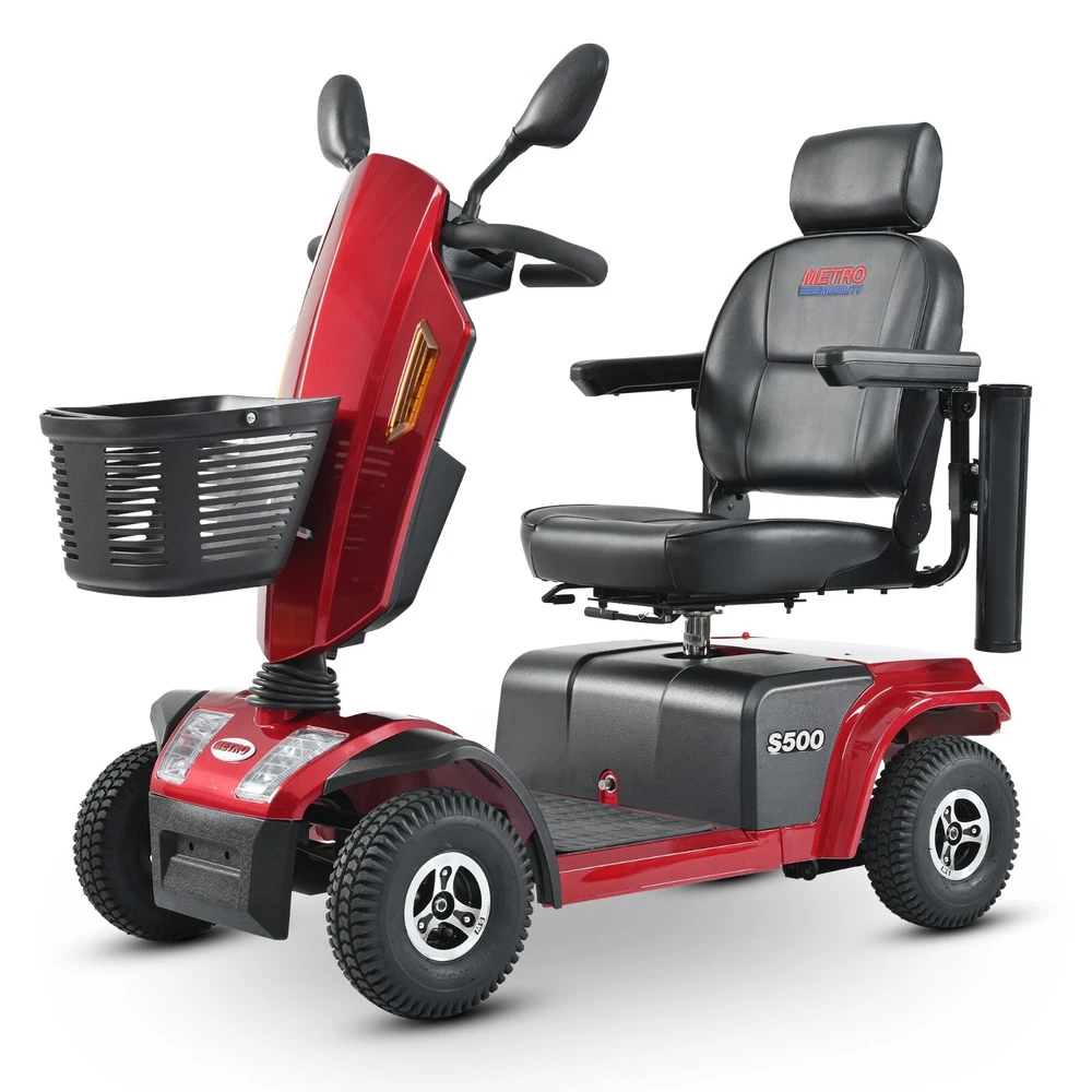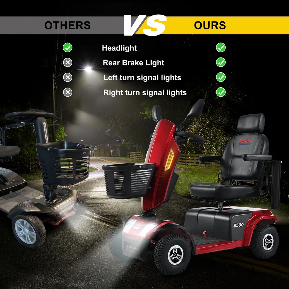 4 Wheels Electric Mobility Scooter Heavy Duty All Terrain 500W 52AH Red w/Basket New arrival Luxury Comfortable mobility scooter! Enjoy an cozy and relaxing ride on it! We have after-sale service in US, you can dial hotline number on manul book when need help Please be noted that this product comes in an extra large package,can only be transited and delivered by truck delivery,which requires accurate recipient phone number to well deliver. This large package takes longer to arrive . Product Features 1. Full-function lights: headlights, left and right turn signals, rear brake lights, double flashes 2. Plenty of storage space: front and rear baskets, 2 cup holders 3. The leg space is spacious and comfortable even when driving for a long time. 4. Convenient USB charging port 5. Front and rear 10-inch pneumatic tires and aluminum alloy wheels for comfortable driving 6. Large-capacity battery, supporting driving range up to 28 miles 7. Thoughtful cane storage stand 8. Front and rear suspension shock-absorbing design makes driving more smooth and comfortable 9. Comfortable seat with headrest. Can move forward and backward, rotate 360°. It has armrests that can be flipped up. 10. Powerful 500W motor, maximum forwarding speed: 8mph, maximum climbing grade of 12 degrees 11. Load capacity: 350 lbs. 12. Rearview mirror provides a safer driving experience 13. Intelligent electromagnetic brake 14.LCD electronic screen: display speed/temperature/battery 15. Simple control panel, easy to operate with fingertips or thumbs Product Specific s Model S500 Length 128 cm=50.39 inch Rear Width 62 cm=12.6 inch Height 99 cm=38.98 inch Max. User Weight 160 kg = 350 lbs Battery Capacity Lead-acid 24V52AH ( 12V/52AH ×2PCs) Max Safe Slope 8 degrees Turn Radius 2006mm =78.98 inch Seat - Base Height 67 cm=26.38 inch Max Speed 12km/h (8mph) Wheel Diameter Front 254mm × 88.9mm 10 ’’ × 3.5 ’’ Wheel Diameter Rear 254mm × 88.9mm 10 ’’ × 3.5 ’’ Charger Off-Board 5A Range 40±5km (24±3Miles) Overall Weight 105kg = 232lbs Seat Weight 12.15kg =26.79 lbs Front Basket Weight 0.9kg =1.98 lbs Ground Clearance 105mm =4.13 inch Controller 24V/90A Motor 500W Category Classification A.1.4 To Prevent Electric Shock Internal power class Category Classification To Prevent Electric Shock B class Classification Of The Degree Of Water Resistance IPX4 Safety Degree When Exposed To Flammable Gas Conditions Not AP/APG Classification Of Operation Continuous operation Volts Of The Mobility Scooter Power 24VDC ( 2 units ) Type Of Power D.C.24V One-year limited warranty Drivetrain parts (transaxle, motor and brake), all electrical parts, including controllers and battery chargers are covered for one year under warranty. Any attempt to open or dismantle these parts will lead to this warranty being void. Half year limited warranty Batteries are covered by a six-month warranty from the original manufacturer. Not covered under warranty The following are classed as wear items, which may, under normal wear and tear, require replacing. The items that are not covered under warranty include tires, seat belts, bulbs, upholstery, plastic shrouds, motor brushes, and fuses. Warranty will also be refused if damage is deemed to have been caused through misuse or an accident for which Metro Mobility cannot be deemed responsible.