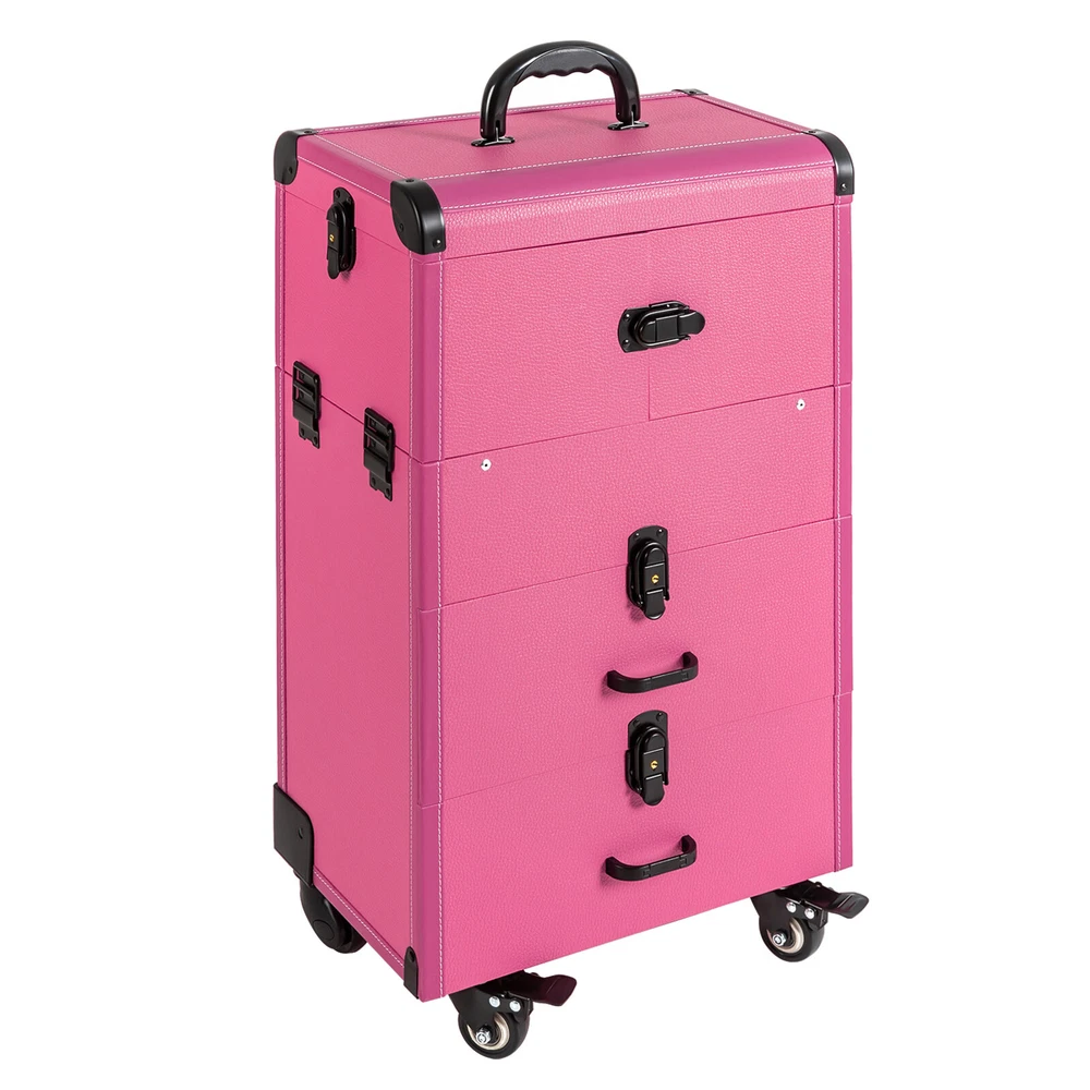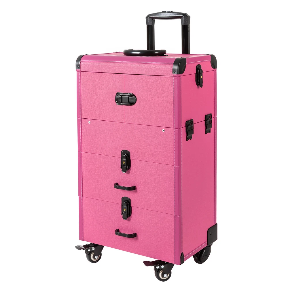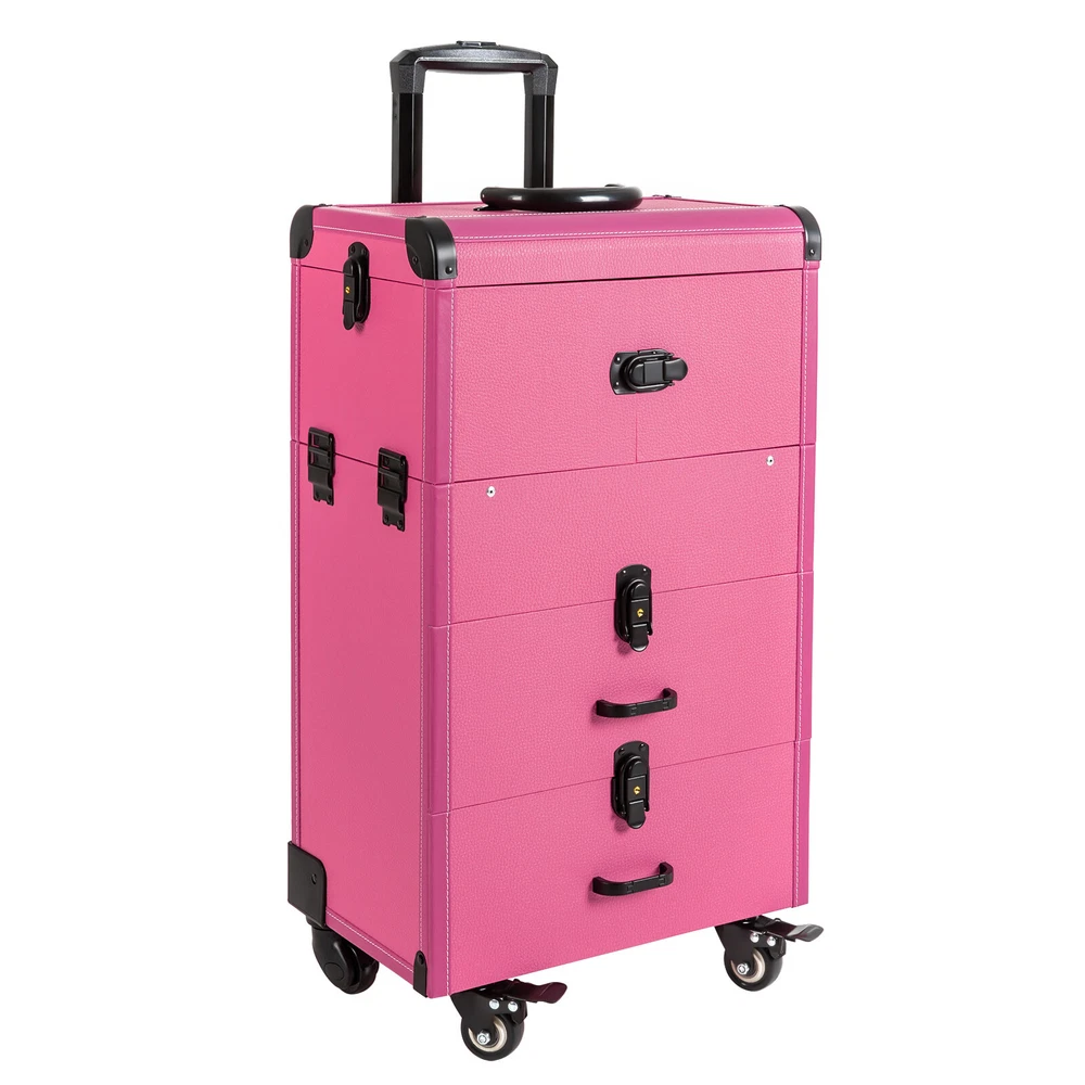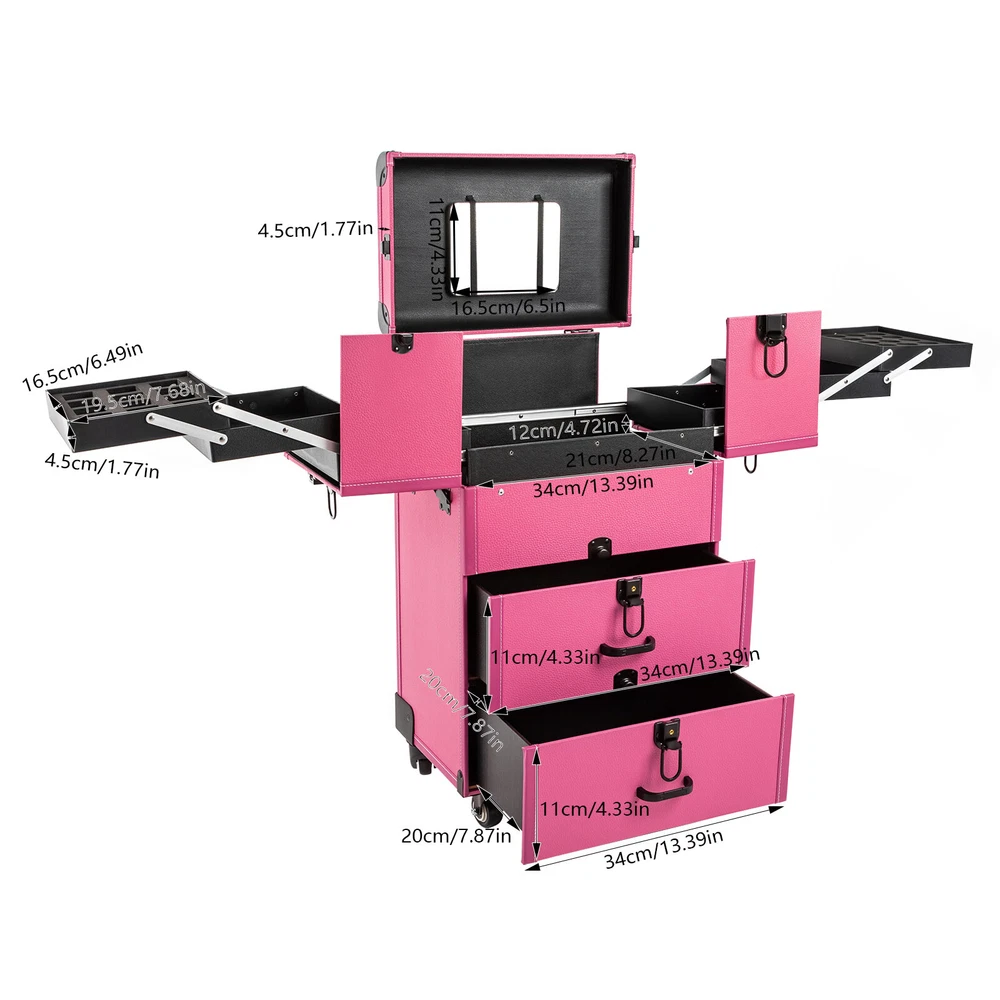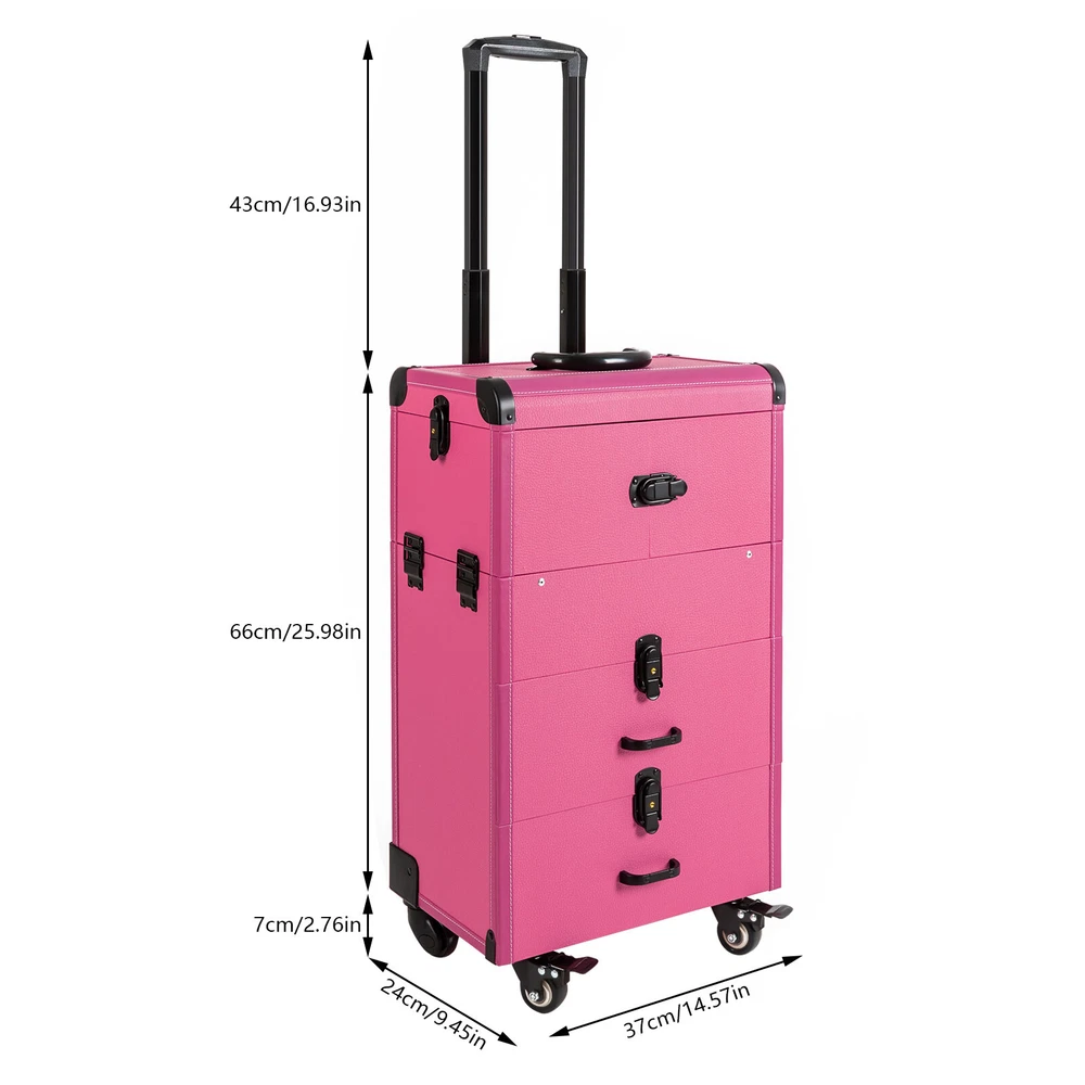 4 in 1 Rolling Zinc Alloy Makeup Train Case Salon Cosmetic Trolley Organizer Box Description If you are a make-up artist or embroiderer who often needs to go out to work, you will need our makeup train case. It is made of premium material, sturdy and durable. 4 universal wheels and a large capacity make it an excellent makeup assistant when outgoing. With its beautiful appearance, it is an ideal gift for your mother, sister, or wife. In addition, locks and latches can ensure high safety, so you can use this item confidently. Key Features Long Service Life: High-quality wood board and PVC make this product anti-corrosion, waterproof, and rustproof and not easily deform, thus ensuring a long service life. Easy to Move & Carry: The 4 universal wheels(2 with brakes) ensure silent and smooth rolling and you can fix it stably. With the practical pull rod and comfortable handle, you can carry this product with less effort. Large Capacity: 4 retractable trays on the top, a large space in the middle, and 2 large drawers at the bottom can provide enough storage space for various cosmetics and makeup tools, such as foundation, eye shadow, blush powder, skin care products, sprays, hair tools. Neat Storage: With different partitions, you can arrange cosmetics in an orderly manner, saving the countertop space and saving time searching for cosmetics, giving your dressing table a new look. Excellent Load-bearing Capacity: The premium materials and rectangular structure provide the make-up case with a maximum weight-bearing capacity of about 110.23 lbs. You can place all kinds of hairdressing and beauty tools on it with confidence. Ready to Use: You can use this product without tedious assembly after receiving it, which saves you time and energy. Stylish Appearance: The rectangular frame, beautiful rose color, and anti-scratch diamond patterns give this product a stylish look, which is a brilliant view when you are carrying it outside. Thoughtful Design: The clear and bright makeup mirror in the case is convenient for you to create the ideal makeup look. The EVA partition can protect your cosmetics from being damaged and allow for neat storage. Ideal Gift: Its exquisite design and large capacity make this product a great gift to your mother, girlfriend, sisters, wife and loved ones so that they can enjoy more convenient makeup time. Protective Shipping: To prevent the product from being damaged and bumped during transportation, we fill the package with an anti-collision sponge to protect your products to the maximum extent possible. Customer Service: We aim to provide quality products and services. If you have any problems, please feel free to contact us. We will reply and solve the problem for you as soon as possible. Details Zinc Alloy Corner Wrap: The zinc alloy corner wrap with a round design can not only protect your case from impact but also better care for your skin. Locks and Latch: They are solid and durable to effectively protect the inside items from loss. Application Professional makeup artists, hairdressers, beauticians, manicurists, beauty lovers, etc. can use this product to store cosmetics and makeup tools. It is ideal for makeup contests, wedding makeup scenarios, travel makeup, outdoor shooting, cinemas, dressing rooms, crew, tourism, beauty salons, and more. How to Lock 1. Lift the steel ring. 2. Press the lock plate. 3. Insert the key. 4. Turn clockwise to lock it, and turn counterclockwise to open it. 5. The case is locked. Specification Color: Rose Shape: Rectangular Material: Zinc Alloy, Wood Board, PVC, EVA Style: Modern Assembly Required: 1 Number of Items: 1 Mounting Type: Free Standing Overall Load-bearing Capacity: About 50kg/110.23 lbs Wheel Height: 7cm/2.76in Overall Product Size: 37*24*66cm/14.57*9.45*25.98in Pull Rod Length: 43cm/16.93in Mirror Size: 16.5*11cm/6.5*4.33in Each Tray Size: 19.5*16.5*4.5cm/7.68*4.69*1.77in Middle Space Size: 34*21*12cm/13.39*8.27*4.72in Each Drawer Size: 34*20*11cm/13.39*7.87*4.33in Package Size: 42*32*72cm/16.54*12.6*28.35in Net Weight: 9.8kg/21.61 lbs Gross Weight: 12kg/26.46 lbs Package Included 1 x Makeup Train Case 2 x Keys Notes 1. The service wear of the case is a normal phenomenon. In the process of daily use, please try to avoid excessive impact and drop to extend the lifespan of the product. 2. Please use soft tools and water to clean. Please keep away from corrosive liquids. Please avoid long-term exposure to the sun. 3. Please clear the wheels in time to maintain smooth movement. 4. Please allow the slight color difference caused by the shooting light and the 1-3cm error due to manual measurement. Please make sure you do not mind before you order. Payment Delivery details Terms of sales About us Contact us Payment We accept ebay payment ă Fees such as import duties, taxes are not included in the item price or shipping costs. These charges are the buyer's responsibility. Delivery details Shipping: 2-9 working days to: USA Terms of sales We maintain high standards of excellence and strive for hundred percent customer satisfaction. Feedback is very important to us. We hope that you contact us immediately before you give neutral or negative feedback, so that we can address your concerns. It is impossible to address issues if we do not know about them! About us Your satis faction is our ultimate goal. We work hard to earn your trust and future business. Our certified technicians have tested each item before shipping. The unit comes with 1 year limited warranty on all manufacturing defects. a) If you receive a defective item, you may return it or ask for a discount. Please contact us within 14 days after you receive the package. b) What you returned must be intact and in its original packaging as re? u. Customer is responsible for shipping costs of the returned item. c) We will cover the cost of shipping back t with the shipping rate indicated in the registration page. We will send you a new unit or refund the full payment you paid. Tha