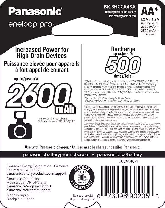 Power your devices with these high-capacity rechargeable batteries from Panasonic. With a capacity of 2600ah and a voltage of 1.2V, these AA batteries are perfect for use in both high and low drain devices, as well as solar or wind devices. Made of high-capacity NiMH and featuring a long-lasting charge, these batteries will keep your devices running longer. These batteries are ideal for anyone looking for a reliable and long-lasting power source. Whether you're using them in your favorite electronics or powering your solar panels, these batteries will get the job done. Order now and never worry about running out of batteries again!