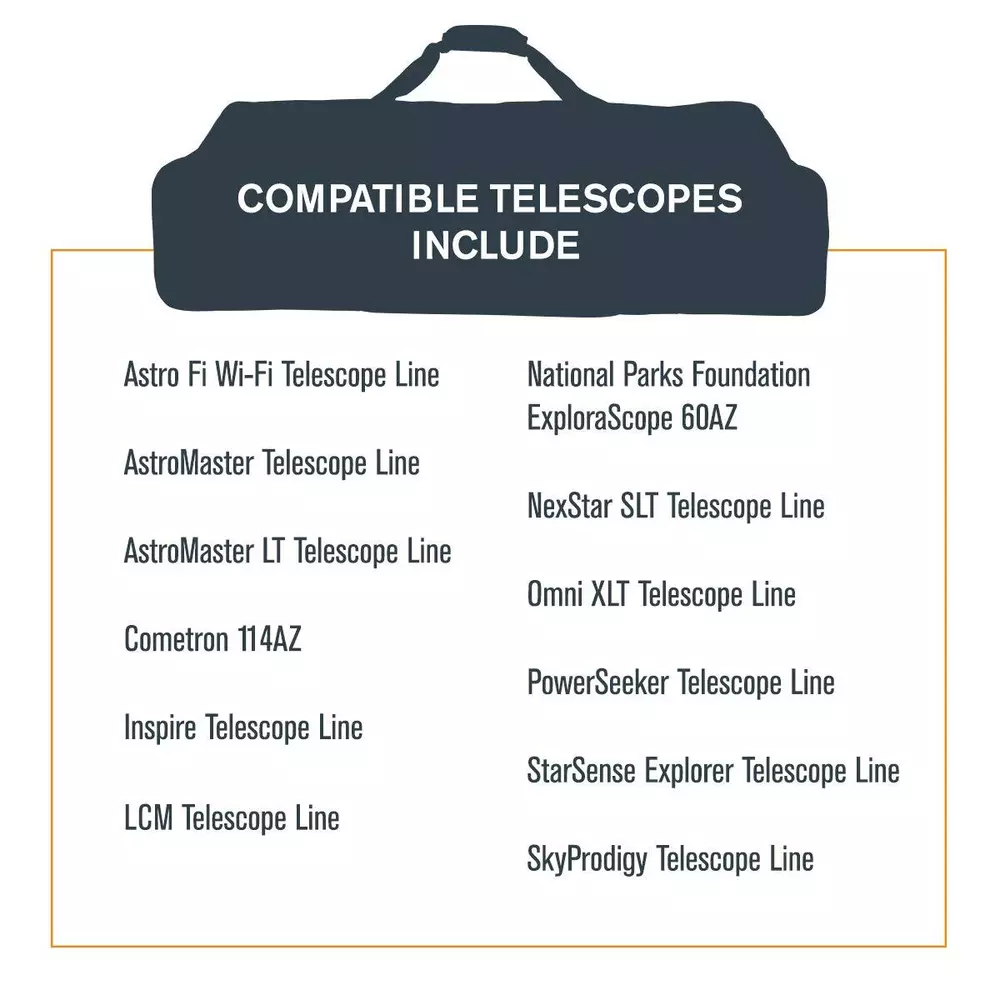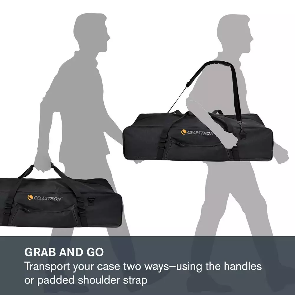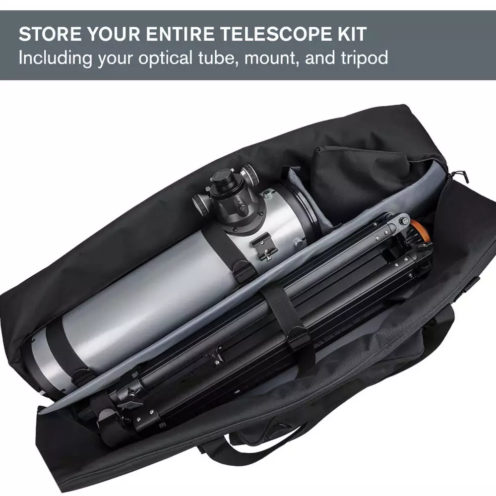The 40-inch telescope bag stores your telescope’s optical tube, mount, tripod, and accessories. Lighten your load with this sleek, padded, protective telescope soft bag. An all-in-one storage solution, it’s the perfect choice for safely transporting your equipment anywhere with ease and confidence. The bag is made with ultra-durable material to offer superior protection from the elements. The interior walls are lined with 16mm thick EPE foam to protect your gear and have internal straps to hold your equipment in place. Transport your bag one of two ways: via the pair of sewn-in handles or the optional clip-in padded shoulder strap for hands-free carrying. Utilize the external accessory pocket for your eyepiece, adapters, and power packs along with the sewn-on fabric loops on the outside of the bag if you want to clip even more accessories to the exterior of the case. This custom-made optical tube bag is truly a must-have for the telescope owners of all stripes. PROTECT & STORE YOUR TELESCOPE: This sturdy, portable, grab-and-go bag keeps your optical tube, mount, and tripod safe during travel and storage. ULTRA DURABLE MATERIAL: 900 denier outer and super smooth inner polyester layers, with 16mm thick EPE foam sheets to create a protective barrier for your equipment. WATER RESISTANT: A PVC-reinforced hard bottom panel provides extra protection from the elements and minor bumps. CONVENIENT DESIGN: Choose from two access points to access or remove your optical tube. Transport your bag over the shoulder or by the handles. ACCESSORY STORAGE: Stash accessories in the external zippered pocket or the bonus padded accessory bag. UNBEATABLE WARRANTY AND CUSTOMER SUPPORT: Buy with confidence from the world’s #1 telescope brand, based in California since 1960. You’ll also receive a two-year warranty and unlimited access to technical support from our team of US-based experts.