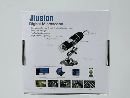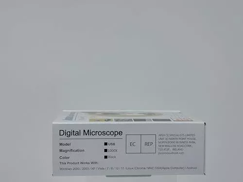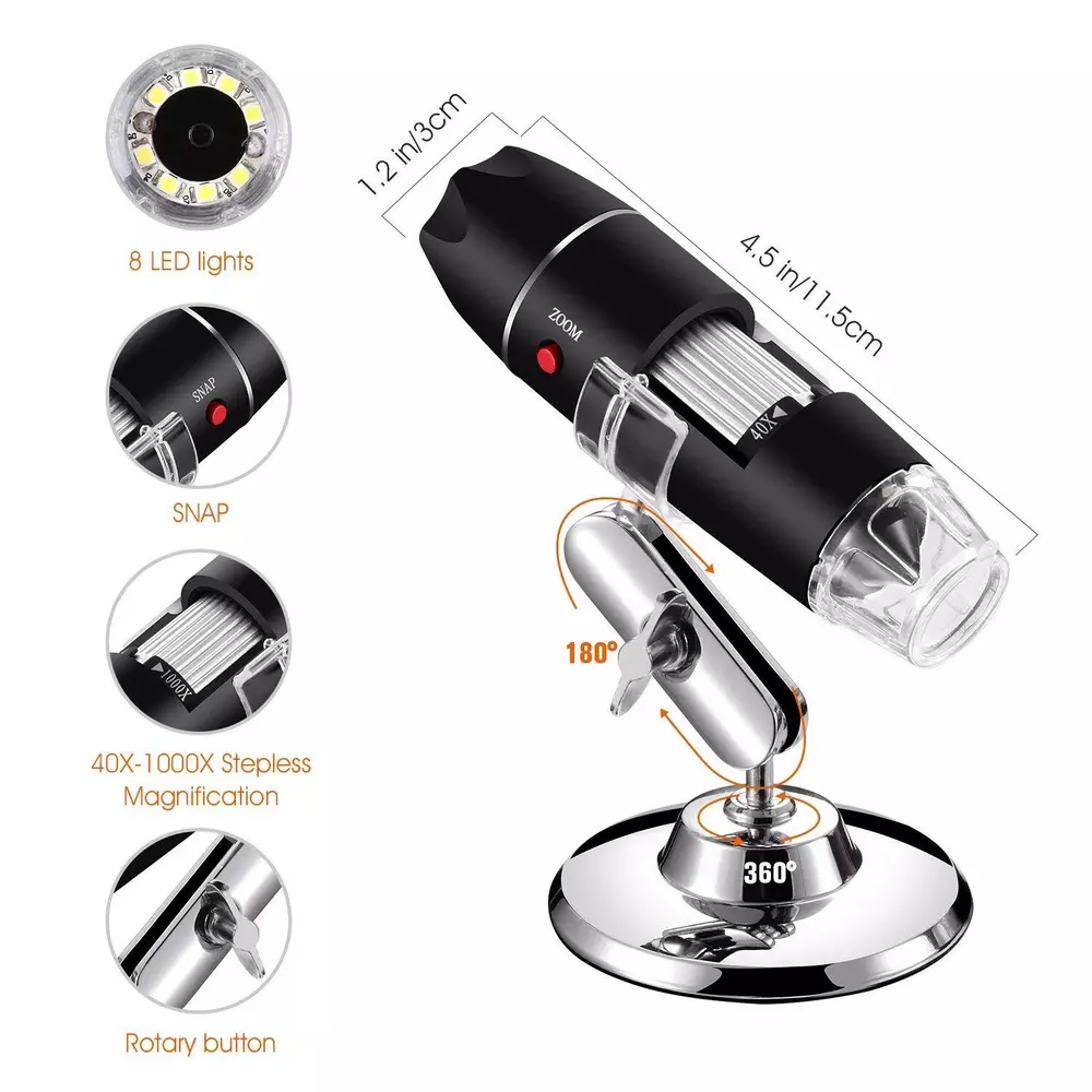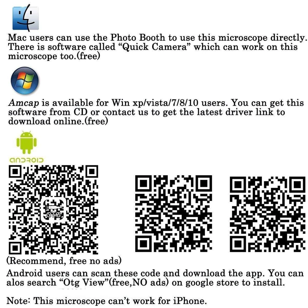 Note: Focus Wheel can be used on ALL devices. But SNAP and ZOOM button can only be recognized on Windows system as the software was written by our company, and android APP (mac system doesn’t need software) is common in the market so it can’t recognize the SNAP and ZOOM command. Window User Amcap is a professional window software designed for window xp/vista/7/8/10/11. You can get the package from CD or contract us for the downloading link. Mac User Mac users can use the Photo Booth to use this microscope directly. There is software called “Quick Camera” which can work on this microscope too. Android User Please scan the code above or search “OTG Viewer” on google play to get the app installation. Chrome OS This microscopes can be used with the default Camera app that comes with Chrome. Linux Raspberry Pi: Working with the current version of Raspbian Jessie. Parameters: Focus Range: from 1mm to 90mm Frame Rate: Max 30f/s under 600 Lux Brightness Magnification Ratio: 40x to 1000x Video format: AVI Photo format: JPEG or BMP Light source: 8 LED (adjustable by control wheel) PC interface: USB2.0 Power source: 5V DC from USB port Compatible with: Windows 7 8 10 11/Vista/XP/2000, Mac OS X 10.5 or above, some of Android mobiles, Linux, Chrome(not supported for iPhone/iPad) Bundle software: CoolingTech with measurement & calibration function System Requirement Pentium Computer with 700M Hz &Above, 20M HD Space CD ROM Measure Tool: Micro-Measure (It can measure Length and diameters, angle, the perimeter, area, etc on Windows) Color: Black Package including: 1x USB/MicroUSB 2in1 Microscope 1x Type C adapter 1x Metal Tripod 1x CD Driver 1x Ruler 1x Instruction portable magnification is a useful and funny microscope for students, engineers, inventors, and others who need to magnify and explore the micro things. Be compatible with Mac, Windows XP Vista 7 8 10 11, Linux and Chrome OS. This microscope isn't compatible with iPhone/iPad. This magnification only support Android smartphone which has OTG function.(How to Check OTG? Download the free app”USB OTG Checker”) Built-in 8 LED lights, digital microscope’s 2 adjusting knob can change the focus and brightness. Connected to the devices, you can use the software to record the micro world, capture screenshot and record video. Besides you can use the Windows software’s measurement function to measure the least bit.