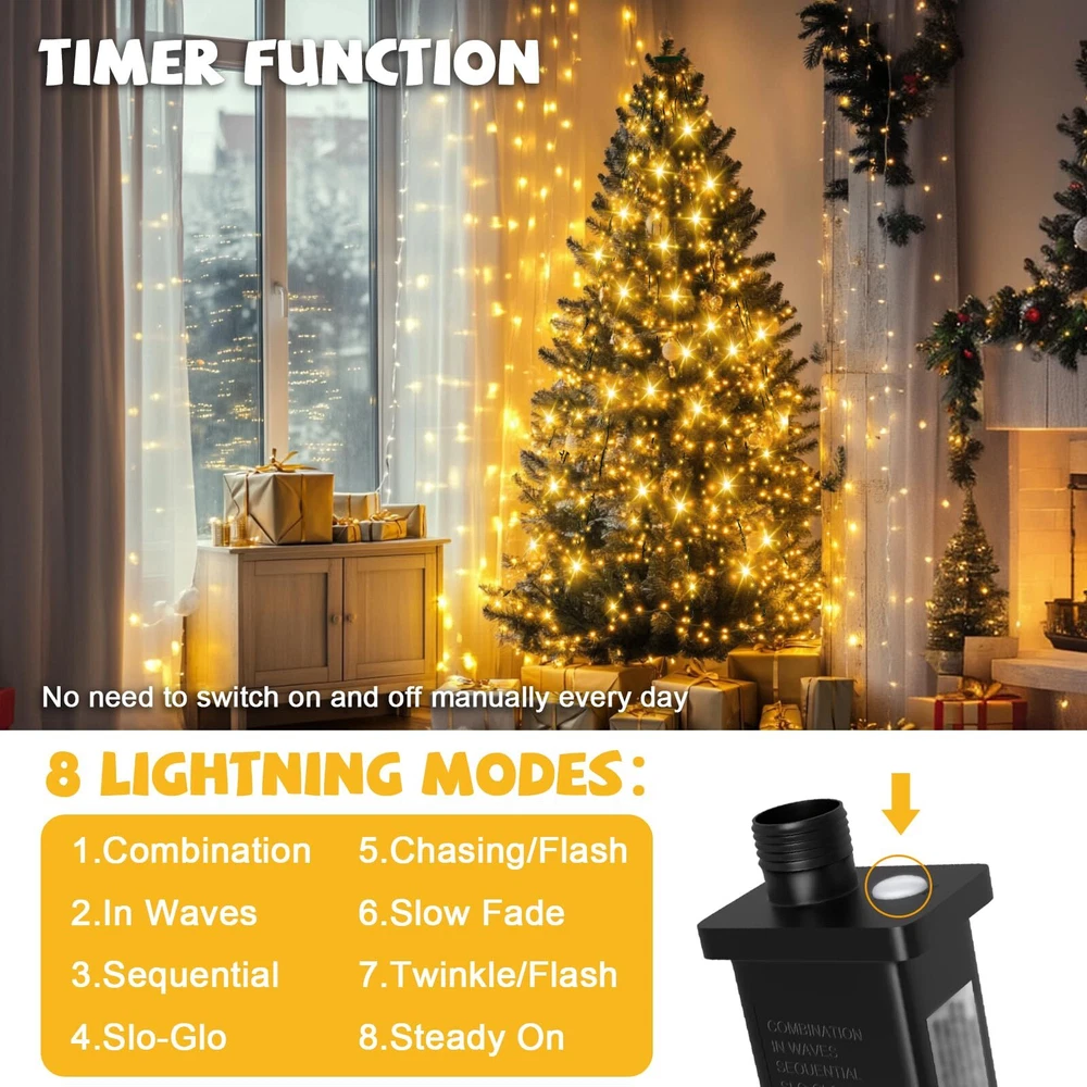 đăChristmas Tree Lightsă16 light strings, 400 light beads, specially designed for Christmas trees 3.3-6.6Ft high. The dark green line has good concealment, making it an ideal choice for decorating indoor and outdoor Christmas trees đăHow to UseăHang the disc on the top of the tree, then untie the string of lights one by one and hide them in the branches. The bright and warm lights can make the Christmas tree shine and move at night đăTimer Functionă6 hours on 18 hours off, automatically cycle the process, saving energy. Long press the button on the plug for 3 seconds until the button turns green, that is to start the timer mode đă8 ModesăOur Christmas tree lights come with 8 light modes: blinking, constant light and so on, short press the button on the plug to switch as you like đăIP44 WaterproofăWrapped in insulating material, rainproof, snowproof and windproof, excellent for outdoor use. Please note: The adapter is not waterproof, please keep it dry đăWhat You Getă400 LEDs Christmas tree lights x 1, US plug x 1, instructions manual x 1. If there is any problem, please leave a message to our backstage at the first time, we will give you a satisfactory solution