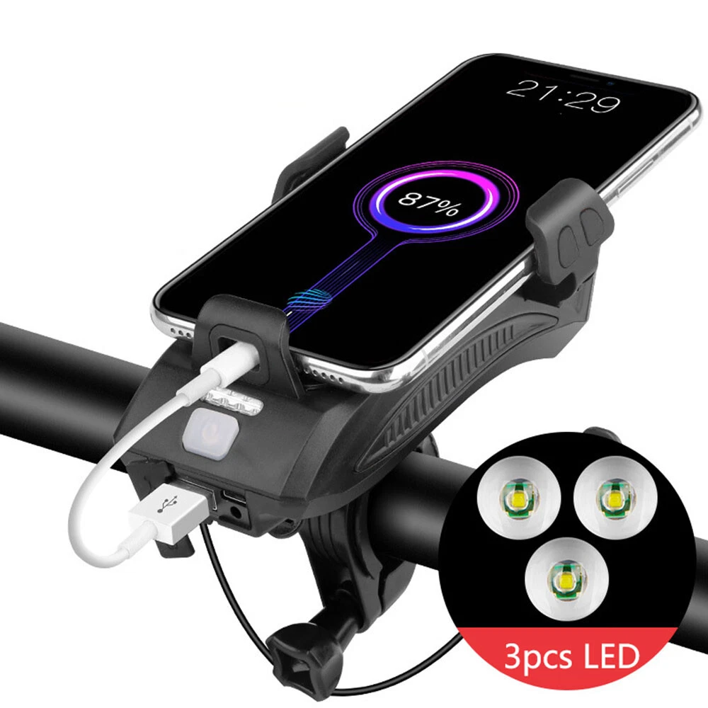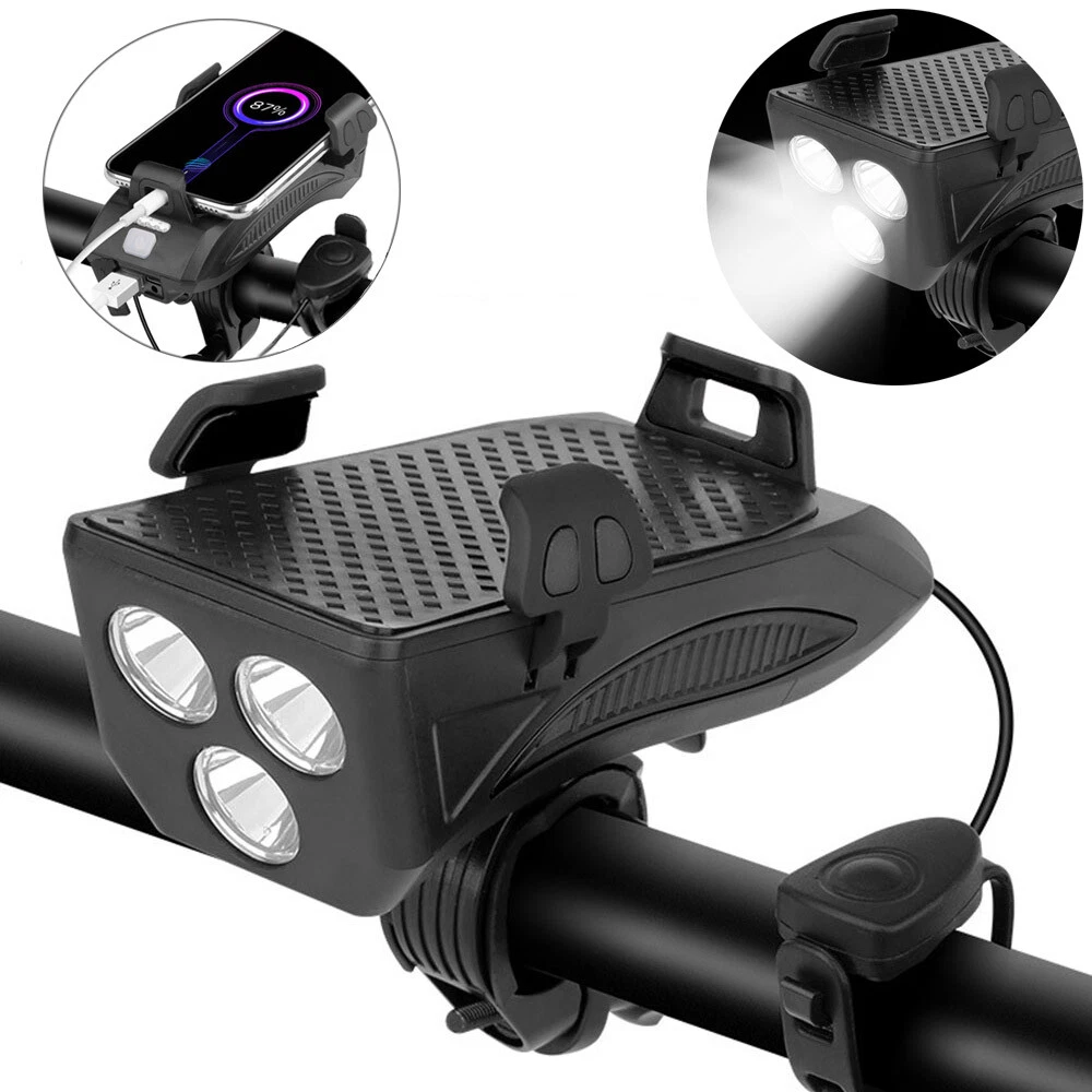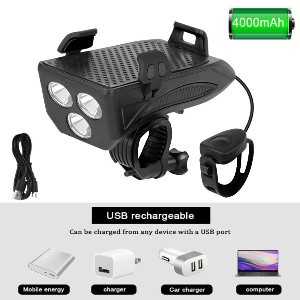 Product Description 【USB Rechargeable&Power Bank】 Built-in High-capacity 4000mAh rechargeable batteries. It only takes 2 hours to fully charge with an extra-long run time. USB bike light can also charge your mobile phone or provide lighting, Even if you are outdoors, you no longer have to worry about your phone running out of power or being dark. 【3 LED Beads & 3 Modes】 The Bike Headlight is equipped with 3 professional LED lamp beads adopt German advanced technology produces ultra bright light which making your bike stand out. Features 3 lighting modes (High,Low,Flash) for choosing according to your needs. Enhance the safety during night riding. 【Waterproof-Rainproof-Anti-Snow】 Made of premium material, it has excellent impact resistance, heat dissipation and corrosion resistance. Waterproof bike headlight against splashing water from any angle. 【Multi-Functional】 This LED bike light set is versatile enough for cycling, hiking, camping, or any outdoor activity and can be used as phone holder, emergency flashlight and powerbank. And built-in horn with 5 sound modes, the highest decibel can reach 130dB, you can easily press the button to warn others in an emergency. Note:As phone holder, adjustable width(55-90mm), suitable for most mobile phones(4-6.5 inch) Specification: Color:Black Material: ABS Size: width 60MM* length 120MM Chuck range: 50-80MM (4-6.3 inch mobile phone) Charging type: USB charging Charging time: 5 hours Battery capacity: 4000mAh Output voltage / current: 0.8A Headlight brightness: 40000LM Lamp type: LED lamp beads *3 Speaker decibel: 130 decibels Sound mode: 5 sound modes Mobile phone size requirements: 4-6.3 inch mobile phone Packing List: 1x Bike Headlight
