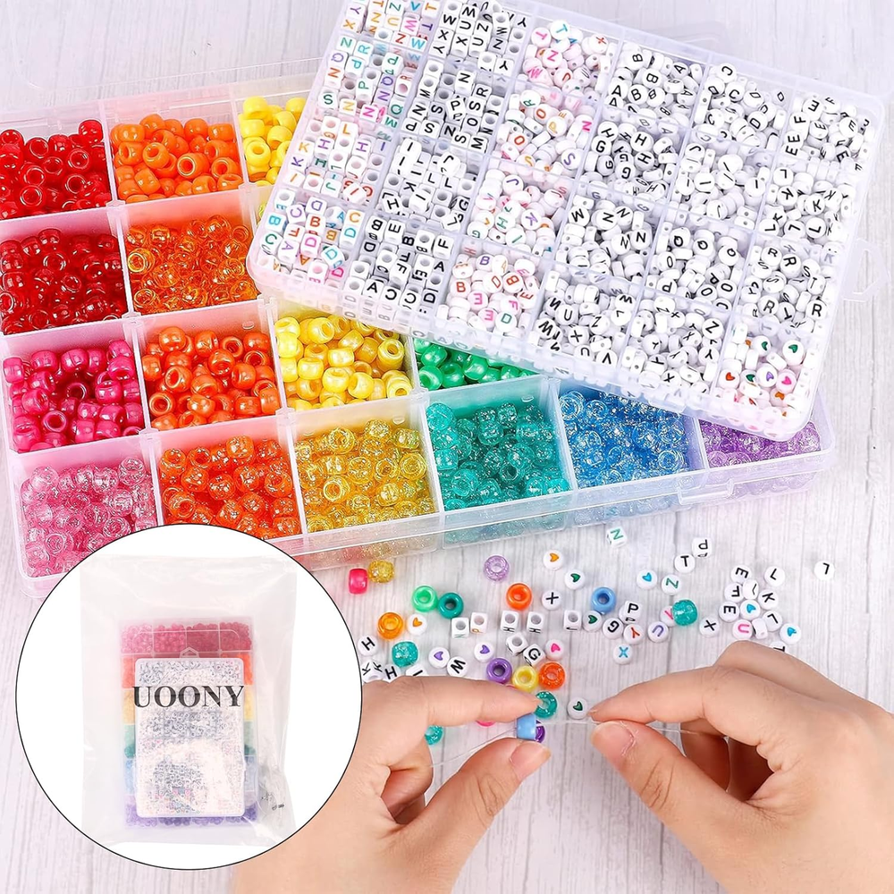 【Package contains】Each package contains 2 boxes, 20m crystal string and 30m elastic string. The large box contains 2400pcs rainbow pony beads. These colorful beads have 6 colors: red, orange, yellow, green, blue, violet and 4 styles: solid color, pearl color, transparent color, sparkle color. The small box contains 1600pcs letter beads in 5 styles. 【Quantity & size】The pony beads bulk has 4000pcs beads in total. Rainbow kandi beads are 69mm and about 100pcs per color. Flat round letter beads are 4x7mm, contain 280pcs colored flat roung letter beads and 770pcs black flat round letter beads. Square letter beads are 6x6mm, contain 240pcs colored square letter beads and 240pcs black square letter beads. The pony beads kit also contains 70pcs colored flat round heart beads. 【Well packaged】The kandi beads kit and letter beads are placed in two storage boxes with 24 separate grids. These craft beads will not be mixed together even if they are shaken. In addition, these boxes can be used to store other things besides beads. 【Widely used】The pony beads kit can be used to make jewelry bracelet necklaces, couple souvenirs, pet collars, key rings or hang anywhere as a special mark of the name to make your life more meaningful and becomes a special self. It is especially suitable for all beads threading in the existing combination with 20m crystal cord and 30m elastic string. 【Notice】The plastic beads are made of premium quality acrylic. No need to worry about quality, but children should use them with adult supervision and avoid getting into their mouth due to curiosity. Product Description Package Included 2400pcs rainbow pony beads 280pcs colored round letter beads 770pcs black round letter beads 240pcs colored square letter beads 240pcs black square letter beads 70pcs heart beads Size rainbow pony beads: 6*9mm flat round letter beads: 4*7mm square letter beads: 6*6mm 20m crystal cord and 30m elastic string Wide Usage A perfect DIY beads set for craft, making friendship bracelets, name necklaces, rings, hair braids, etc. This is the ideal holiday or birthday present for children.