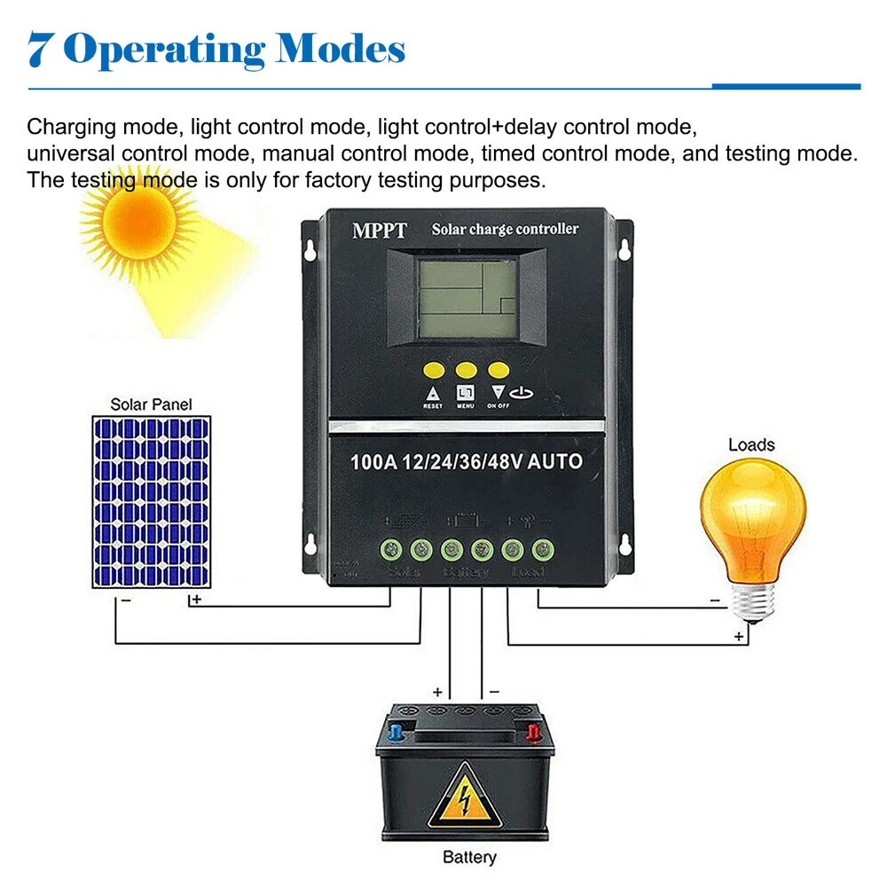 Product Description Features: - LCD Liquid Crystal Display: Large LCD display, support battery working status display, solar panel working status display, mode control display, load output status and each parameter display, normal and fault status display. - 7 Operation Modes: Charging mode, light control mode, light control + time delay control mode, general control mode, manual control mode, timing control mode and test mode, the test mode is only for factory test use. - 4 kinds of voltages automatic identification: It will automatic identify DC12V/24V, DC36V, DC48V by itself. - Large-section Wiring Port: use large-section, large-spacing wiring ports, can be installed 16mm wire, the wire spacing of 7mm increases the insulation performance and the reliability of installation, effectively reduces current and voltage drop while reducing losses. - Dual USB Charging Ports: The solar charge controller adopts a dual USB charging port design, which can charge two devices at the same time, and supports most of USB port devices, such as mobile phones, tablets, PSP game consoles, etc. - Thickened Aluminum Alloy Heat Sink: The MOS tube is used to lock the heat sink design, the heat dissipation is more uniform, and there is no fear of the temperature rise caused by the MOS tube, the powerful heat dissipation capacity can operate normally in the environment of 55 ℃, at the same time, it is equipped with functions to prevent overcharge, overvoltage, DC output low voltage, high voltage protection and reverse polarity protection, etc. Specification: Maximum charging current: 100A Maximum input voltage of photovoltaic panels: 15V-23V(12V), 30V-45V(24V), 45V-69V(36V), 60V-90V(48V) Maximum input power of photovoltaic panels: 1000W (12V), 2000W (24V), 3000W (36V), 4000W (48V) Output voltage: DC12V/24V/36V/48V; DC5V/1.5Ax2USB Support Battery: Lithium Battery & Lead Acid Battery Working temperature: -25℃~55℃ Cooling method: heat sink self-cooling Charging method: Focused MPPT modulation charging Working mode: seven Protection function: prevent overcharge, overvoltage/DC output low voltage, high voltage protection, reverse polarity protection, etc. Note : Please connect the battery to the controller first, and then the photovoltaic panel to ensure that the battery voltage is higher than (12V battery is higher than 10V; 24V battery is higher than 20V; 36V battery is higher than 30V; 48V battery is higher than 40V), otherwise it will cause voltage Identification error. Package Included: 1 x Solar Charge Controller 1 x Manual
