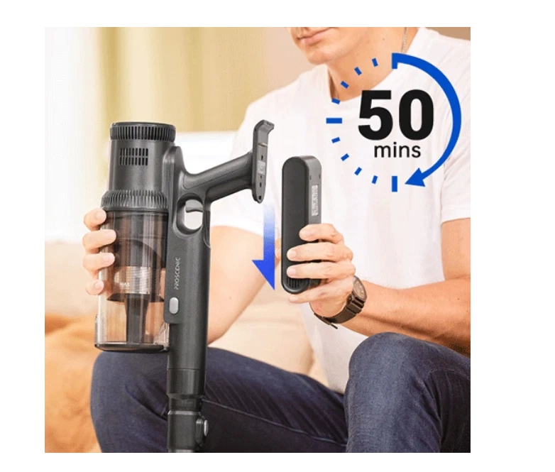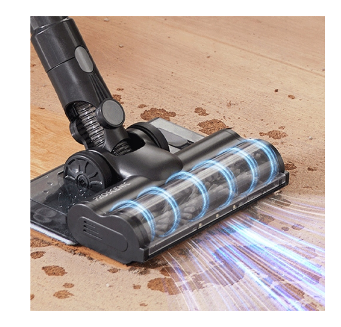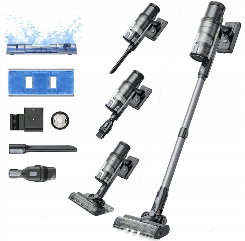 Cordless vacuum cleaner, 2 in 1, mopping engine power: 400 W suction power: up to 35,000 Pa noise level up to 78 dB battery capacity: 2000 mAh 3 operating modes dust container capacity: 0.65 l working time on full charge: up to 50 minutes working time in maximum mode: up to 5 minutes time required for full charging: approx. 3 hours filtration system: 5-stage LED touch screen Main brush LEDs Removable mopping head 2 in 1. Vacuuming and washing The 340ml water tank provides enough water to wash the entire floor, and the 180-degree rotating controls allow you to easily avoid obstacles and reach under furniture while cleaning. High power, quiet operation The powerful 400 W brushless motor provides a suction power of 35k Pa. It works great on carpets and other surfaces. It can handle animal hair and other types of dirt without any problems. Wireless, lightweight and flexible The vacuum cleaner can be easily transformed into a handy handheld vacuum cleaner. Simply unclip the telescopic tube and attach the required tip. Perfect for vacuuming hard floors, carpets, stairs, furniture or even your car. The vacuum cleaner is small, weighs about 1.5 kg, has an ergonomic design, and the shift in the center of gravity provides a feeling of lightness when holding the vacuum cleaner in your hand. That is why it is great for cleaning the entire house. Notifications, touch control The Proscenic P11 Mopping vacuum cleaner offers easier control. The vacuum cleaner has a built-in color LED display that shows information such as: battery charge level, selected power level, messages about possible errors (e.g. pulling a sock or wire into the tip) Change the power level with one touch. Fast charging and long-lasting battery Charging time is about 4-5 hours. It is equipped with 2000 mAh batteries. The battery life of P11 is increased by 50%, which can guarantee long-lasting battery life of up to 50 minutes. Main brush LED backlight Improved detection reflector system, effectively detect tiny particles invisible to the naked eye, helping you see dust more clearly. Multi-stage filtering system Five-stage filtration ensures almost perfect separation of pollutants from the exhaust air. The first stage is the cyclonic ionosphere which traps larger contaminants sucked in by the vacuum cleaner. The air then passes through a metal mesh. The next step is a cone filter that captures finer pollen and dust. The HEPA filter captures the smallest particles from the air, providing 99.99% filtration so that the exhaust air is fully filtered. The last stage is the sponge filter Flexible and rotating nozzle The brush head with front LED light for optimal visibility is rotatable and flexible, allowing the vacuum cleaner to be rotated 90 degrees forward and 180 degrees left and right. Cleaning can be done thoroughly. set contents: upright vacuum cleaner, telescopic tube, mopping container, mopping attachment, crevice nozzle, bristle nozzle, filter, wall mounting bracket, power supply, user manual *NOTE REGARDING BATTERY It is not recommended to completely discharge the battery, as this may damage it and make it impossible to use it further. EURO PLUG