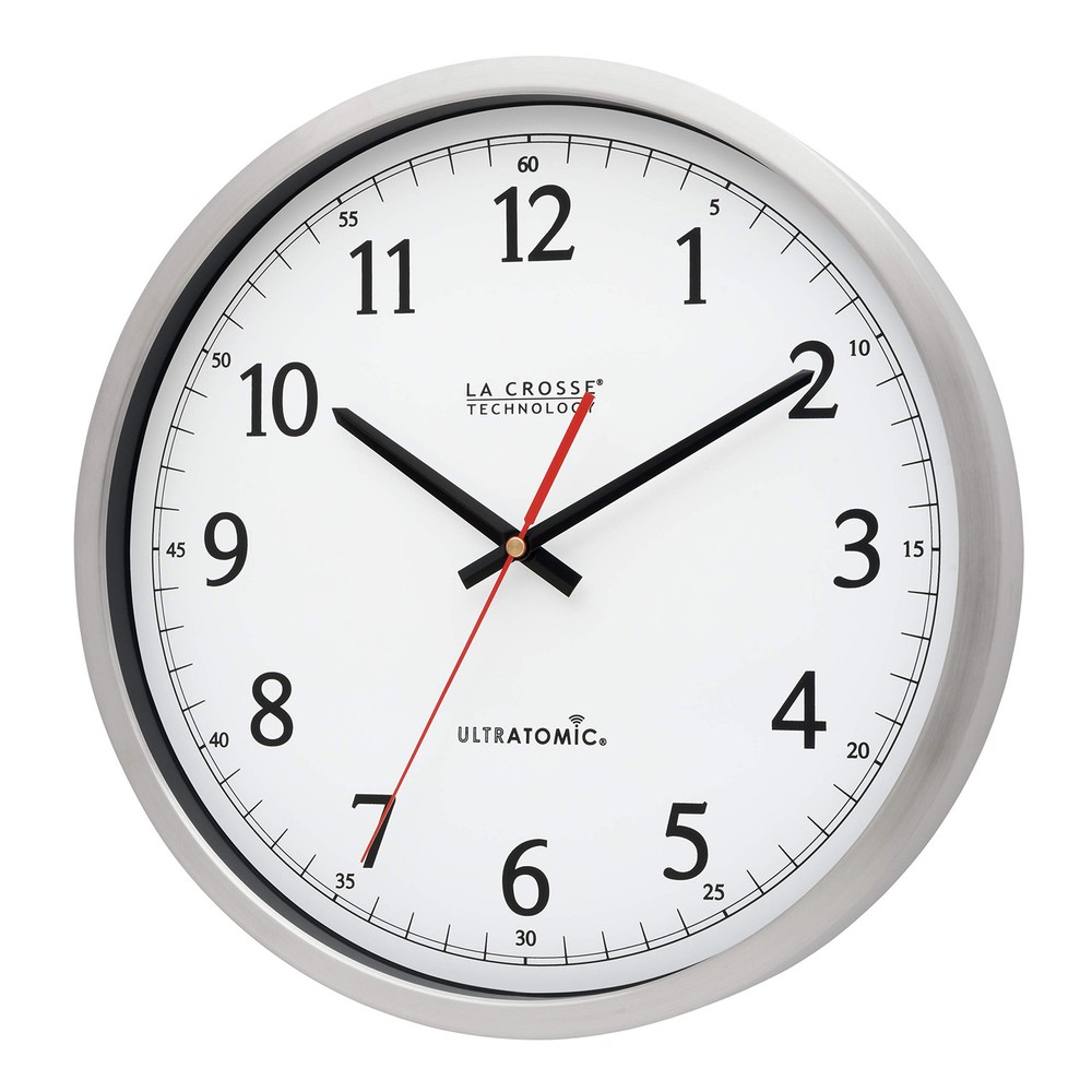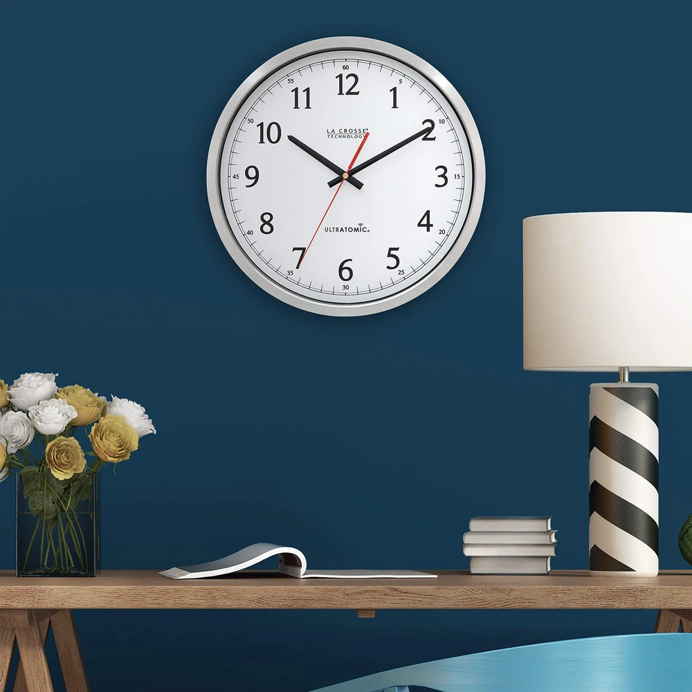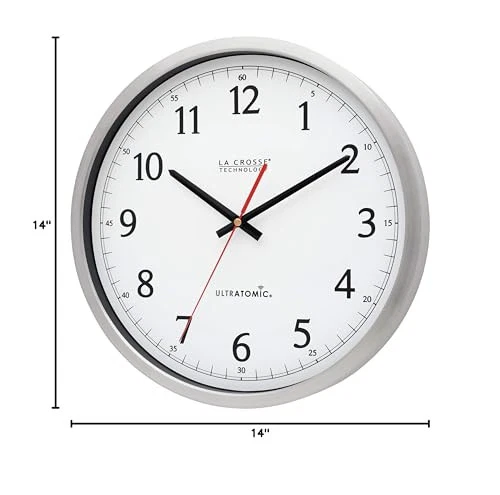 The UltrAtomic wall clock features the most accurate atomic movement on the market. Like a traditional atomic clock, this clock automatically sets itself and updates for Daylight saving time. However, this clock is equipped with two antennas that allows it to work in the nosiest, hostile electronic environments such as busy office buildings, hospitals, or other institutions. With this enhanced reception UltrAtomic clocks increases the WWVB signal reliability and penetration. No more worrying about changing out batteries every year, with its additional battery compartment you’ll keep your UltrAtomic clock running longer. This feature keeps the batteries in your clock running for approximately 3 to 5 years before you would need to replace. Optional ECO-MODE feature is a battery saving feature that will pause the second hand at 12:00 during the hours of 11:00pm-5:00am. Wrapped in a modern 14" stainless steel frame with a plastic shatter-proof lens, this clock attracts in a commercial or residential space. [5-YEAR BATTERY LIFE] – A quality set of 4 “C” batteries will keep the clock running for up to 5 years – an impressive feat offering unparalleled convenience and peace of mind [ROBUST RECEPTION] Dual antenna provides best reception to WWVB time broadcast, even in heaviest electronic traffic areas such as hospitals or commercial buildings [CUSTOM TIME SET] Select from 4 USA time zones or Customize to any World Time [METAL FRAME] Stainless steel polished silver frame and shatter-proof lens [ECO-MODE] Optional Eco-mode feature also saves battery life; Q-MODE (Quartz mode) sets to any manual hour