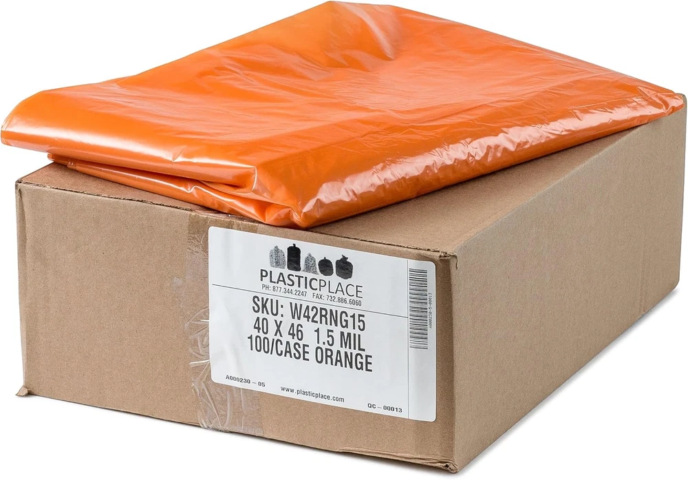 Material: Plastic Item model number: W42RNG15 Item Length: Does not apply Item Form: Bag Type: Does not apply Scent: Orange Product Dimensions: 12.06 x 5.88 x 15.38 inches; 14 Pounds Is Discontinued By Manufacturer: No Country of Origin: USA Item Width: Does not apply Item Height: Does not apply Unit Count: 100.0 Count Material Feature: Heavy Duty Color: Orange Number of Items: 100 Brand: Does not apply gtin13: 744110651218 Recommended Uses For Product: Industrial Waste Capacity: 45 Gallons UPC: 744110651218