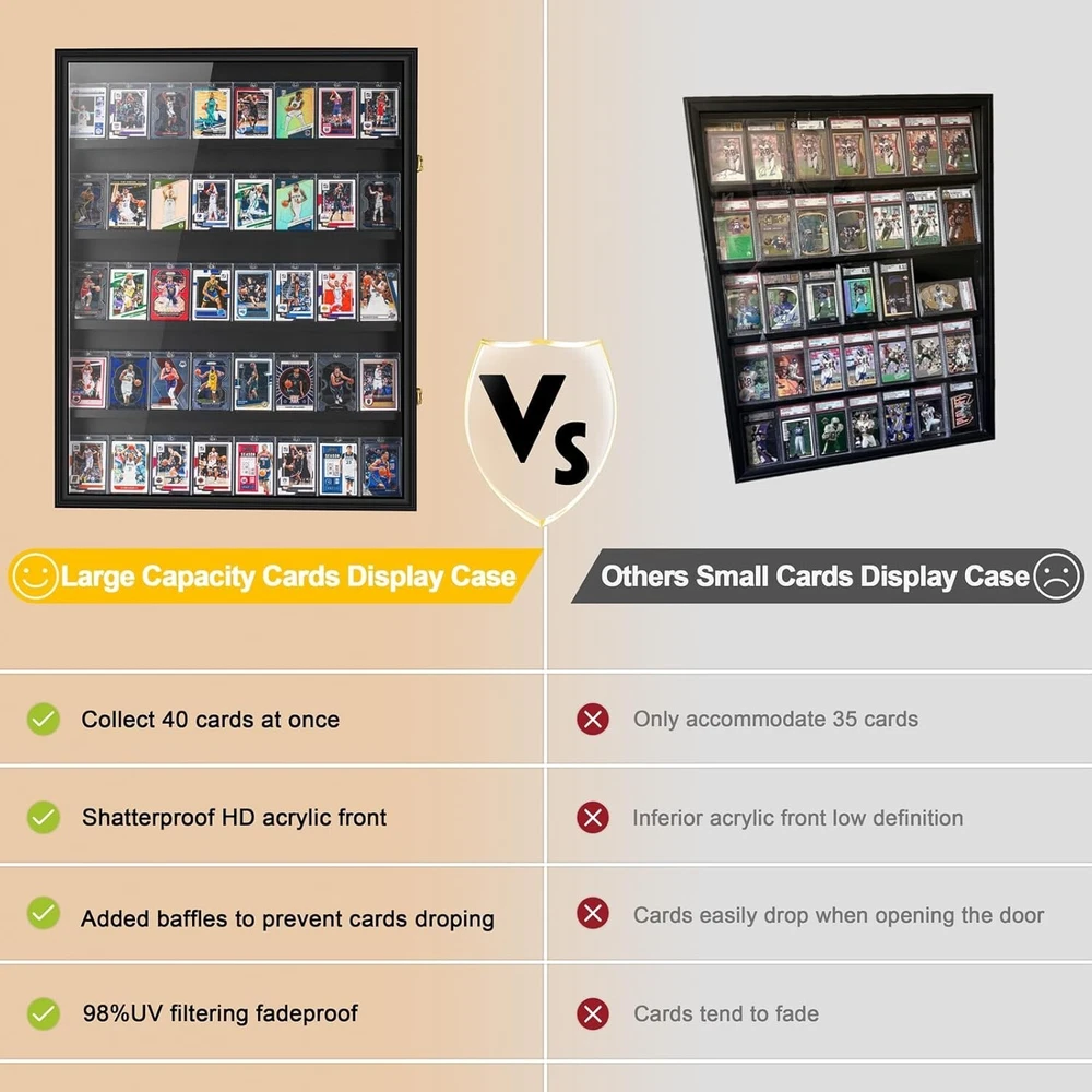 40 Graded Sport XL Baseball Wooden Wall Cabinet for Basketball Football Hockey Trading Cards Display Collectibles Souvenirs Wood 【ELEGANT DISPLAY FOR SPORTS CARD】- This sport cards display case is designed to showcase 40 normal sport cards or 35 graded cards in a sleek and sophisticated way. The case is made of high-quality wood with a smooth wood finish, and features clear acrylic panels for easy viewing and protection against dust and damage. (Note: sport cards not included) 【GREAT FOR SPORTS CARD COLLECTORS】- Whether you're a collection enthusiasts of football, baseball, basketball, hockey or trading cards, this display case is the perfect way to show case your collection of sport cards. The case is designed to fit most standard size of trading cards case, and we designed baffles to go on the front of the shelves to prevent cards droping. 【EASY TO ASSEMBLE AND HANGING】- The baseball cards display case comes with all the necessary hardware for easy assembly and hanging. The clear acrylic panels with 92% transparency, 98% UV protection, prevent your cards from oxidising or fading, our accessories include mounting screws, drywall anchors and mountain buckles for easy hanging. 【STYLISH DESIGN】- The black wooden finish and clear acrylic panels of the graded sport card case make it a stylish addition to any home or office. The elegant design is perfect for displaying your collection in a way that is both practical and attractive, and the graded sport card case is sure to impress your guests and visitors. 【GREAT GIFT IDEA】- This graded sport makes a great gift for some games enthusiast. Whether it's for a birthday, anniversary, or other special occasion, this display case is sure to be a hit with anyone who loves the collection of sports cards. So why wait? Order your graded sport today and start showcasing your collection!