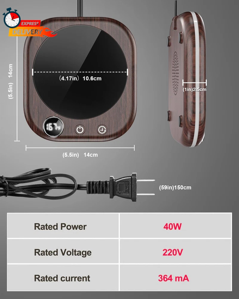Store New Arrivals Add to Favorite View Feedback Contact Mug Warmer,40W Coffee Mug Warmer for Desk with Temperature Display, 4 H Auto Shut Off, 3 Temp Settings & 1-12H Timer, Smart Electric Beverage Warmer for Coffee, Tea, Water, Milk and Coco(Wood Grain) Description Item model number TB-018 Maximum Temperature 167 Degrees Fahrenheit Lower Temperature Rating 113 Degrees Fahrenheit Power Source Corded Electric Color Wood Grain Upper Temperature Rating 167 Degrees Fahrenheit Wattage 4E+1 Material Metal, Plastic Package Dimensions 7.99 x 5.79 x 1.54 inches Item Weight 9.9 ounces Number of Trays 1 Voltage 120 Volts 【Fast&Consistent Heating】 The mug warmer uses a PTC heating element to provide reliable and even heating, maintaining the optimal temperature for your beverage. 【Temperature Control】 The device offers three temperature settings, 113°F 131°F 167°F allowing users to customize the warmth level to their preference for their coffee, tea, or other beverages. 【Timing Function】 Timer 1 to 12 hours, ensuring your drink stays at the perfect temperature for the desired duration.The machine will automatically shut down after working continuously for 4 hours by default. 【Versatile Usage】 In addition to heating up daily beverages such as coffee, milk, and hot chocolate, the device can also be used to gently heat candles, wax melts, and other items for aromatherapy or hair removal wax. 【Package in Detail】 MXMZHXU Mug Warmer *1; Silicone Trivet Mat*1;Model:TB-018; Voltage:110V-120V; Power:40W; Cord Length:59 inch; Size:5.7*5.3*1.1inch(LWH); Color:Wooden. Product description Touch the switch button for 1-3 second to shut off/on. Press and hold the timer button for 1-3 seconds to turn off /on the light strip. ABOUT US We offer the best prices around on high quality products. Our E-store includes media such as books, movies, music and games while offering electronics, toys, sporting apparel, clothing, tools, general home, garden items and more. SHIPPING We are always working hard to ensure your package arrives as soon as possible. Please understand that some factors like weather, high postal traffic, and the performance of shipping companies are outside of our control. We offer free shipping to the lower 48 states and ship within 2 business days of payment, usually sooner. We do not accept P.O. Boxes. Please provide a physical address. For shipping outside of the continental USA, we only use eBay's Global Shipping Program.The item is shipped to KY and then sent to the rest of the world. International customers are responsible for all duties and taxes. Continue to check out in order to calculate costs for shipping the item to your country. Messages regarding eBay's Global Shipping Program MUST be directed at eBay EXCLUSIVELY. RETURNS We offer a 30-Day Return Policy on items which you are not completely satisfied with. You have the option for a full-refund or an exchange of the item. No returns are available on items shipped outside of the USA. PAYMENT We accept PayPal. CONTACT US This page content is yet to come Please ad us to your favorite seller and visit again later Thank You CUSTOMER SATISFACTION We try our very best to make sure every customer is completely satisfied. If there's a problem, message us! We're happy to help. WE ACCEPT Copyright © 2021 AutoDS. | All Rights Reserved