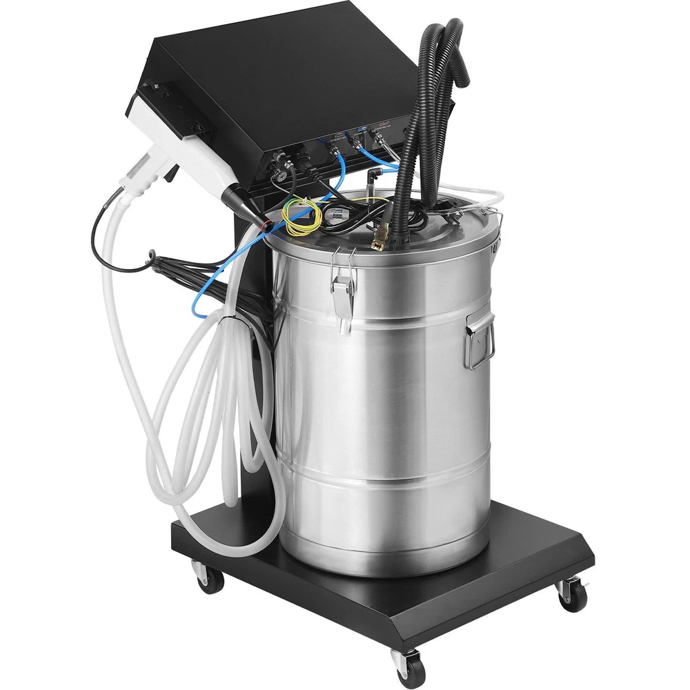 VEVOR Powder Coating System: The Ideal Tool for Coating Work This powder coating system boasts high power, a large powder output, and a substantial 50L powder hopper. It features an output voltage range of 0-100KV and can discharge powder at a rate of 450g/min. Designed for uninterrupted operation, it is well-suited for high-intensity production lines. Our powder coating gun features an internal electrostatic module and delivers a powerful 100KV electrostatic output. This ensures superior adhesion of the coating to the surface. The uniformly adhered powder coating exhibits exceptional resistance to cracking, scratching, and wear. With rapid powder application and a high powder output, this powder coating kit, combined with its strong electrostatic adhesion, effectively covers challenging areas such as corners, grooves, and crevices on irregularly shaped workpieces. It ensures a more even coating across the workpiece. Achieve coating perfection in just 3 simple steps. Even non-professionals can easily operate our powder coating equipment. Our powder coat gun features a robust 2.5mm thick steel plate construction for durability. It comes with four swivel casters for easy mobility, and its cart base allows 360-degree movement. Two of the wheels can be locked for stability during operation.