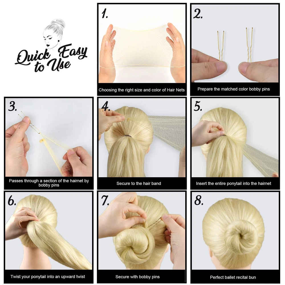 The package includes 40 elastic hair nets and 80 gold U-shaped pins to help create the neatest ballerina buns and hair nets. Say goodbye to messy buns and hello to sleek, elegant hairstyles Great for a variety of uses including workers who need their hair neatly styled, dancers, gymnasts, skaters, etc., or just anyone who likes their hair tied up nice and tight 3 sizes: Hair nets - 30cm/11.81inch - 10 pieces, 50cm/19.68inch - 20 pieces, 70cm/27.55inch - 10 pieces; U-shaped bun pins - 5cm/1.96inch - 20 pieces, 6cm/2.36inch - 40 pieces, 7cm/2.75inch - 20 pieces, suitable for short hair, medium hair, long hair, fine hair or coarse hair, meeting the needs of adults or children High Quality Hair Net: The hair net is made of fine spider silk, nylon elastic lace hand-woven, lightweight, strong and sturdy. Choose a color as close to your own hair color as possible, the fine hair net will almost disappear Hair Bobby Pins: These bun hair pins are made of high-quality metal, not easy to break and fade after long-term use. The hair clips also have a perfect grip. A good partner for hair buns; suitable for fixing hair when using hair bun maker
