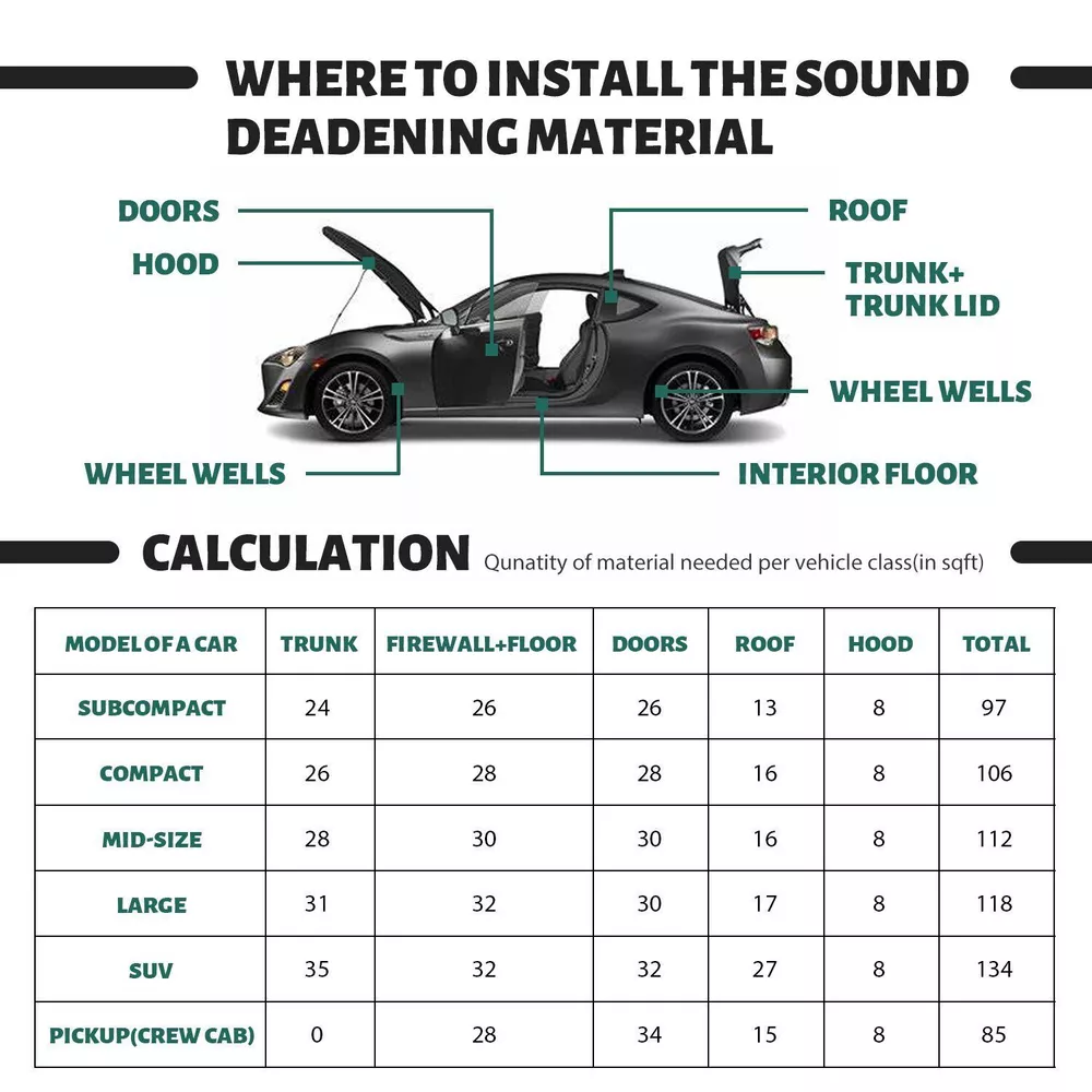 Package included: 15pcs 16" X 10" Car Sound Deadener Heat Insulation Pads Description: Type:Car Truck Noise Reduce Dampening Material: Aluminum & Foam Thickness:7mm Size:40x25cm=16"X10"=16.15sqft=1.5sqm Color: Silver+Black Recommended Install Temperature: -10°C ~ +60°C Resistance Temperature Range: -40°C ~ +300°C Waterproof : Yes Features Liu5092 Best choice of motor parts 40x 25cm NEW Car Auto Heat & Sound Deadener Insulation Deadening Mat Liner 15PCS Package included: 15pcs 16" X 10" Car Sound Deadener Heat Insulation Pads Description: Type : Car Truck Noise Reduce Dampening Material: Aluminum & Foam Thickness:7mm Size:40x25cm=16"X10"=16.15sqft=1.5sqm Color: Silver+Black Recommended Install Temperature: -10°C ~ +60°C Resistance Temperature Range: -40°C ~ +300°C Waterproof : Yes Features 【 Reduce road noise 】If you often drive on uneven roads or on noisy highways, sound insulation can bring you more comfort. It will reduce the noise of roads and other drivers. It will make your driving smoother and have the added benefit of better media listening 【 Enhance the music 】Use sound insulation to make your radio clearer. You will no longer have to turn it up because of traffic noise. Not only is it good for music, but audio books and telephones will sound better, too 【 Improve privacy 】If you don't want other people on the road to hear what you're listening to, the sound insulation prevents the noise from escaping. Sound insulation will help you 【 Warm in winter and cool in summer 】The car insulation will help reduce your interior temperature in the summer, and in winter, the heat insulation can keep you warm in the car, which is conducive to warmth reduce engine/tunnel/console 【 Protect car paint 】In summer, the temperature is too high, the engine runs at high speed and accelerates for a long time, and generates heat, which can easily cause the aging and fading of the car paint; the heat insulation pad can protect it 【 Increase the life of the car 】In summer, due to high temperature and long-term driving, it is easy to cause the cabin to heat up and cause a fire, which may seriously damage your car. Using heat insulation pads can extend the life of the car Installation: Decide what part you want to insulate first: car roof, car floor, car doors or a hood. Please clean the surface you want to paste. Remove the remains of the factory insulation once you have dismantled the interior. Properly clean and degrease the surface prior to installation of mat. Measure the pre cleaned surface of the prospective spot that you are going to treat. Try to locate the piece of material onto the prospective surface of a car without removing an adhesive paper. When your sheet is ready to used, lay that down to the surface and let is glue. Flatten the sheet with hands to avoid air bubbles. Use a roller(not including) for rolling down the foil as a neat step. ? Installation Notices: Make insulation materials and sheet metal firm fit, and play best adhesive, damping performance Do not cover the chassis wiring or air holes when you installation Appropriate use of adhesive tape will strengthen connections effect Paste Aluminum Soundproof/Damping Plate,you could heat with a hair dryer to make it soft, then compacted by hand. If the room temperature is below 5 degrees Celsius, first with sun lamp heating it until soft. Then remove the wax paper and paste it. The extra insulation can be pasted in some hidden place It is not possible that there is an effect on the hearing by only a door installation ,it requires completed construction ? Fitment For: Exterior bulkhead, firewall, hood, engine compartment, engine bays. Boot, wheel arch, body panels, load floor, under seat, floor, interior bulkhead And So On. Also ideal for under floor applications as it has great load resistance properties. Note: Due to the light and screen setting difference, the item's color may be slightly different from the pictures. Please allow slight deviation for the measurement data. Please allow 1-3cm error due to the hand measurement . If you have any questions, please contact us at the first time, we will give you a satisfactory answer. Item Specifics Brand Modigt Type Car Truck Noise Reduce Dampening Color Silver&Black Manufacturer Warranty 2 Years Material Aluminum & Foam Placement on Vehicle Cargo/Trunk/Bonnet/Dashboard/Under Seat/Doors Fitment Type Direct Replacement Manufacturer Part Number Car Heat / Sound Insulaiton Deadener Superseded Part Number Deadening Material Insulation Cars & Truck Application 1 Hood,Firewall,Doors,Floor,Roof Application 2 Underlay,Boot,Panel,Chasis Application 3 Trunk Lid,Trunk Room,Engines,Tailgate Application 4 Ceiling,underneath bonnets,Underfelt Application 5 Car& Home Interior Heat Sound Deadener Insulation Application 6 Automotive,Motorhome,Camper,Restorer Application 7 Classic Car,Race Car,Stock Car,Old Vintage Car,Pickup,SUV,Caravan Application 8 Van,Truck,limousine,Camper,Boat,Motor Homes,School Bus,Low Rider Application 9 muscle car/hot rods/corvettes/imports/tuners/street rods/rat rods Application 10 For use in the application of any sound deadening Function 1 Reduce the road/ Engine/ Wind noise Function 2 Dustproof/ Waterproof/ Anti-moisture Function 3 Protects Paint from Blistering Easy Installation All Curves and Corners Without The Need For Heat Features1 Easy Installation, Waterproofing, Noise Reduction Features2 Protects Paint from Blistering, Anti-moisture Features3 Easy Clean,Noise Reduction, Easy to Cut, Self-Adhesive Thickness 7mm=276mil=0.276” Size 40X25cm/ 16inX10in Items Included 15pcs 16" X 10" Car Sound Deadener Heat Insulation Pads Payment 1. It will be much appreciated that you finish your payment asap or it will make UPI (unpaid item case) on your account leading to be suspended or restricted by eBay when those UPI cases carry over to certain amount. 2. Any problems please contact us for more details. Shipping 1. All items will be shipped to buyer's 