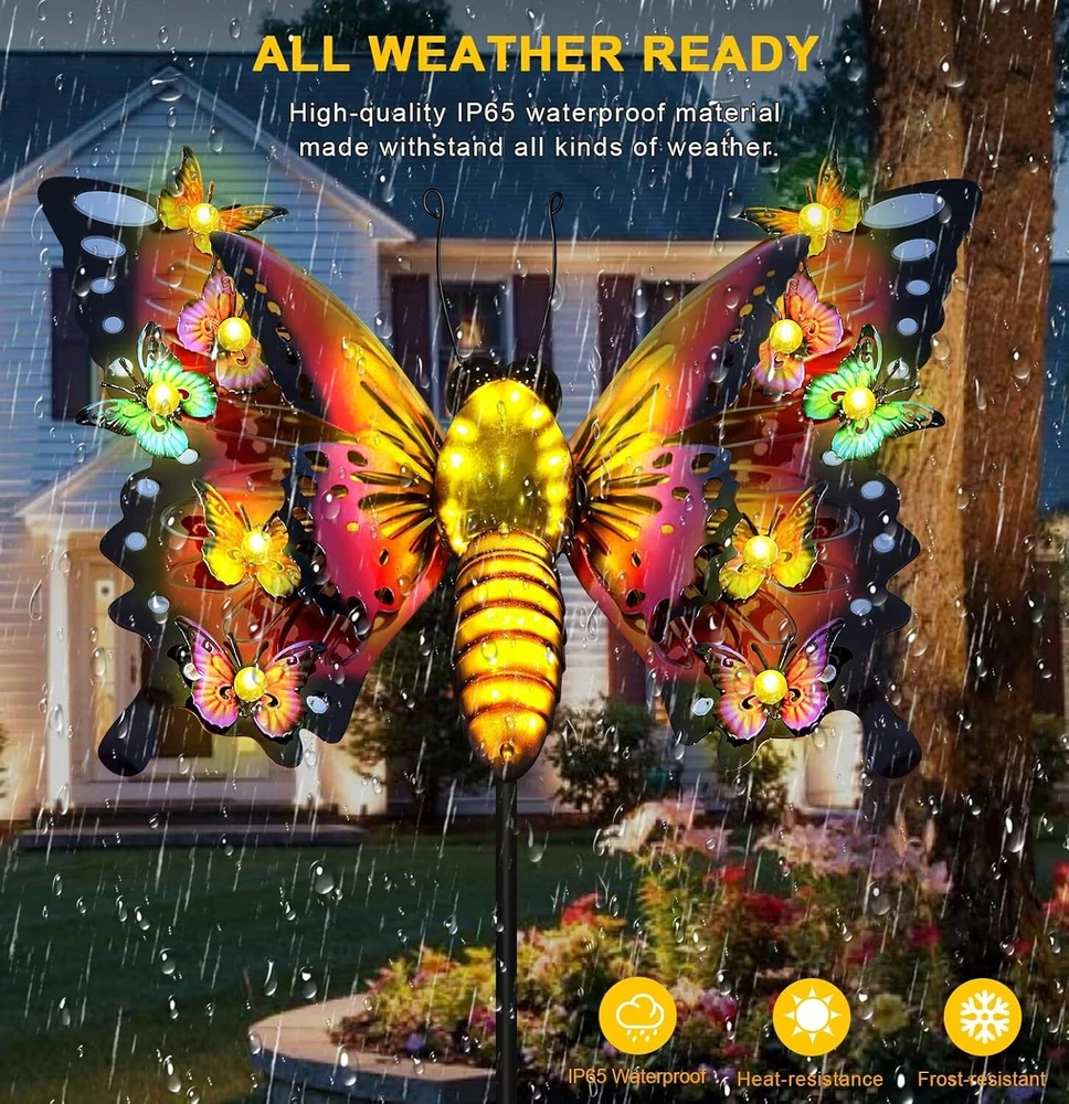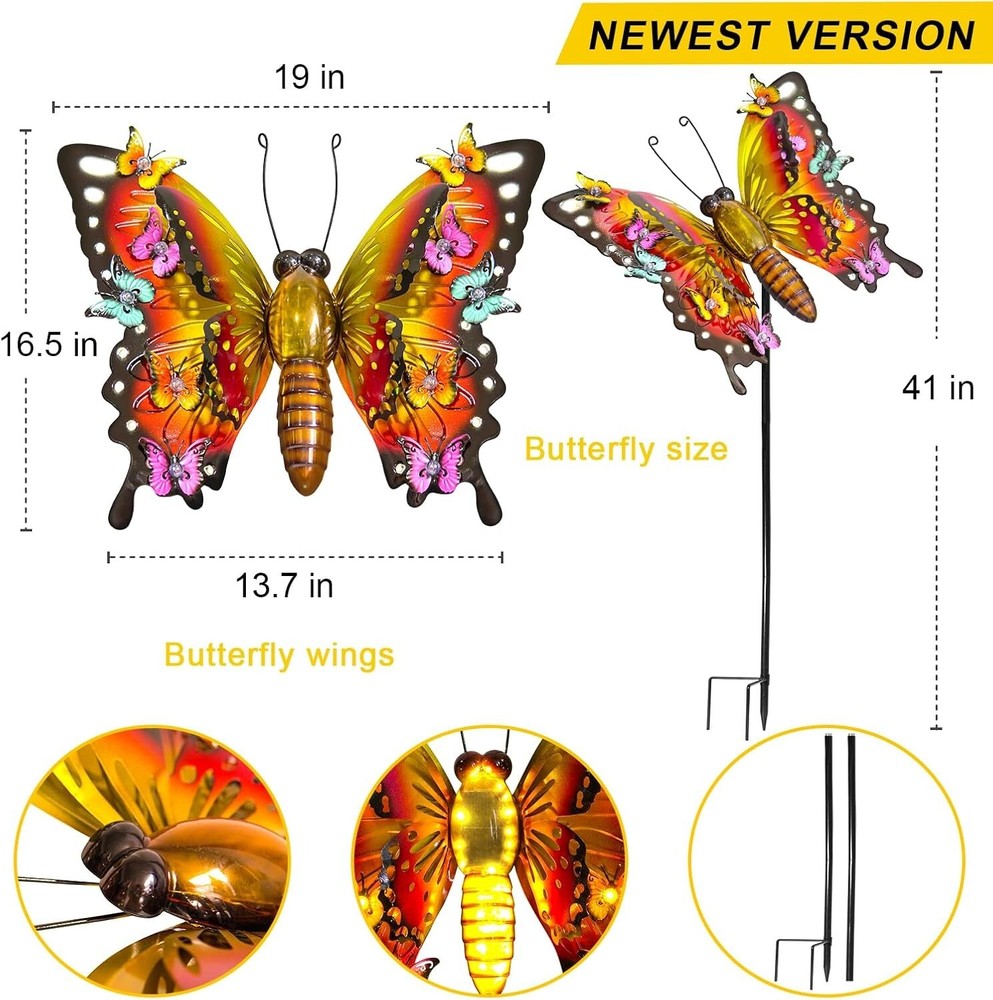 41" Solar Butterfly Garden Lights - Enchanting Outdoor Decor for All Seasons ‹ › ‹ › ‹ › ‹ › ‹ › ‹ › ‹ › ‹ › ‹ › 41" Solar Butterfly Garden Lights Enchanting Outdoor Decor for All Seasons Features: Crafted from durable iron material featuring a double butterfly wing three-dimensional design. Showcases 10 colorful small butterflies flanking a beautifully designed large butterfly. Body length of 20 inches, with a 41-inch ground insert for optimal placement. Colorful butterfly wings enhance realism during the day, while warm lights create a charming ambiance at night. Built-in high-efficiency solar panel ensures 6-8 hours of sunlight charging for 8-10 hours of automatic lighting at night. Waterproof and durable, designed with IP65 materials, resistant to rain, snow, frost, and high temperatures. Simple installation—just insert into the soil, no external power source necessary. Benefits: Brings a whimsical touch to your garden, patio, lawn, or backyard. Perfect for fairy gardens, pathways, and as unique decorative lights. Ideal as a thoughtful gift for birthdays, Mother's Day, or as horticultural art gives that brings joy and beauty. Provides 8-10 hours of magical illumination to enhance your outdoor space at night. Guaranteed satisfaction, with a promise of a free replacement if needed. Why choose our Solar Butterfly Garden Lights? Transform your outdoor space into a captivating landscape with our enchanting Solar Butterfly Garden Lights. Made from high-quality iron and designed to reflect nature's beauty, these lights not only add charm to your garden during the day but also illuminate your nights with a warm glow. Designed for simplicity and durability, these solar lights withstand the elements while offering you the convenience of easy installation. Don't miss the opportunity to brighten your garden and elevate the ambiance—bring home our Solar Butterfly Garden Lights and light up a happy life! Shipping Free & Fast Shipping - We offer free shipping to most of the USA with a normal delivery time of 3-7 days. However, due to the current situation, additional delivery time (up to 3 weeks) may be required for some items. Alternative Carriers - We may use alternative carriers (e.g. USPS, FedEx, UPS, etc.) to ensure your package arrives safely and on time. Due to the use of multiple carriers, we are unable to provide a tracking number automatically. Handling Time - Orders are processed and shipped within 1-2 business days of receiving cleared payment. Shipping Restrictions - Shipping to Alaska, Hawaii, Puerto Rico, Guam, and other US territories may incur shipping charges or delivery restrictions. Please contact us before ordering, or your order can be refunded/cancelled. State Restrictions - There may be restrictions based on your state of purchase. For example, certain items may not be shipped to California due to state regulations. Contact for Tracking Updates - If you require tracking updates or have any concerns about the delivery of your order, please feel free to contact us, and we will be happy to assist you. Return Please see our eBay Return Policy. Thank you. Payment We accept all major credit cards, PayPal, and Apple Pay for your convenience. Your payment information is secure and encrypted to ensure a safe and seamless transaction. Please complete your payment within 3 days of purchase to avoid any delays in shipping. Feedback Your feedback is extremely important to us. We strive to provide the best products and customer service possible. If you are satisfied with your purchase, please take a moment to leave us a positive review. If you have any concerns or issues with your order, please contact us before leaving negative feedback. We are committed to resolving any problems and ensuring your satisfaction. Contact Us If you have any questions or concerns, please feel free to reach out to our customer support team. You can contact us through the eBay messaging system. We are available Monday to Friday, 9:00 am to 5:00 pm EST, and we will do our best to respond to your inquiry within 24 hours. Thank you for supporting our small family business! UPC: Not Set Unit Quantity: 3 lb Features: Waterproof,Solar,Colorful,Durable,Easy Installation Theme: Butterflies Light Color: Warm White Mounting: Stake Control Style: Switch Material: Metal,Iron Smart Home Compatibility: Not Set Labels & Certifications: Not Set Type: Garden Decor Brand: Unbranded Power Source: Solar Installation Area: Outdoor Sensor Type: Light Lighting Technology: Not Set Number of Lights: 5 Color: Solar Butterfly Lights Number of Settings: Not Set Style: Not Set Energy Star: Not Set MPN: Not Set EC Range: Not Set Finish: Not Set Size: Large Power Consumption: Not Set Bulb Shape Code: Not Set Voltage: Not Set IP Rating: IP65 Item Diameter: Not Set Country/Region of Manufacture: Not Set Color Temperature: Not Set Lumens: Not Set Bulb Life Hours: Not Set Model: Not Set Item Height: 41 in Item Length: Not Set Item Weight: 3 lb Item Width: Not Set Unit Type: lb