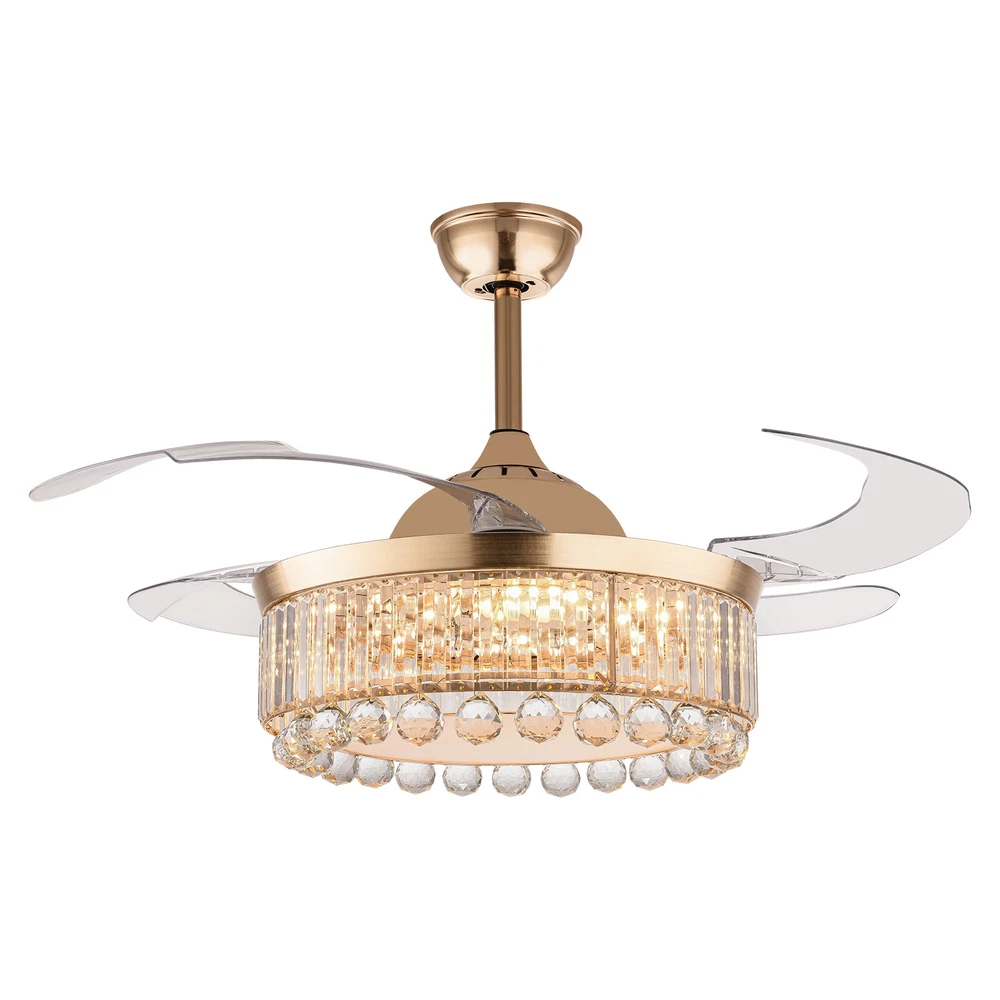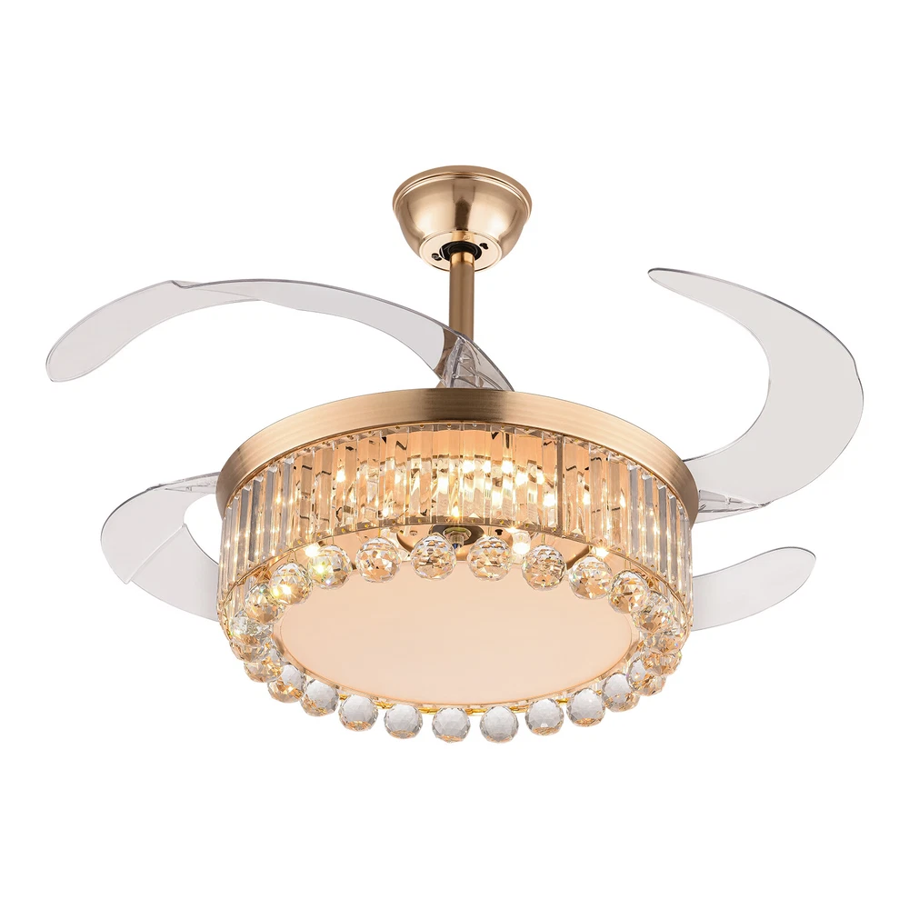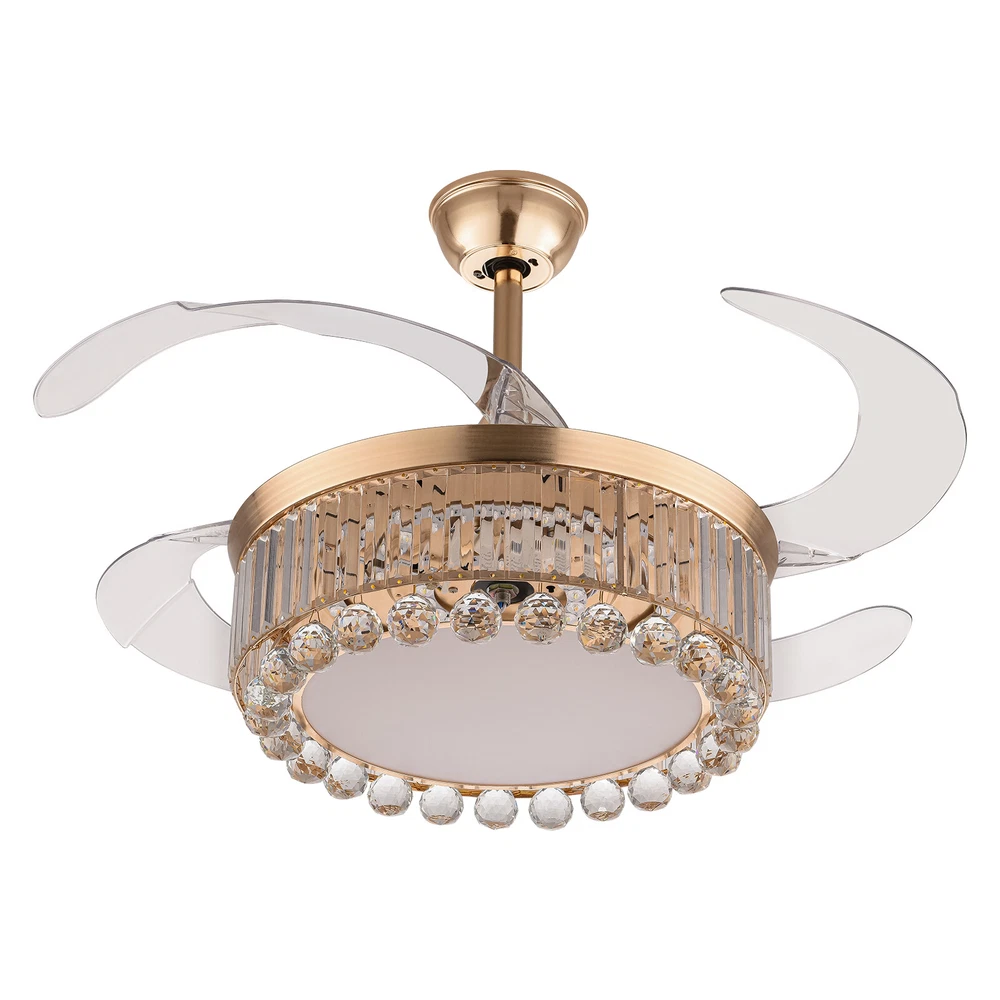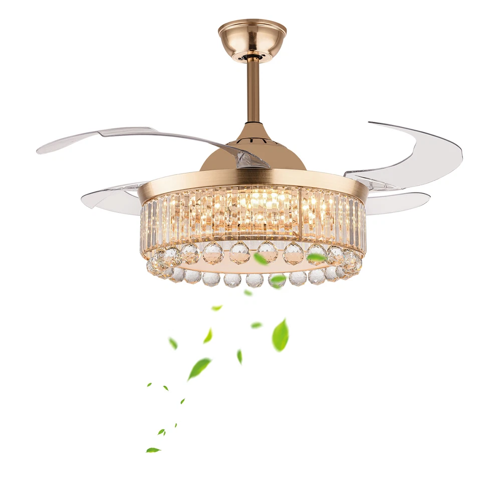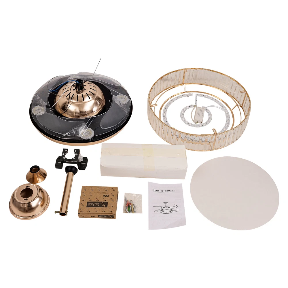 Application It is suitable for space of 107.64-215.28 ft² such as hallways, living rooms, bedrooms, study rooms, balconies, bars, aisles, foyers, hotels, restaurants, corridors, cafes, dining rooms, children's rooms, game rooms, nursing rooms, kindergartens, and libraries. Specifications Style: Morden Color: Golden, Clear Material: Hardware Iron, Crystal Surface Treatment: Polishing, Electroplated Assembly Required: Yes Light Source: LED (Included) Motor Type: Pure Copper Motor Power Source: Wire Connecting Light Color: White, Warm, Natural EU Energy Efficiency Label Level: A++to E Power: 45W Voltage: 90-265V, 50HZ Noise Level: 35db Wind Speed: 6 Gears Timing Range: 1/2/4 H Remote Control Distance: 3-5m/ 9.84-16.40 ft 42 Inch Golden Ceiling Fan with Light, Remote Retractable Fandelier Ceiling Fan Description Description There is nothing happier than having a light in the dark and a breeze in the summer. Our ceiling fan light can easily fulfill your wishes! Three color temperature light effects to meet different scene needs. Frequency conversion technology can save energy and supply stable air. Equipped with a remote control, it allows for remote operation without having to get up. Our product can let you enjoy the comfort of your home every moment! Key Features Build to Last: The high-quality hardware iron and crystal, exquisite polishing and electroplated processes make it resistant to corrosion, rust, deformation, high temperature, and wear, ensuring long-term use. Embrace Smart Life: With the remote control, you can adjust the fan speed (6 gears) while lying in bed to feel the gentle to strong winds, switch infinitely adjustable brightness between warm light/neutral light/white light as needed to feel different atmospheres, and set timing (1/2/4H) to rest assured to sleep, providing you with a more intelligent and convenient life experience. Soft & Strong Lightness: The high transmittance lampshade allows for soft and even light, and the 45W efficient and long-lasting LED light source provides reliable and bright light without flickering under stable voltage while better protecting your eyes and illuminating your space. Large Size: The 42-inch fan size is just the right size to allow the fanlight to blow a wide and even area (107.64-215.28 ft² ), which is more conducive to circulating air. Adjustable Height: The suspender can be adjusted in two lengths (7.87in, 3.93in) to adapt to different ceiling heights, meeting your diverse needs. Energy Saving: It helps reduce the frequency and time of air conditioning use, saving energy, and reducing expenses. When used together with air conditioning, it can avoid direct blowing and reduce the risk of air conditioning diseases. Suitable for Winter and Summer: It has a one-touch forward and reverse function. The normal mode of the fan can bring coolness in summer, while the winter reverse mode can be combined with heating to press down the warm air and increase the air convection rate, creating a 360-degree ambient heating flow. Low Noise: It operates at a low decibel level of 35 decibels, giving you a whisper-quiet experience for a comfortable sleeping and working environment. Easy Clean-Up: The smooth surface, open fan blades, and the enclosed lampshade allow you to remove the dust on the surface of this light with a towel. Beautifully Decorated: The carefully designed crystal ball glitters under the refraction of light, making this product not only a chandelier, and a fan, but also a decoration, suitable for most decorative styles, bringing you the beauty of luxury. Details Solid Base: The thickened and enlarged ceiling base (5.9in) will bring stronger load-bearing capacity and stability. Round Corners: The round corners and burr-free edges will better care for your skin during installation and cleaning while enhancing the beauty of this product. Application It is suitable for space of 107.64-215.28 ft² such as hallways, living rooms, bedrooms, study rooms, balconies, bars, aisles, foyers, hotels, restaurants, corridors, cafes, dining rooms, children's rooms, game rooms, nursing rooms, kindergartens, and libraries. Specifications Style: Morden Color: Golden, Clear Material: Hardware Iron, Crystal Surface Treatment: Polishing, Electroplated Assembly Required: Yes Light Source: LED (Included) Motor Type: Pure Copper Motor Power Source: Wire Connecting Light Color: White, Warm, Natural EU Energy Efficiency Label Level: A++to E Power: 45W Voltage: 90-265V, 50HZ Noise Level: 35db Wind Speed: 6 Gears Timing Range: 1/2/4 H Remote Control Distance: 3-5m/ 9.84-16.40 ft Color Temperature: 3200-4500-6000K Batteries Type: 2* AAA Batteries (Included) Illumination Area: 10-20㎡/107.64-215.28 ft² Fan Applicable Area: 10-20㎡/107.64-215.28 ft² Base Diameter: 15cm/5.9in Rods Length: 20cm/ 7.87in, 10cm/3.93in Overall Product Size When Unfolded (D*H): 107*40/ 55cm / 42 *15.74/ 21.65 in Lampshade Size(D*H): 50*15cm/ 19.68*5.9 in Package Included 1* Ceiling Fan Light 1* Remote Control 2* Suspension Rods 1* English Manual Other Accessories for Assembly Notes Please read the instruction manual carefully before use and pay attention to the safety matters therein. Please make sure the power is cut off before installation. To ensure your safety, we recommend that two people install it together. Please install it by someone with an electrical license if necessary. Please wear electric insulation gloves (not included) and avoid scratching the surface of the item and the electric wire when installing. Please check the list of products you have received to ensure that it applies to your room needs. Please make sure that the closest distance to an obstacle when the fan blades are deployed is greater than 8.69 ft. Please allow the slight color difference caused by the shooting light and 1-3cm error due to manual measurement, and make sure you do not mind before you order. Payment Delivery details Terms of sales About us Contact us Payment We accept ebay payment 。 Fe
