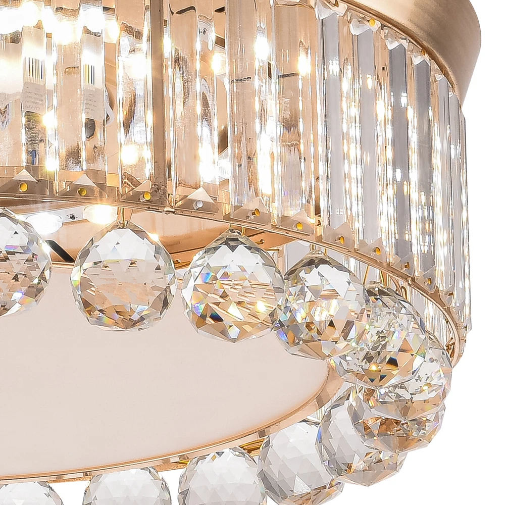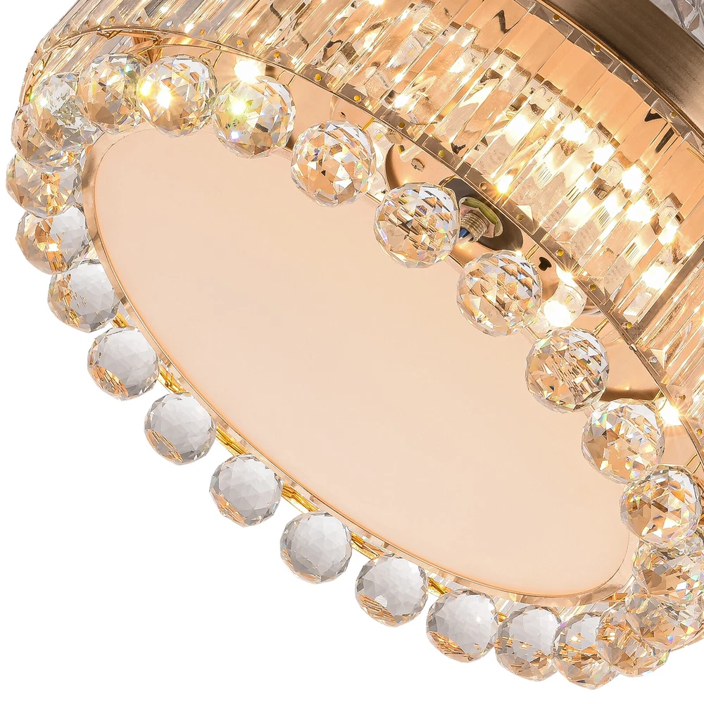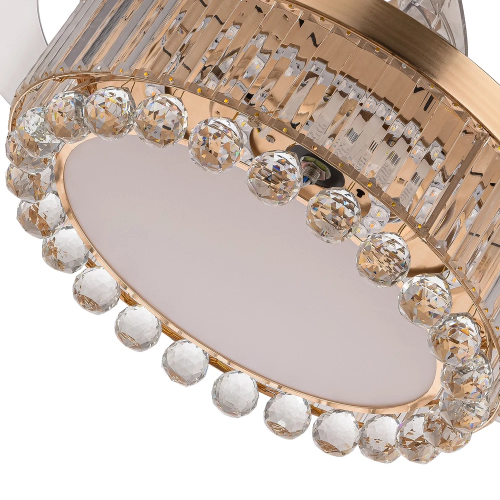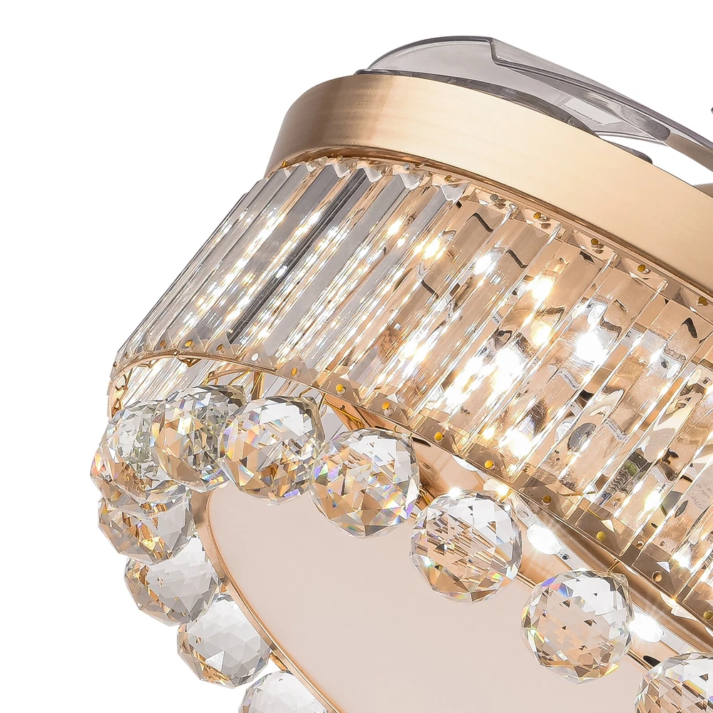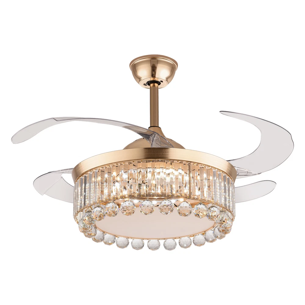 Application It is suitable for space of 107.64-215.28 ft² such as hallways, living rooms, bedrooms, study rooms, balconies, bars, aisles, foyers, hotels, restaurants, corridors, cafes, dining rooms, children's rooms, game rooms, nursing rooms, kindergartens, and libraries. Specifications Style: Morden Color: Golden, Clear Material: Hardware Iron, Crystal Surface Treatment: Polishing, Electroplated Assembly Required: Yes Light Source: LED (Included) Motor Type: Pure Copper Motor Power Source: Wire Connecting Light Color: White, Warm, Natural EU Energy Efficiency Label Level: A++to E Power: 45W Voltage: 90-265V, 50HZ Noise Level: 35db Wind Speed: 6 Gears Timing Range: 1/2/4 H Remote Control Distance: 3-5m/ 9.84-16.40 ft 42 Inch Golden Ceiling Fan with Light, Remote Retractable Fandelier Ceiling Fan Description Description There is nothing happier than having a light in the dark and a breeze in the summer. Our ceiling fan light can easily fulfill your wishes! Three color temperature light effects to meet different scene needs. Frequency conversion technology can save energy and supply stable air. Equipped with a remote control, it allows for remote operation without having to get up. Our product can let you enjoy the comfort of your home every moment! Key Features Build to Last: The high-quality hardware iron and crystal, exquisite polishing and electroplated processes make it resistant to corrosion, rust, deformation, high temperature, and wear, ensuring long-term use. Embrace Smart Life: With the remote control, you can adjust the fan speed (6 gears) while lying in bed to feel the gentle to strong winds, switch infinitely adjustable brightness between warm light/neutral light/white light as needed to feel different atmospheres, and set timing (1/2/4H) to rest assured to sleep, providing you with a more intelligent and convenient life experience. Soft & Strong Lightness: The high transmittance lampshade allows for soft and even light, and the 45W efficient and long-lasting LED light source provides reliable and bright light without flickering under stable voltage while better protecting your eyes and illuminating your space. Large Size: The 42-inch fan size is just the right size to allow the fanlight to blow a wide and even area (107.64-215.28 ft² ), which is more conducive to circulating air. Adjustable Height: The suspender can be adjusted in two lengths (7.87in, 3.93in) to adapt to different ceiling heights, meeting your diverse needs. Energy Saving: It helps reduce the frequency and time of air conditioning use, saving energy, and reducing expenses. When used together with air conditioning, it can avoid direct blowing and reduce the risk of air conditioning diseases. Suitable for Winter and Summer: It has a one-touch forward and reverse function. The normal mode of the fan can bring coolness in summer, while the winter reverse mode can be combined with heating to press down the warm air and increase the air convection rate, creating a 360-degree ambient heating flow. Low Noise: It operates at a low decibel level of 35 decibels, giving you a whisper-quiet experience for a comfortable sleeping and working environment. Easy Clean-Up: The smooth surface, open fan blades, and the enclosed lampshade allow you to remove the dust on the surface of this light with a towel. Beautifully Decorated: The carefully designed crystal ball glitters under the refraction of light, making this product not only a chandelier, and a fan, but also a decoration, suitable for most decorative styles, bringing you the beauty of luxury. Details Solid Base: The thickened and enlarged ceiling base (5.9in) will bring stronger load-bearing capacity and stability. Round Corners: The round corners and burr-free edges will better care for your skin during installation and cleaning while enhancing the beauty of this product. Application It is suitable for space of 107.64-215.28 ft² such as hallways, living rooms, bedrooms, study rooms, balconies, bars, aisles, foyers, hotels, restaurants, corridors, cafes, dining rooms, children's rooms, game rooms, nursing rooms, kindergartens, and libraries. Specifications Style: Morden Color: Golden, Clear Material: Hardware Iron, Crystal Surface Treatment: Polishing, Electroplated Assembly Required: Yes Light Source: LED (Included) Motor Type: Pure Copper Motor Power Source: Wire Connecting Light Color: White, Warm, Natural EU Energy Efficiency Label Level: A++to E Power: 45W Voltage: 90-265V, 50HZ Noise Level: 35db Wind Speed: 6 Gears Timing Range: 1/2/4 H Remote Control Distance: 3-5m/ 9.84-16.40 ft Color Temperature: 3200-4500-6000K Batteries Type: 2* AAA Batteries (Included) Illumination Area: 10-20㎡/107.64-215.28 ft² Fan Applicable Area: 10-20㎡/107.64-215.28 ft² Base Diameter: 15cm/5.9in Rods Length: 20cm/ 7.87in, 10cm/3.93in Overall Product Size When Unfolded (D*H): 107*40/ 55cm / 42 *15.74/ 21.65 in Lampshade Size(D*H): 50*15cm/ 19.68*5.9 in Package Included 1* Ceiling Fan Light 1* Remote Control 2* Suspension Rods 1* English Manual Other Accessories for Assembly Notes Please read the instruction manual carefully before use and pay attention to the safety matters therein. Please make sure the power is cut off before installation. To ensure your safety, we recommend that two people install it together. Please install it by someone with an electrical license if necessary. Please wear electric insulation gloves (not included) and avoid scratching the surface of the item and the electric wire when installing. Please check the list of products you have received to ensure that it applies to your room needs. Please make sure that the closest distance to an obstacle when the fan blades are deployed is greater than 8.69 ft. Please allow the slight color difference caused by the shooting light and 1-3cm error due to manual measurement, and make sure you do not mind before you order. Payment Delivery details Terms of sales About us Contact us Payment We accept ebay payment 。 Fe