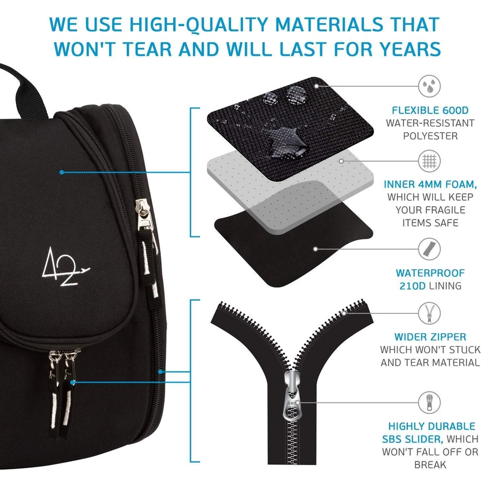 42 Travel Hanging Toiletry Bag – Large Kit Organizer for Men & Women – Spacious & Compact, 17 Compartments for all you need - Strong Zippers, Sturdy Hook, Water Resistant useful dividers and elastic loops in each pocket DISCLAIMER. TOILETRY BAG COMES EMPTY, without anything included. Accessories are shown to demonstrate the capacity. SHIPPING Domestic Buyers - We have confidence in our products, but if you are not fully satisfied please contact us within 30 days of purchase and you will get full refund. - We ship within 3 business days of payment, usually sooner - We offer FREE shipping on all orders! - We only ship to the lower 48 states, no APO/FPO addresses or PO Boxes allowed International buyers – please note: Import duties, taxes, and charges aren't included in the item price or postage cost. These charges are the buyer's responsibility. - Please check with your country's customs office to determine what these additional costs will be prior to bidding or buying. * Order Cancellation Policy ** You can return a product for up to 30 days from the date you purchased it. 1. The seller reserves the right to cancel the special case only due to eBay cancellation fee. 2. The decision of seller is the final. 3. The seller will respond to the cancellation request within 2 business days. Please wait for the result of cancellation. 4. In case the cancellation is not completed by some reasons, the buyer can follow the options below to get the refund. 4.1 The buyer can reject the item when it arrives. 4.2 The buyer can send the item back to the seller within 30 days If the buyer receives item (USA Shipment ONLY). The seller will provide the FREE return label to the buyer when the buyer opens " Return Item" case on eBay by using the reason as "Change my mind" ONLY. 5. When buyer has placed the order. The order will be processed and completed by automatic warehouse system within 5 minutes. In case that buyer sends the cancellation request after 5 minutes of placing the order, the request will be rejected. **Sending direct message to cancel the order is not allowed for every case.* Return Policy For the return case - If buyer would like to return the items for refund or replacement, please CONTACT SELLER to receive the free return label from seller. The refund or replacement will be processed with the tracking number of return label which is provided by seller only. The other ways of return which are not approved by seller will not be processed for the refund or replacement.