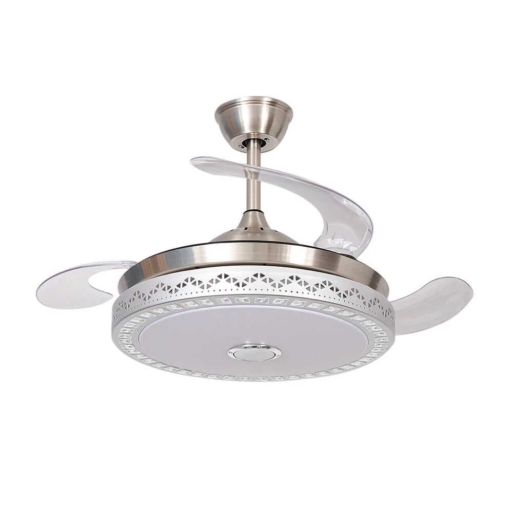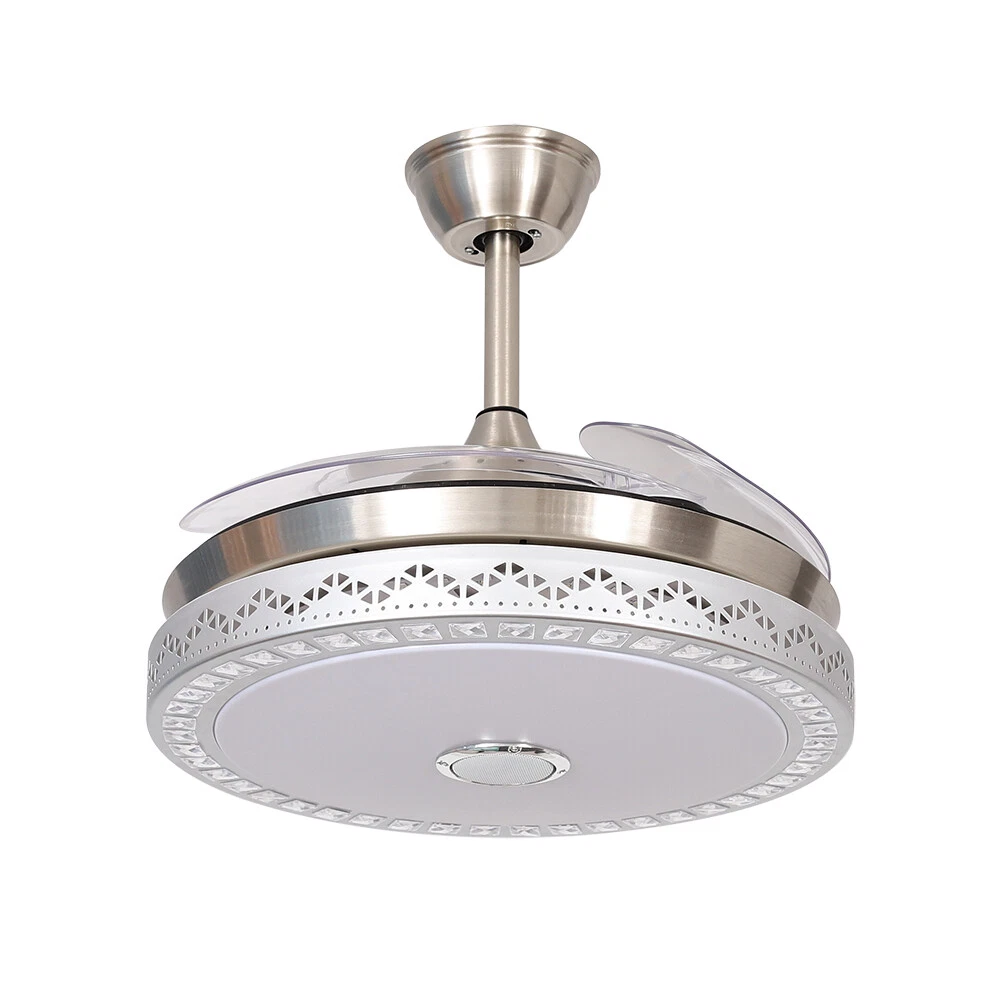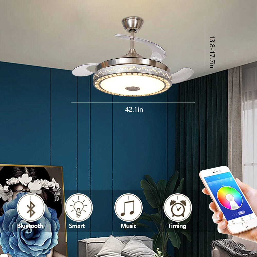 42" Ceiling Fan with LED Light Bluetooth Speaker Retractable W/ Remote ! 1. Description Dimmable Led Ceiling Fan Light Chandelier Flush Mount Lamp Bluetooth&Remote Fan Blows Forward and Reversely Cooling in Summer(Fan Blows Forward) With Cold Wind, Strong Wind Can Increase the Flow of Cold Air Warm in Winter(Fan Blows Reversely ) Cooperate with Warm Wind to Improve Indoor Air Circulatio 2. Features&Highlights 【Remote Control】Integrating Turn on Light with 3 Color Changes (White, Warm White, Neutral White) , 6 Wind Speeds, You Can Use the Remote Control to Choose the Color You like. 【Invisible Ceiling Fan】with Retractable Abs Blades, the Blades Will Stretch out and Put Inside Automatically When Turned on and off the Fan, Saving Space for Your Room. 【Crystal】Absolute Stunning When Lights Turned on, Make Your Room Full of Luxury Sense. 【Applications】Ideal for Living Room, Dining Room, Foyer, Villa, Bedroom, Restaurant, Study Room, and Other Places to Decorate Lighting Fixtures. 【Customer Service】If You Have Any Issues, Inquiries or Need Assistance, Please Feel Free to Contact Us, We Will Try Our Best to Help You. 3. Specifications Style: Modern Type: Ceiling Fan Chandelier Light Source: Led Lighting Board(Included) Switch: Wireless Bluetooth&Remote Control 6 Fan Speed: Low-high Light Color:3 Regular Colors Change by Remote/Colorful Light Change by Bluetooth( Need to Download App to Control It) Timing Function:1/2/4 Hours Voltage:110v-220v(Fit Your Country) Wattage:36-40w Applications:8-25㎡,Living Room, Ding Room,Bedroom, Study Room, Corridors, Foyer, Kitchen, Restaurant, bar, Coffee Shops Etc Diameter:42in /106 Cm(Blades Open) Lampshade Diameter:18.9in/48cm Downrods:10cm/4in +20cm/7.87in (Two Rods, Installed According to Your Ceiling Height) Total Height:35/45cm(Depends on Downrods) Lampshade:abs+Metal Frame Blades: Acrylic Electronic Materials: Steel+ Copper Wire Material: High Quality Acrylic Lampshade, Plating Metal Warm Tips: This Fan Needs Basic Assembly, Professional Would Be Highly Recommended. Floor Height Is Greater than 110", Ceiling Load Is Greater than 25kg. Payment Delivery details Terms of sales About us Contact us Payment We accept ebay payment 。 Fees such as import duties, taxes are not included in the item price or shipping costs. These charges are the buyer's responsibility. Delivery details Shipping: 2-9 working days to: USA Terms of sales We maintain high standards of excellence and strive for hundred percent customer satisfaction. Feedback is very important to us. We hope that you contact us immediately before you give neutral or negative feedback, so that we can address your concerns. It is impossible to address issues if we do not know about them! About us Your satis faction is our ultimate goal. We work hard to earn your trust and future business. Our certified technicians have tested each item before shipping. The unit comes with 1 year limited warranty on all manufacturing defects. a) If you receive a defective item, you may return it or ask for a discount. Please contact us within 14 days after you receive the package. b) What you returned must be intact and in its original packaging as re? u. Customer is responsible for shipping costs of the returned item. c) We will cover the cost of shipping back t with the shipping rate indicated in the registration page. We will send you a new unit or refund the full payment you paid. Thank you. Contact us Business Hour Business Hour: Monday To Friday: 8:30 AM to 5:00 PM (Beijing China time) Due to time zones, our reply to your questions may not be immediately. But within above working time, we will reply your email within 24 hours. If it's non-workdays, please kindly be patient and wait till Monday. Please contact us with ebay message. Please feel free to contact us if you have any questions. Monday To Friday: 8:30 AM to 5:00 PM (Beijing China time) Due to time zones, our reply to your questions may not be immediately. But within above working time, we will reply your email within 24 hours. If it's non-workdays, please kindly be patient and wait till Monday. Please contact us with ebay message. Please feel free to contact us if you have any questions. On Feb 17, 2025 at 22:12:36 PST, seller added the following information: