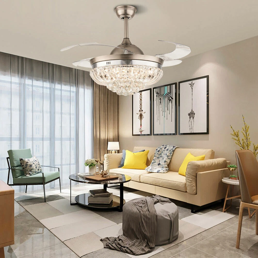 42"/36" Crystal Chandelier Invisible Ceiling Fan Light With 3-Color LED +Remote ❤Welcome❤ Model One:42" Silver #1 Product Description: Color:Silver This modern ceiling fan with lights is a combination of ceiling fan and crystal chandelier: ★As for a ceiling fan, it has 4 retractable blades that can stretch out and put inside automatically when turned on and off. ★That means, when turned off, the blades will put inside and become 'invisible', totally a chandelier with crystal; ★When turned on, the blades will stretch out, and transfer to a traditional ceiling fan with lights. ★This chandelier fan is controlled by remote control, ceiling fan speed and LED light can be controlled separately by a single remote control. Fan Chandelier Features: ♥Pendant Lights Type: Crystal Pendant Lights ♥Material: Stainless Steel+k9 crystal+ABS fan ♥Size: 42 inches ♥Color:Silver ♥Style: modern ♥Number of Blades: 4 ♥Lighting Features: dimmable, fan light ♥Application Type: Indoor ♥Light Bulb Type: LED ♥Number of lamps: 10 ♥Power: 41W (inclusive) -50W (including) ♥Applicable Places: living room/bedroom/kitchen/office and restaurant ♥Voltage: 110V Please Note: ▲The actual color of the chandelier may be deviated due to the color of the display and the angle of the picture. ▲Please receive the actual color of the goods as standard, thank you for your understanding and support. Model Two:42" Gold Color:Rose Gold This modern ceiling fan with lights is a combination of ceiling fan and crystal chandelier: ★As for a ceiling fan, it has 4 retractable blades that can stretch out and put inside automatically when turned on and off. ★That means, when turned off, the blades will put inside and become 'invisible', totally a chandelier with crystal; ★When turned on, the blades will stretch out, and transfer to a traditional ceiling fan with lights. ★This chandelier fan is controlled by remote control, ceiling fan speed and LED light can be controlled separately by a single remote control. Fan Chandelier Features: ♥Pendant Lights Type: Crystal Pendant Lights ♥Material: Stainless Steel+k9 crystal+ABS fan ♥Size: 42 inches ♥Color: Gold ♥Style: modern ♥Number of Blades: 4 ♥Lighting Features: dimmable, fan light ♥Application Type: Indoor ♥Light Bulb Type: LED ♥Number of lamps: 10 ♥Power: 41W (inclusive) -50W (including) ♥Applicable Places: living room/bedroom/kitchen/office and restaurant ♥Voltage: 110V Please Note: ▲The actual color of the chandelier may be deviated due to the color of the display and the angle of the picture. ▲Please receive the actual color of the goods as standard, thank you for your understanding and support. Model Three:36" Silver #1 36" ceiling fan with lights is a combination of ceiling fan and crystal chandelier: ★As for a ceiling fan, it has 4 retractable blades that can stretch out and put inside automatically when turned on and off. ★That means, when turned off, the blades will put inside and become 'invisible', totally a chandelier with crystal; ★When turned on, the blades will stretch out, and transfer to a traditional ceiling fan with lights. ★This chandelier fan is controlled by remote control, ceiling fan speed and LED light can be controlled separately by a single remote control. Fan Chandelier Features: ♥Pendant Lights Type: Crystal Pendant Lights ♥Material: Stainless Steel+k9 crystal+ABS fan ♥Size: Modern Fan Light Chandelier:36 inches when the fan is extended, Includes two lower bars, one for 4 inches and the other for 8 inches, you can choose one to install ♥Color: Silver ♥Style: modern ♥Number of Blades: 4 ♥Lighting Features: dimmable, fan light ♥Application Type: Indoor ♥Light Bulb Type: LED ♥Number of lamps: 10 ♥Power: 41W (inclusive) -50W (including) ♥Applicable Places: living room/bedroom/kitchen/office and restaurant ♥Voltage: 110V Model Four:36" Silver #2 36" Modern LED Ceiling Fan Light Crystal Chandelier Retractable w/ Remote US ❤ Modern invisible fan chandelier: Fan and chandelier combined into one with remote control, automatic telescopic fan blade, LED lamp beads ❤ Ceiling fan with remote: . Dimmable LED lights have 3 color changes (White-Warm-Yellow), Fan has 3 speed settings (Low-Mid-High). All these functions can be easily controlled by remote ❤ Modern Fan Light Chandelier: 36 inches when the fan is extended, Includes two lower bars, one for 4 inches and the other for 9.8 inches, you can choose one to install ❤ Bedroom Ceiling Fans Material: metal body + acrylic lamp cover + ABS retractable blades + pure copper motor(providing powerful air flow, quiet and durable. With vents, it can reduce the internal temperature of the main unit and extend the life of the motor.) Ceiling Fan with LED Light: Replaceable LED light will last a longtime and save you the most on your energy bills. Ceiling Fan with Remote Control: Control the light and fan speed separately for ease and convenience. Color temperature: CCT Dimmable (3 light cycles) Light source type: LED(Light Kit Included) Control: Remote Control Included Dimensions: 36Inch, 4 Retractable Blades Light Wattage: 36W Motor Wattage: 56W Speed: 3 Voltage: AC 110 -120 Volts Average Service Life: 5~10 Years Installation Instructions: Ceiling Chandelier Suitable for Flat Roof Concrete Ceiling House, for Gypsum Board and Wood Ceiling, You Need to Buy a Remodeling Bracket; Identify and Connect Electrical Wires; Ceiling height is greater than 110", Lift 110 Pounds. What you get: Retractable ceiling fan x 1 Screws sets x 1 Down rods x 2 (1 2 CM & 2 5 CM) Remote control x 1 Instruction Manual x 1 Model Five:42" Silver #2 42inch Ceiling Fan Lights LED Chandelier Retractable 4 Blades w/ Remote USA Product Description: Color temperature: CCT (3 light cycles) Light source type: LED(Light Kit Included) Control: Remote Control Included Dimensions: 42Inch, 4 Retractable Blades Light Wattage: 36W Motor Wattage: 56W Wind Speed: 3 Vol