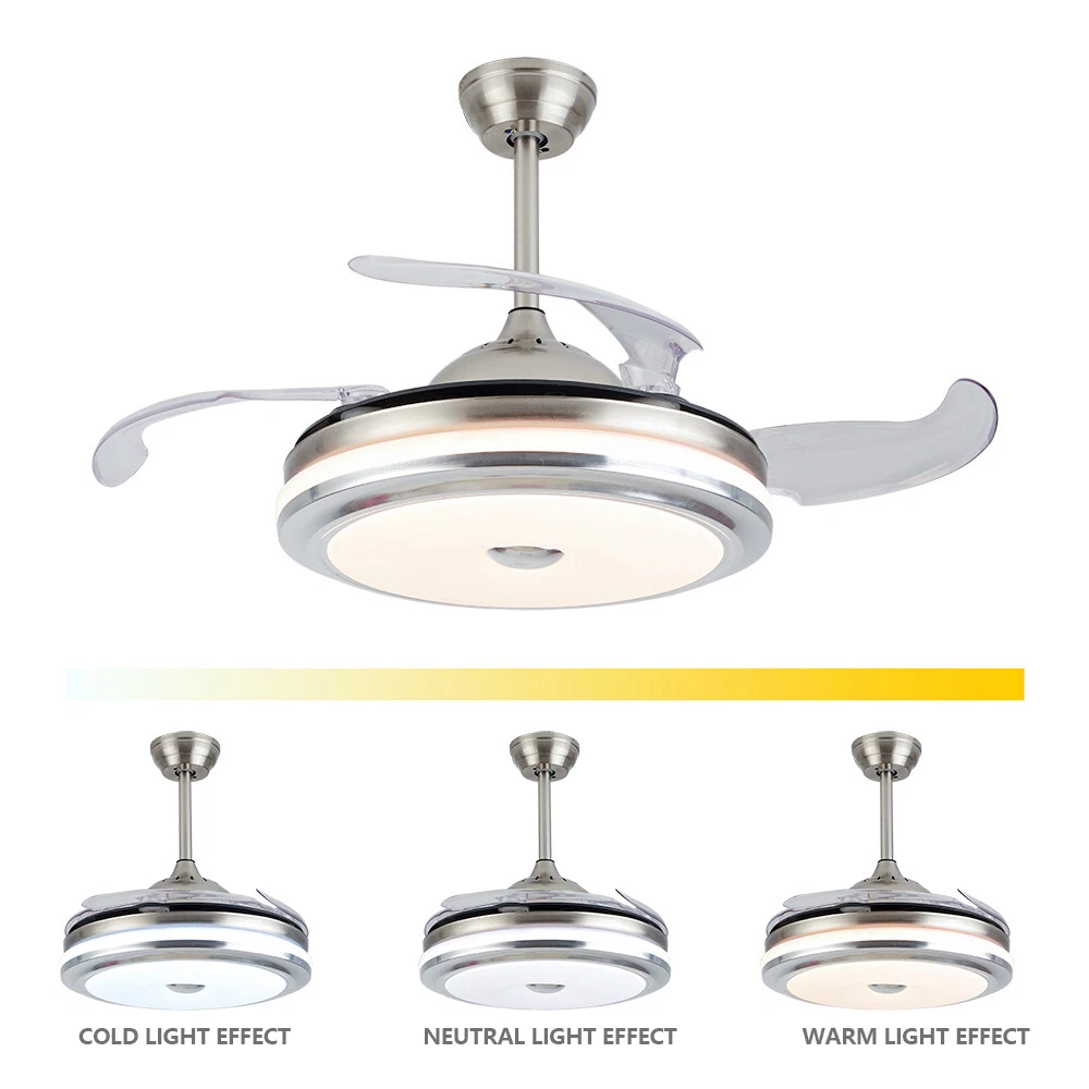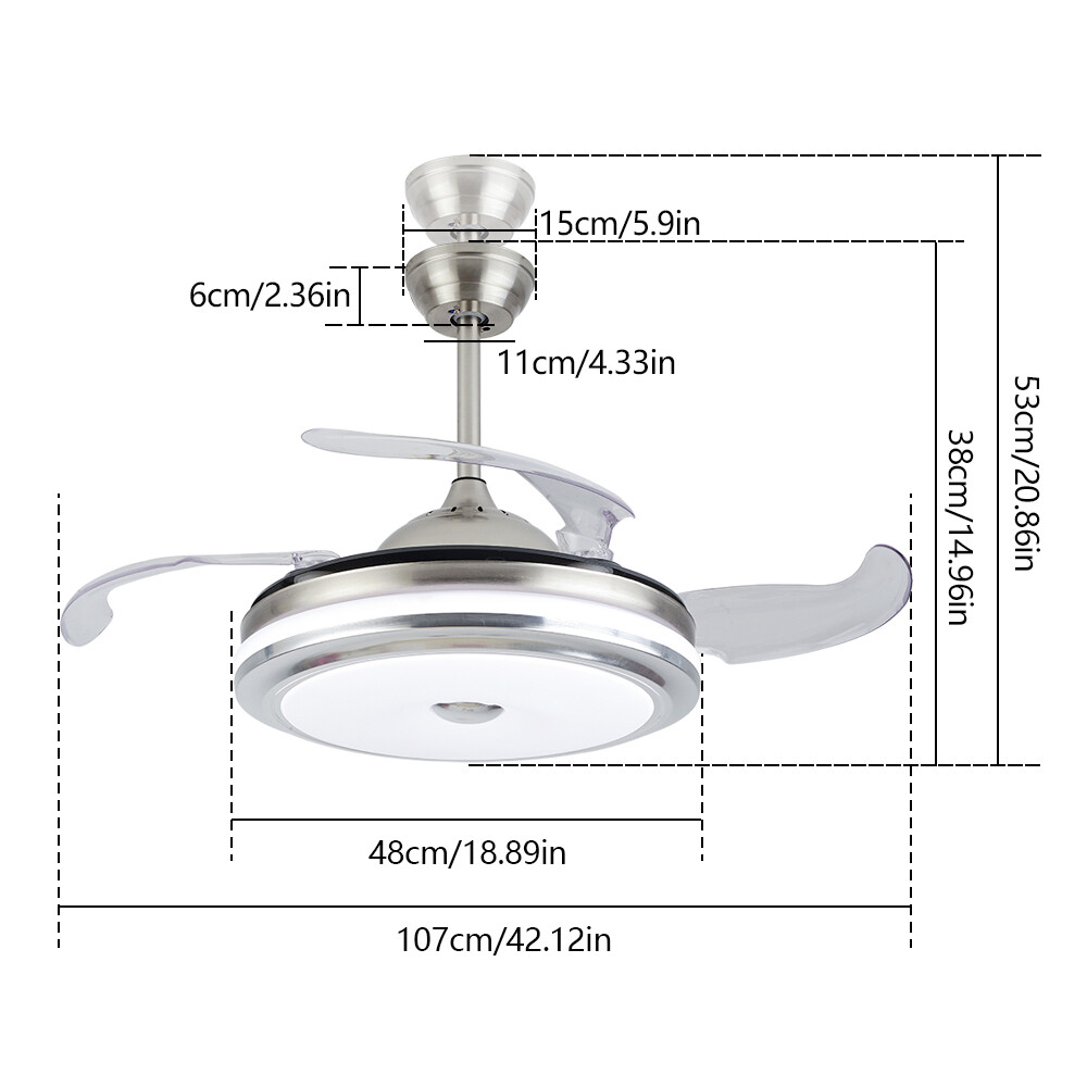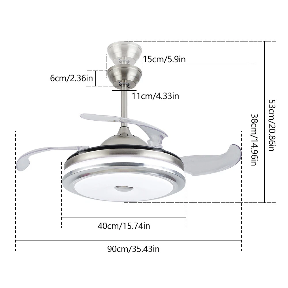 36"/42" Invisible Ceiling Fan Lamp Remote Control Dimmable LED Chandelier Light Specifications: LED color: 3 color(white,warm white,neutral white ) Material: Metal+ABS fan Motor: high-quiet motor Fan blade; 4 leaf plastic fan blade Dimensions: Diameter 36" , height 10cm(20cm spare parts) Diameter 42" , height 10cm(20cm spare parts) Color: chrome Lamp: 36 watt Bulb: led Voltage: 110V Use For:Living Room / Bed Room/ Study Room /Restaurant Package: 1 light+RC control Modern invisible fan chandelier: Fan and chandelier combined into one with remote control, automatic telescopic fan blade, LED lamp beads Ceiling fan with remote: . Dimmable LED lights have 3 color changes (White-Warm-Yellow), Fan has 3 speed settings (Low-Mid-High). All these functions can be easily contr 42inch/36inch Chandelier LED Ceiling Fan Light 3-Speed Pendant Lamp & Remote 36W 36"/42" Invisible Ceiling Fan Lamp Remote Control Dimmable LED Chandelier Light Specifications: LED color: 3 color(white,warm white,neutral white ) Material: Metal+ABS fan Motor: high-quiet motor Fan blade; 4 leaf plastic fan blade Dimensions: Diameter 36" , height 10cm(20cm spare parts) Diameter 42" , height 10cm(20cm spare parts) Color: chrome Lamp: 36 watt Bulb: led Voltage: 110V Use For:Living Room / Bed Room/ Study Room /Restaurant Package: 1 light+RC control Modern invisible fan chandelier: Fan and chandelier combined into one with remote control, automatic telescopic fan blade, LED lamp beads Ceiling fan with remote: . Dimmable LED lights have 3 color changes (White-Warm-Yellow), Fan has 3 speed settings (Low-Mid-High). All these functions can be easily controlled by remote Modern Fan Light Chandelier: 42 inches when the fan is extended, and 19 inches when the fan blade is retracted. Bedroom Ceiling Fans Material: metal body + acrylic lamp cover + ABS retractable blades + pure copper motor(providing powerful air flow, quiet and durable. With vents, it can reduce the internal temperature of the main unit and extend the life of the motor.) Payment Delivery details Terms of sales About us Contact us Payment We accept ebay payment 。 Fees such as import duties, taxes are not included in the item price or shipping costs. These charges are the buyer's responsibility. Delivery details Shipping: 2-9 working days to: USA Terms of sales We maintain high standards of excellence and strive for hundred percent customer satisfaction. Feedback is very important to us. We hope that you contact us immediately before you give neutral or negative feedback, so that we can address your concerns. It is impossible to address issues if we do not know about them! About us Your satis faction is our ultimate goal. We work hard to earn your trust and future business. Our certified technicians have tested each item before shipping. The unit comes with 1 year limited warranty on all manufacturing defects. a) If you receive a defective item, you may return it or ask for a discount. Please contact us within 14 days after you receive the package. b) What you returned must be intact and in its original packaging as re? u. Customer is responsible for shipping costs of the returned item. c) We will cover the cost of shipping back t with the shipping rate indicated in the registration page. We will send you a new unit or refund the full payment you paid. Thank you. Contact us Business Hour Business Hour: Monday To Friday: 8:30 AM to 5:00 PM (Beijing China time) Due to time zones, our reply to your questions may not be immediately. But within above working time, we will reply your email within 24 hours. If it's non-workdays, please kindly be patient and wait till Monday. Please contact us with ebay message. Please feel free to contact us if you have any questions. Monday To Friday: 8:30 AM to 5:00 PM (Beijing China time) Due to time zones, our reply to your questions may not be immediately. But within above working time, we will reply your email within 24 hours. If it's non-workdays, please kindly be patient and wait till Monday. Please contact us with ebay message. Please feel free to contact us if you have any questions.