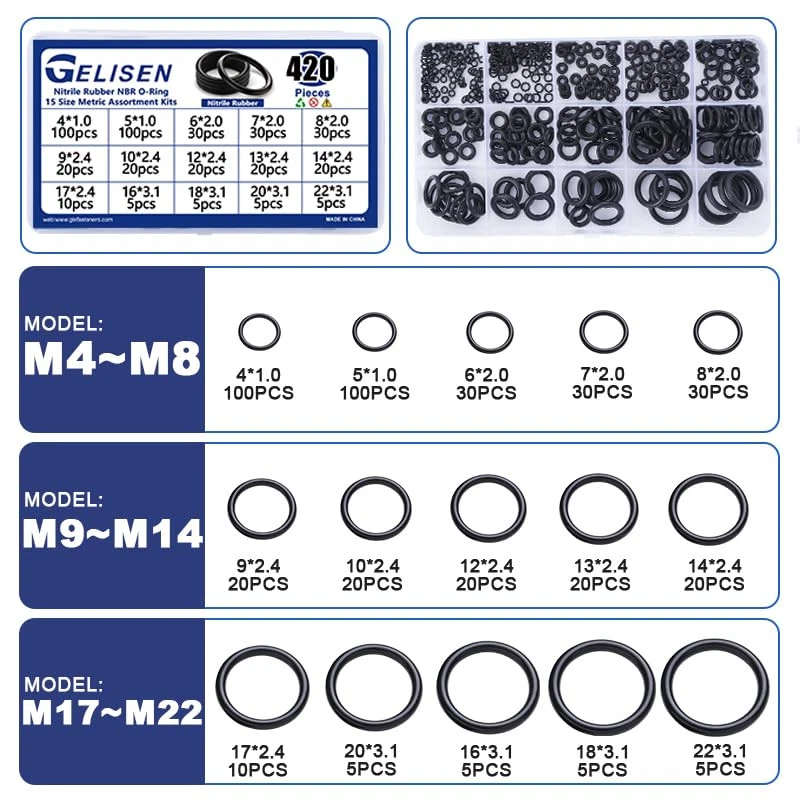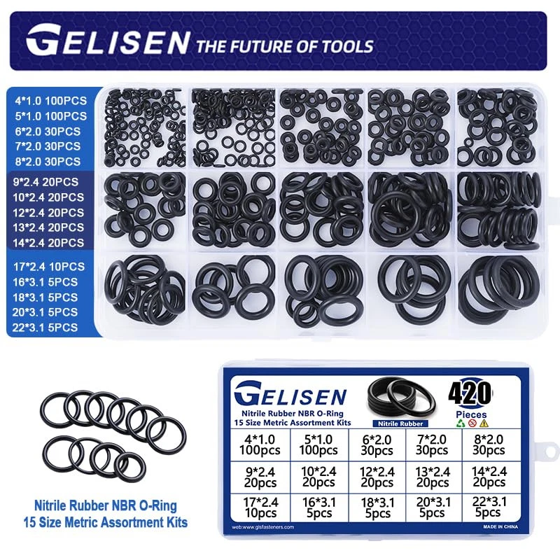 420Pcs Nitrile Rubber O-Rings Kit 15 Sizes Universal NBR O-rings Product Details Package Dimensions : 7.56 x 5.16 x 1.22 inches; 3.53 ounces Manufacturer : Gelisen Country of Origin : China Material: Rubber Brand: Gelisen Color: 420Pcs O-rings Manufacturer: Gelisen Number of Pieces: 420 【Gelisen Combination】NBR O Ring Kit Outer diameterΦ4-Φ22 Thickness 1.0mm-3.1mm Total 15 sizes 420 Pieces, different sizes and enough quantities can meet your different daily needs. 【Wide Application】Gelisen NBR O-Ring Kit is suitable for sealing and repairing faucets, pipes, high-pressure washers, hose nozzles, sinks, filters, hydraulic oils, automotive engines, kitchen and bathroom water fittings. 【High Quality】Nitrile Rubber O-Ring Assortment Kit is made of high-quality commercial-grade black Nitrile with a smooth surface,excellent high and low-temperature resistance,maintaining good elasticity and having the advantages of ozone resistance and weather resistance. 【Pocket Box】All Rubber washers are packed in a transparent plastic pocket box for easy carrying.Each o rings rubber size has a specific small space to avoid mixing. 【Quality Service】: If you are not satisfied for any reason, please contact us directly, Gelisen offer a replacement or refund. No hassles, no delays. Warning: CHOKING HAZARD -- Small parts Not for children and kids. Warm tip: For better fixation, suggest lock both ends of the guide wire with vise, pliers or compression tools.