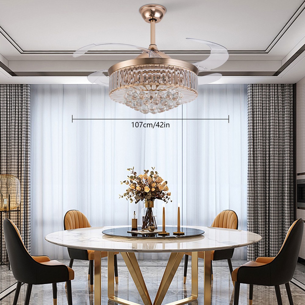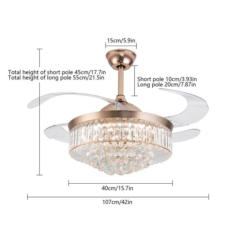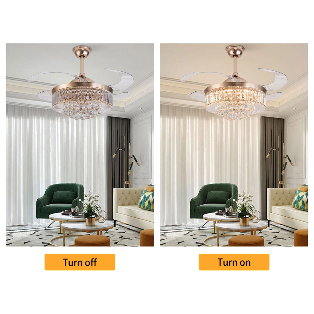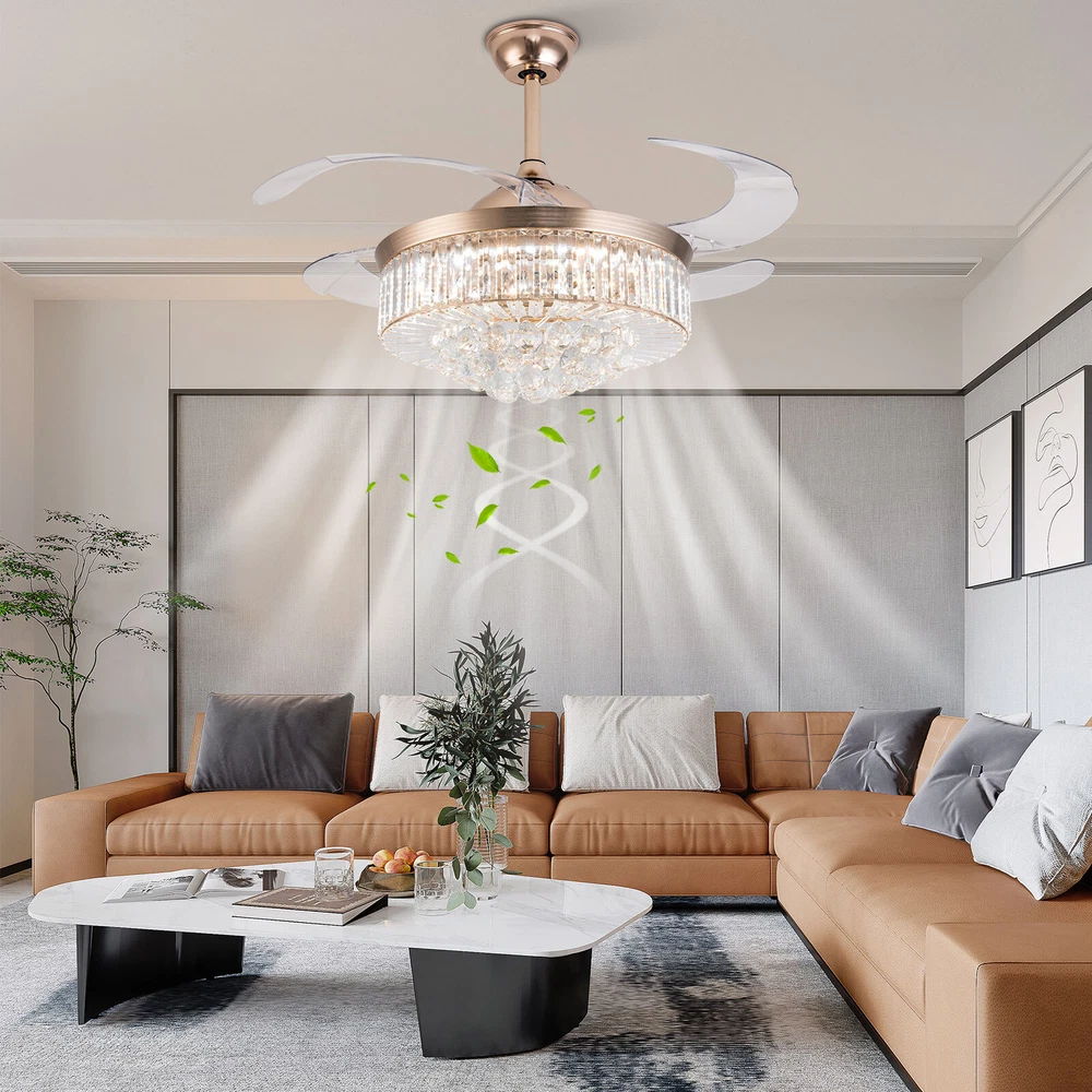 This stunning 42" chandelier-fan combo is a game-changer! The elegant crystal design adds instant luxury while the LED lighting offers adjustable warmth. I love controlling both fan speed and light color from the remote - perfect for setting any mood. The sturdy construction feels premium, and it installs easily in most ceilings. The invisible blades are genius, keeping the elegant look when off while moving great air on low noise. Three color temperatures let me go from bright task lighting to cozy ambiance. Beautiful and functional - what more could you want?