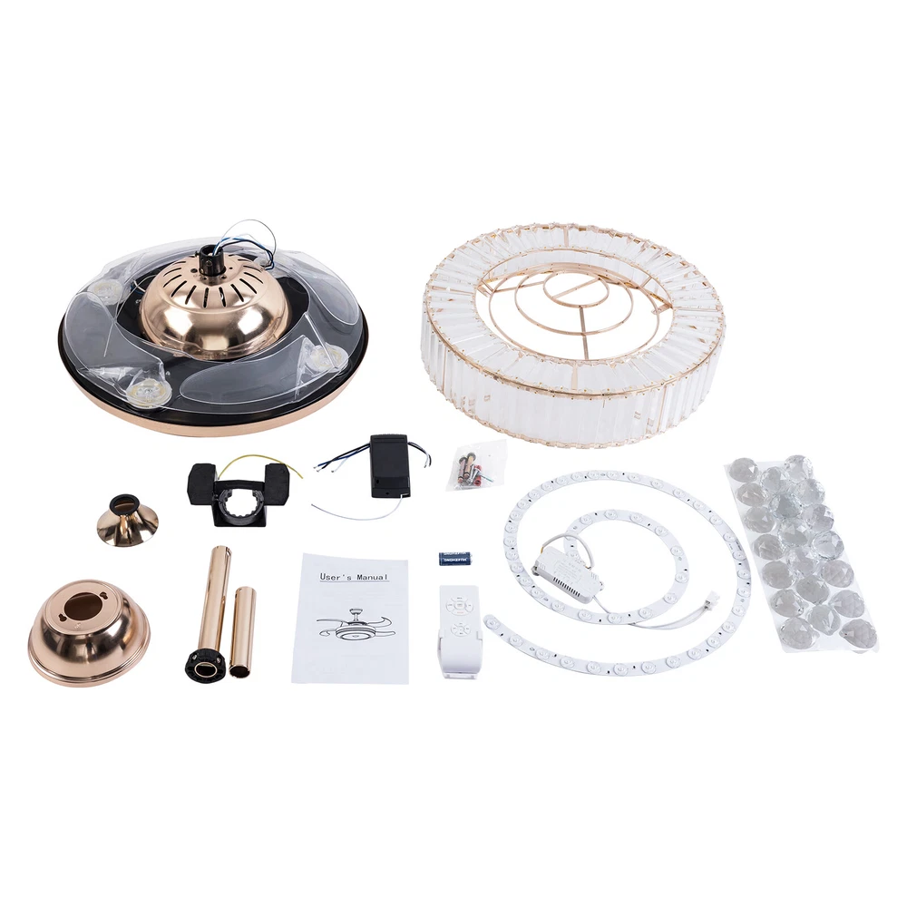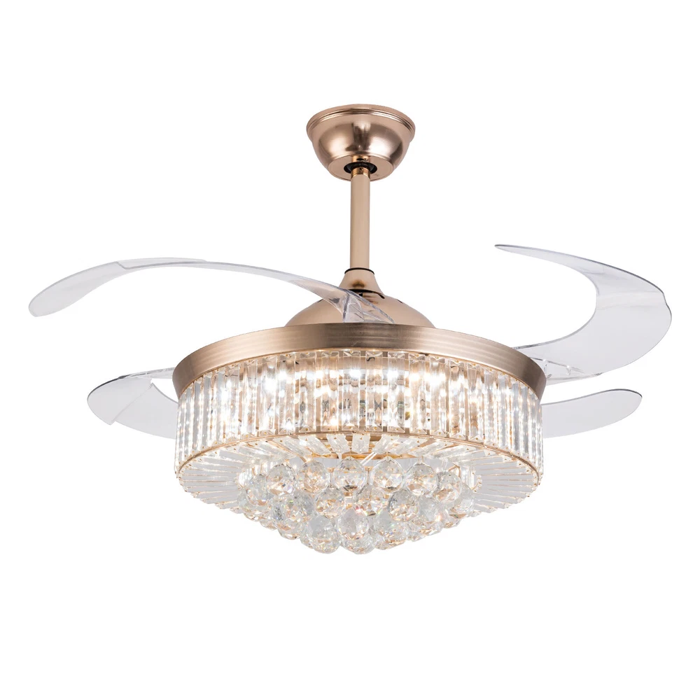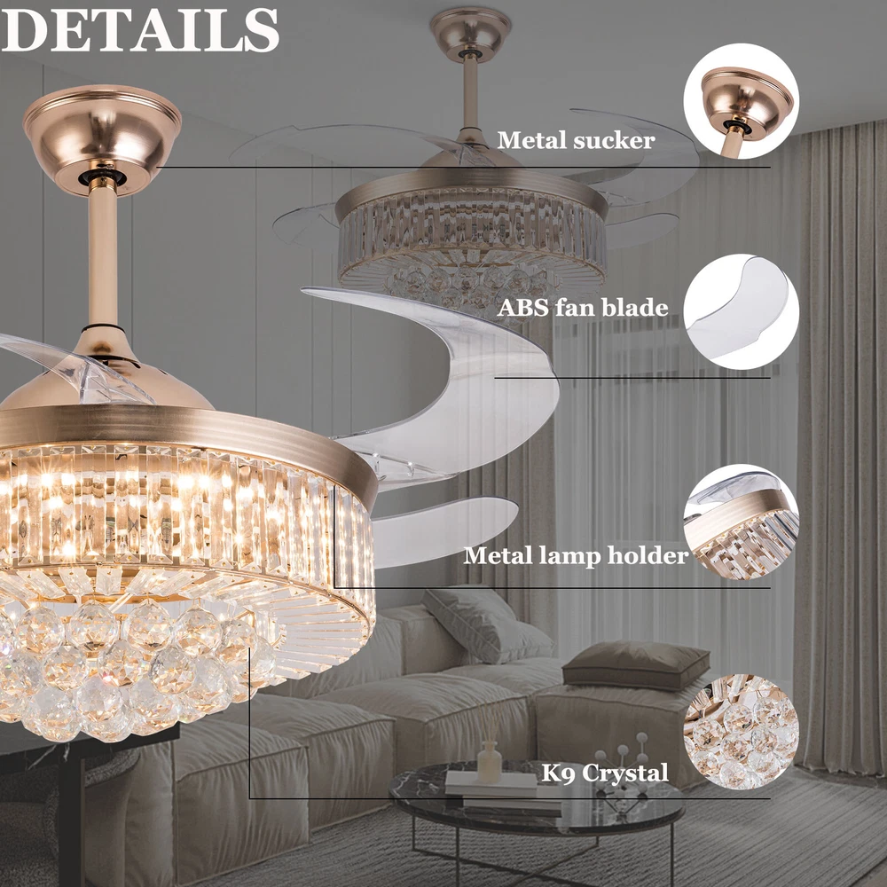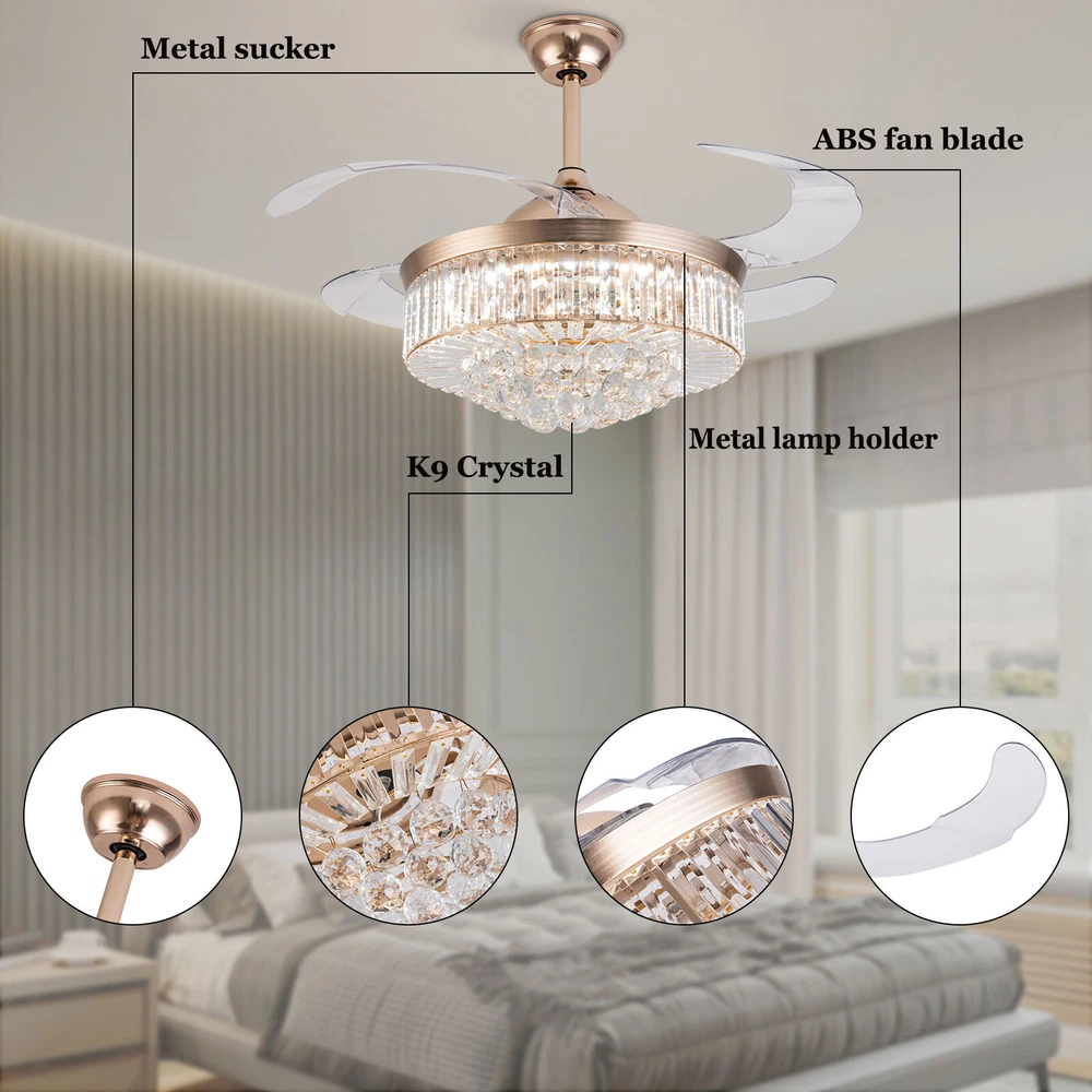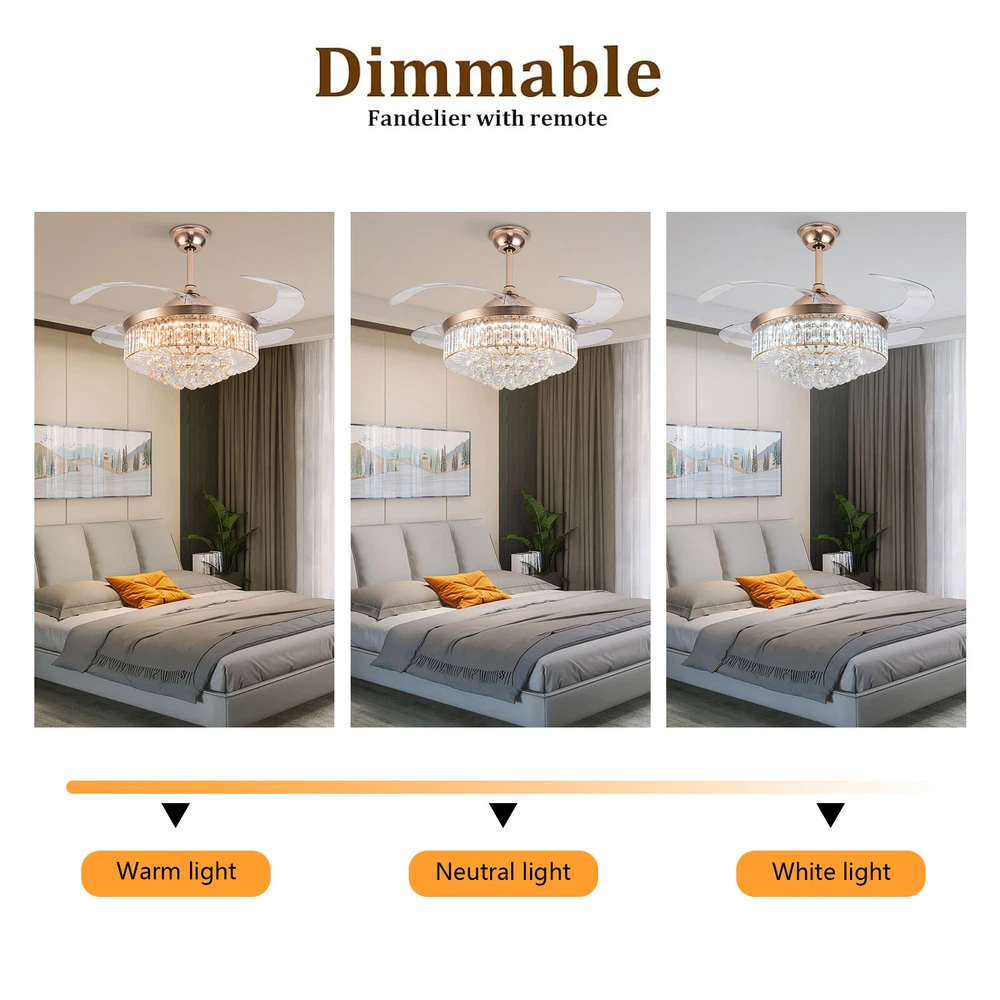 This stunning 42" chandelier-fan combo is a game-changer! The elegant crystal design adds instant luxury while the LED lighting offers adjustable warmth. I love controlling both fan speed and light color from the remote - perfect for setting any mood. The sturdy construction feels premium, and it installs easily in most ceilings. The invisible blades are genius, keeping the elegant look when off while moving great air on low noise. Three color temperatures let me go from bright task lighting to cozy ambiance. Beautiful and functional - what more could you want?