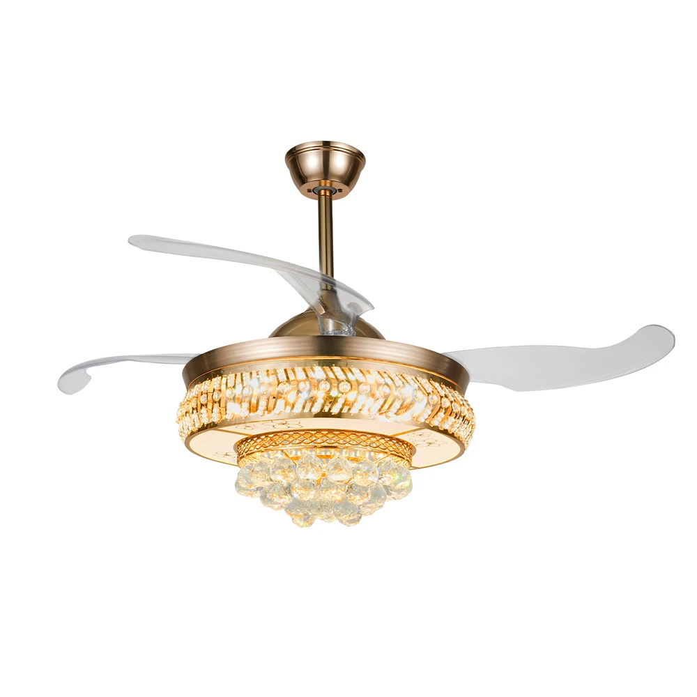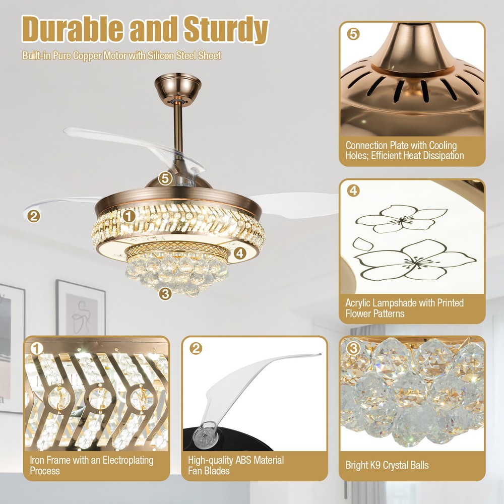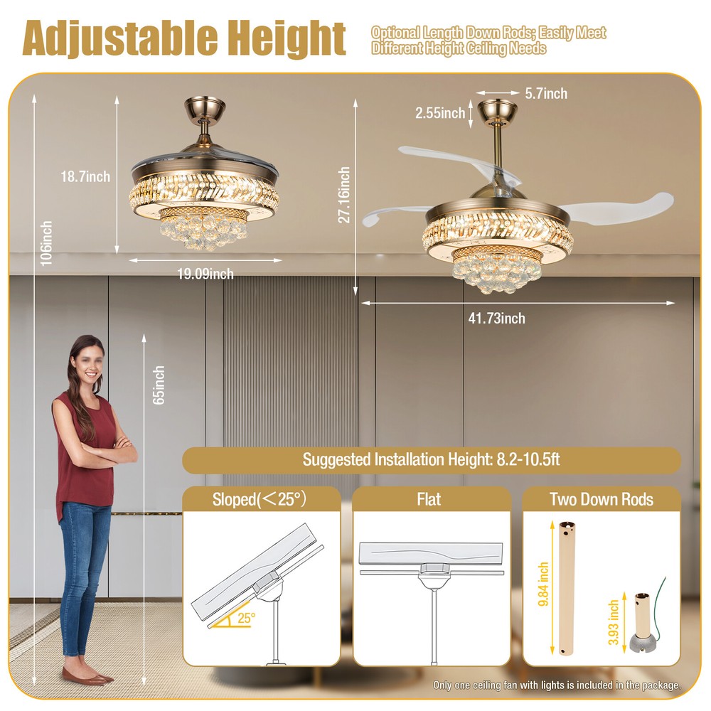 【Remote Control】Integrating turn on light with 3 color changes (white, warm white, neutral white)you can use the remote control to choose the color you like. 【Crystal desige】 the 3-layer body is all decorated with K9 crystal and absolutely stunning when the light is on. Light effect makes your room full of luxury. 【Ceiling Fan】With ABS blades, It can be used as an electric fan, and it can also be used for lighting 【Applications】Ideal for living room, dining room, foyer, villa, bedroom, restaurant, study room, and other places to decorate lighting fixtures. 【Customer Service】If you have any issues, inquiries or need assistance, please feel free to contact us, we will try our best to help you. Style: Modern Type: Ceiling Fan Chandelier Light Source: Led Lighting Board(Include) Switch: remot 42" Luxury Ceiling Fan Light w/ Remote Control LED Fan Lamp Chandelier Fixture ❤Welcome❤ Description The shining lights on the ceiling of your home are also one of the expressions of your aesthetics and taste, and this crystal ceiling fan with lights is your good choice! The unique gold frame, K9 crystals, and ABS material fan blades look elegant and poised, making this product a highlight of your home. The bright and energy-efficient LED strip provides a large enough lighting area to meet your daily lighting needs. With the simple operation of the remote control, you can easily create a cool and bright space. Key Features Durable and Sturdy: An iron frame with an electroplating process, high-quality ABS material fan blades, bright K9 crystal balls, a white acrylic lampshade with printed flower patterns, and a built-in pure copper motor with silicon steel sheet make it more anti-corrosive , wear-resisting , durable and sturdy. Dual Control: You can use the wall switch(not included) to control the lights, or use the equipped remote control to turn on/off the lights and fan within a range of 32ft. Adjustable Wind Speed&Time: Three different fan speeds(low/middle/high) can be set through the remote control, giving a customized experience. Also, the intelligent timing function allows automatically turning off the fan after 1h, 2h, or 4h. Excellent Lighting Effect: The white acryl ic lampshade with flower patterns has a stronger transparency, plus a 107.63-258.33ft ² large illuminated area and three different light colors of 3000-6000K(cold/warm/neutral light), stunning when only turning on the lights and making your room full of luxury and modern sense! Optional Height: Our package contains two down rods (3.93 inches, and 9.84 inches in length), which are suitable for rooms with ceiling heights ranging from 8.2 to 10.5 feet. You can choose the more suitable one to use based on the height of the ceiling in your room. Retractable Design: The ABS material fan blades can automatically stretch/shrink when turned on/off. This design saves space when turned off and makes it stunning for your guests because of the retractable techiness. Low Noise: The noise emitted by the pure copper motor during operation is only about 30 decibels, which does not easily affect you or others. User-friendly Design: Compared with traditional incandescent bulbs, it adopts the LED strip, which can maintain soft, strobe-free lighting effects and bring you higher brightness with lower energy consumption, saving your electricity bills and protecting your eyes. Details Ceiling Plate: It measures 5.7*2.55 inches, increasing the contact area with the ceiling, so that the lamp body is firmly fixed on the ceiling and not easy to fall. Small Indicator: It can help you to have a better grasp of its current operation status and avoid operational errors. Mute Button: During operation, it can help you turn off the sound at key presses and enjoy the quiet environment. Cooling Holes: The cooling holes on the connection plate help timely heat dissipation and reduce noise to a certain extent. Application This crystal ceiling fan with lights is suitable for home and commercial spaces with a ceiling height of 8.2 to 10.5 feet, such as living rooms, restaurants, bedrooms, foyers, farmhouses, bars, galleries, exhibition rooms, hotels, coffee shops, terraces, study rooms, attics, etc, providing 107.63-258.33ft ² of lighting space. Specifications Material: Iron, ABS, Copper, K9 Crystal, Acrylic, Silicon Steel Sheet Color: Gold Remote Control: Yes Assembly Required: Yes Surface Treatment: Electroplating Process; Printed Installation Type: Ceiling Mount Indoor/Outdoor Usage: Indoor Power Source: Corded Electric Control Method: Remote, Wall Switch(Not Included) Battery Type: AAA (Included) Lighting Source: LED Strip Light Color: Cold Light (6000K), Warm Light (3000K), and Neutral Light Timing Function: 1/2/4h Wind Speed: Low, Medium, High Noise: About 30dB Voltage: 110V Max Lighting Power: 36W*2 Fan Power: 65W Remote Control Distance: Within 10m/32ft Illumination Area: 10-24㎡/107.63-258.33ft ² Suggested Installation Height: 2.5-3.2m/8.2-10.5ft Long Down Rod Length: 25cm/9.84inch Short Down Rod Length: 10cm/ 3.93inch Ceiling Plate Size(D*H): 14.5*6.5cm/5.7*2.55inch Gross Weight: 14kg/30.86lbs Net Weight: 12.4kg/27.33lbs Product Size After Unfolding Fan Blades (D*H): 106*69cm/41.73*27.16inch Product Size After Unfolding Fan Blades (D*H): 106*47.5cm/41.73*18.7inch Product Size After Folding Fan Blades (D*H): 48.5*69cm/19.09*27.16inch Product Size After Folding Fan Blades (D*H): 48.5*47.5cm/19.09*18.7inch Package Size: 54.5*53.5*30cm/21.45*21.06*11.81inch Package Included 1*Crystal Ceiling Fan with Lights 1*Remote Control 2*AAA Batteries 1*English Manual All Accessories for Assembly Notes Please carefully read the manual and strictly follow the precautions to have a better experience. It can be installed on a horizontal or inclined ceiling(<25°). Professional installation is recommended. Please do not power on until your fixture is fully assembled. Please allow the slight color difference caused by the shooting light and 1-3cm error du
