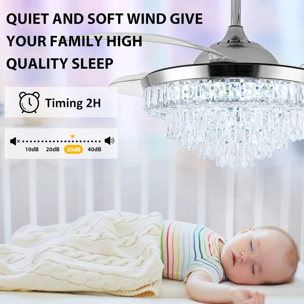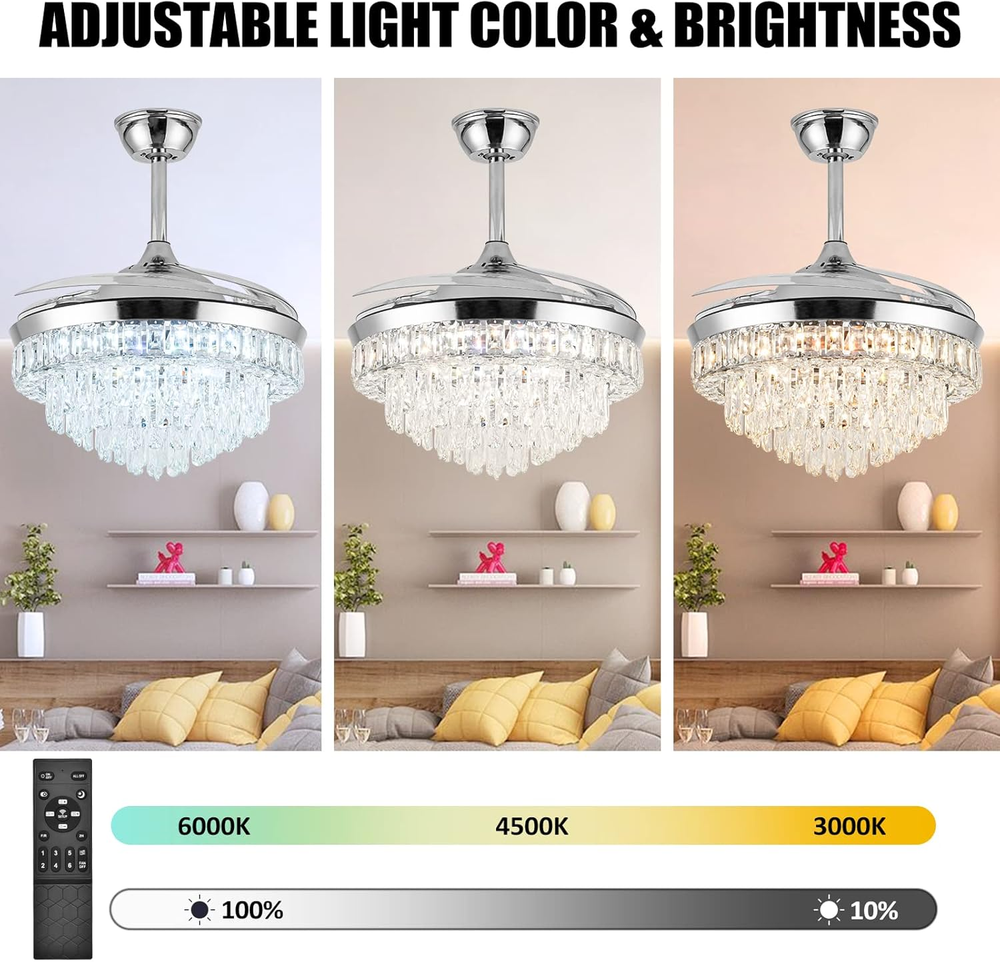 Store New Arrivals Add to Favorite View Feedback Contact Crystal Ceiling Fan with Light,42Inch Luxury Chandelier, Modern Stepless Dimmable Chandelier Ceiling Fan 6 Speed Indoor Fandelier Retractable Blade for Bedroom Living Room Dining Room Description Light Source Type LED Item model number 23 Style Modern Number of Items 1 Power Source Corded Electric Number of Light Sources 1 Control Method Remote Embellishment Crystal Batteries Included? No Lighting Method Remote Controller Type Remote Control Unit Count 1.0 Count Room Type Bedroom, Living Room, Dining Room Finish Chrome Finish Assembly Required Yes Installation Type Semi Flush Mount Material Metal Efficiency energy efficient Switch Type Remote Model Name Ceiling Fans Finish Type Chrome Finish Specific Uses For Product Home Included Components Remote Item Package Quantity 1 Indoor/Outdoor Usage Indoor Brightness Adjustable (10% to 100%) Country of Origin China Light Color Cool White, Nature White, Warm White Water Resistance Level Not Water Resistant Batteries Required? No Item Weight 24.6 pounds Light fixture form Ceiling Special Features Remote Controlled Special Feature Remote Controlled Bulb Base E26 Medium Shade Color silver Mounting Type Ceiling Mount Color Silver4 Wattage 36 watts Voltage 110 Volts Plug Format A- US style Recommended Uses For Product Remote control, Retractable fan blades,Color temperature changes & adjustable,Brightness dimmable,6 fan speed, Reversable blades,Timer, Silent motor Shade Material Metal Fixture Type Non Removable Size 42Inch Product Dimensions 42"L x 42"W x 23.9"H Number Of Pieces 1 【Unique Crystal Ceiling Fan with Light】It's the perfect combination with a crystal ceiling fan and chandelier light.42-inch silver chandelier fan with top k9 round crystal, acrylic clear retractable blades*4, metal lamp body. A variety of decoration styles can be a perfect match. Crystal ceiling fan with natural soft wind provides a healthy and super quiet living environment for family 【Two Rotation Modes and 6 Speed】chandelier fan provides 6-Gear fan speed. Reversible fan blades keep your room cooler in summer and improve indoor air circulation in winter 【Dimmable Brightness and Adjustable Color Temperature】Dimmable light brightness from 10% to 100%, and color temperature can be gradually adjusted from 3000K to 6000K(warm white, nature white, cool white). The chandelier ceiling fan also has a timer function (2h automatically turns off). All functions can be controlled by remote control 【Retractable and Reversible Fan Blades】The acrylic invisible blades will automatically extend/retract when the crystal fandelier is turned on/off. Diameter 42" when extended and 20" when closed 【Customer Service】The appearance of the fandelier is exquisite, Suitable for Indoor living rooms, bedrooms, dining rooms, corridors, etc. The fan needs basic assembly skills, a professional would be highly recommended. Any questions, please leave us a message, and we will handle it immediately Notice: Only ceiling fans with light controlled by a remote have memory function( It means, you set up natural lights by remote control before you turn off the light. and when you open it again, you will get the same natural lights) Product Description Color Temperature Dimmable (3000K-6000k) Light Wattage 36W Voltage 110V Dimensions 42 Inch, 4 Retractable Blades Brightness Adjustable(10%-100%) Applicable area 100-300 sq.ft. Timing Function 2hours automatically close Light Source Type LED(Light Kit Included) ABOUT US We offer the best prices around on high quality products. Our E-store includes media such as books, movies, music and games while offering electronics, toys, sporting apparel, clothing, tools, general home, garden items and more. SHIPPING We are always working hard to ensure your package arrives as soon as possible. Please understand that some factors like weather, high postal traffic, and the performance of shipping companies are outside of our control. We offer free shipping to the lower 48 states and ship within 2 business days of payment, usually sooner. We do not accept P.O. Boxes. Please provide a physical address. For shipping outside of the continental USA, we only use eBay's Global Shipping Program.The item is shipped to KY and then sent to the rest of the world. International customers are responsible for all duties and taxes. Continue to check out in order to calculate costs for shipping the item to your country. Messages regarding eBay's Global Shipping Program MUST be directed at eBay EXCLUSIVELY. RETURNS We offer a 30-Day Return Policy on items which you are not completely satisfied with. You have the option for a full-refund or an exchange of the item. No returns are available on items shipped outside of the USA. PAYMENT We accept PayPal. CONTACT US This page content is yet to come Please ad us to your favorite seller and visit again later Thank You CUSTOMER SATISFACTION We try our very best to make sure every customer is completely satisfied. If there's a problem, message us! We're happy to help. WE ACCEPT Copyright © 2021 AutoDS. | All Rights Reserved