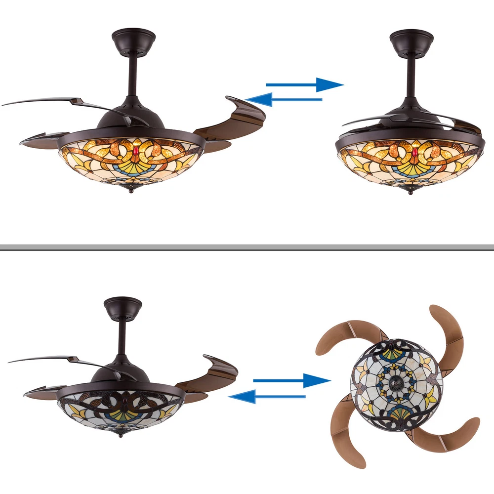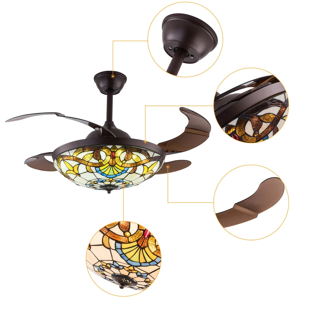 Specification Color temperature: CCT 3 light cycles Light source type: LED(Light Kit Included) Control: Remote Control Included Dimensions: 42 Inch, 4 Retractable Blades Light Wattage: 36W-48W Motor Wattage: 56W Speed: 6 Voltage: DC 110 -240V Average Service Life: 5~10 Years Suitable for rooms of 15-25 square meters. Installation Instructions ♥Please check the dimensions before ordering, just to ensure it is suitable for your room. ♥Ceiling Chandelier Suitable for Flat Roof Concrete Ceiling House, for Gypsum Board and Wood Ceiling, You Need to Buy a Remodeling Bracket; Identify and Connect Electrical Wires; Ceiling height is greater than 110", Lift 110 Pounds. 42"Stained Glass Ceiling Fan Light Tiffany Style Chandelier Fan Lamp w/Remote 🔥 42'' Tiffany Invisible Ceiling Fan w/LED Light Retro Stained Glass LED Chandelier HG-HCX7016-871US Product description ▶ Modern Invisible Fan Chandelier Fan and chandelier combined into one with remote control, automatic telescopic fan blade, LED lamp beads ▶ Modern Fan Light Chandelier 42 inches when the fan is extended, and 19 inches when the fan blade is retracted. Includes two lower bars, one for 4.8inches and the other for 9.8inches, you can choose one to install. ▶ Bedroom Ceiling Fans Material Metal body +Glass lamp cover + ABS retractable blades + pure copper motor(providing powerful air flow, quiet and durable. With vents, it can reduce the internal temperature of the main unit and extend the life of the motor. ▶ Pure Copper Mute Motor Quiet motor, create a comfortable space. Safe and Energy saving, long used life, strong power, Unique design Modern style. ▶ Energy Saving and Durable A combination of classic and innovative technology, new LED light source, life expectancy up to 50,000 hours, replaceable LED driver for convenient and durable use. ▶ Multi-Function Setting All operations can be controlled by the remote control, adjust the lighting switch of the ceiling fan (white light - warm light - yellow light), wind speed (low - medium - high), The fan or illumination can be turned on separately. ▶ Fandeliers with Remote The ceiling fan has 6 variable speeds and natural wind function. Two Fans Modes: Forward and reverse mode. Freely change the direction from downdraft mode during the summer to updraft mode during the winter. This retractable fan will keep you to stay comfortable throughout the year. ▶ Wide Application Mount Ceiling Fan with Light is perfect for cafes, restaurants, bedrooms, living rooms, children's rooms, kitchens, hotels, apartments, offices, corridors, shops, etc. Color temperature: CCT 3 light cycles Light source type: LED(Light Kit Included) Control: Remote Control Included Dimensions: 42 Inch, 4 Retractable Blades Light Wattage: 36W-48W Motor Wattage: 56W Speed: 6 Voltage: DC 110 -240V Average Service Life: 5~10 Years Suitable for rooms of 15-25 square meters. Installation Instructions ♥ Please check the dimensions before ordering, just to ensure it is suitable for your room. ♥ Ceiling Chandelier Suitable for Flat Roof Concrete Ceiling House, for Gypsum Board and Wood Ceiling, You Need to Buy a Remodeling Bracket; Identify and Connect Electrical Wires; Ceiling height is greater than 110", Lift 110 Pounds. What you get Ceiling fan x 1 Screws sets x 1 Down rods x 2 (12CM & 25CM) Remote control x 1 Instruction Manual x 1 Suggestion Note: The Fan is Reversible. 1️⃣For a safe and secure installation, please ensure that the electrical box to which this fixture will be mounted is properly attached to a structural member of the building. 2️⃣All wires are connected. When unpacking, be careful not to pull with wires as a bad connection may result. 3️⃣Do not connect electricity until your fixture is fully assembled. Payment Delivery details Terms of sales About us Contact us Payment We accept ebay payment 。 Fees such as import duties, taxes are not included in the item price or shipping costs. These charges are the buyer's responsibility. Delivery details Shipping: 2-9 working days to: USA Terms of sales We maintain high standards of excellence and strive for hundred percent customer satisfaction. Feedback is very important to us. We hope that you contact us immediately before you give neutral or negative feedback, so that we can address your concerns. It is impossible to address issues if we do not know about them! About us Your satis faction is our ultimate goal. We work hard to earn your trust and future business. Our certified technicians have tested each item before shipping. The unit comes with 1 year limited warranty on all manufacturing defects. a) If you receive a defective item, you may return it or ask for a discount. Please contact us within 14 days after you receive the package. b) What you returned must be intact and in its original packaging as re? u. Customer is responsible for shipping costs of the returned item. c) We will cover the cost of shipping back t with the shipping rate indicated in the registration page. We will send you a new unit or refund the full payment you paid. Thank you. Contact us Business Hour Business Hour: Monday To Friday: 8:30 AM to 5:00 PM (Beijing China time) Due to time zones, our reply to your questions may not be immediately. But within above working time, we will reply your email within 24 hours. If it's non-workdays, please kindly be patient and wait till Monday. Please contact us with ebay message. Please feel free to contact us if you have any questions. Monday To Friday: 8:30 AM to 5:00 PM (Beijing China time) Due to time zones, our reply to your questions may not be immediately. But within above working time, we will reply your email within 24 hours. If it's non-workdays, please kindly be patient and wait till Monday. Please contact us with ebay message. Please feel free to contact us if you have any questions. Type Chandelier Features Dimmable Feature 1 Easy installation, Convenient Use, Easy Operation Feature 2 Creative Design, Durable Ma