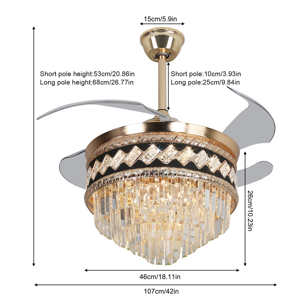 42In Ceiling Fan With Lights, Remot, Led Light 6 Gears 3000k-4500k-6000k Color Description This 42-inch ceiling fan light combines aesthetic and functional considerations, not only adding the finishing touch to the home environment but also interpreting the pursuit of quality living. The round lampshade, combined with beautiful decorations and clear glass pendants, cleverly enhances the sense of hierarchy in the space, like a light shower of moonlight, with every inch of halo soaked in elegance. Quickly bring this excellent product home and make life better because of its existence! Key Features Build to Last : Premium hardware, glass, artificial leather, and superb electroplated process make the product resistant to rust, wear, corrosion, and fade, thus reducing the frequency of replacing the lamps. Excellent Light Source: The environment-friendly and energy-saving LED light source with warm, neutral, and white light colors at different color temperature ( 3000K-4500K-6000K) provides soft and variable illumination modes without glare and stroboscopic, effectively protects your eyes, restores the most authentic color of objects, and saves your costs. Adjustable Speed & Time : It has 6 gears of wind speed and you can choose low speed to enjoy the comfortable breeze or high speed to cool down quickly. Meanwhile, you can set up its working hours (1/2/4 hours) before sleeping, so you don't have to worry about catching a cold or wasting electricity. Healthy and Energy-saving: The ceiling fan light provides more comprehensive air circulation and cooling, thereby reducing the frequency and time of air conditioning use, saving energy, and reducing expenses. It can avoid direct blowing and reduce the risk of air conditioning diseases. Two-way Rotation: The normal mode of the fan can bring coolness in summer. You can also reverse the direction of the fan in winter, blowing hot air from the top into the room and increasing the indoor temperature. High Adaptability: You can choose to install any of the 2 equipped lamp poles of 3.93" and 9.84" in height according to your needs. Its wide voltage design(90-260V) makes it adapt to different voltage environments. Convenient to Use : Remote control allows you to easily adjust the fan and light at a distance of <32.8ft, bringing more convenience to your life. Stylish Appearance : The circular design, shiny gold paired with modern black colors, dazzling glass pendants, and clear fan blades are simple and elegant. The fan and light are well matched, neither blocking the lighting nor weakening the wind force, making it a stunning addition to your home decor, creating a romantic space for you. Protective Package: To prevent the product from being damaged during transportation, we packed it with foam to protect your products to the maximum extent possible. Details Upgraded Blades: 4 fan blades adopt an aerodynamic design, providing a stable and powerful air supply with low noise. They will be hidden when not in use, which can avoid accidents caused by getting caught in the blades, making them much safer than traditional fans. Stable Base : The round base increases stress area, ensures stable support for the light body, and presents classic beauty. Pure Copper Motor: It has stable performance, low-temperature rise, and low noise, providing a quiet working and sleeping environment. Application With an applicable area of about 161.46ft², it is suitable for a bedroom, living room, study, reading room, cafe, store, bar, office, lounge, library, club, hotel, kindergarten, and so on. It is not only suitable for indoor lighting but also can be used as a ceiling fan. Specifications Model: CJ 130 Material: Hardware, Glass, Artificial Leather Process: Electroplated Color: Gold, Clear, Black Shape: Round Style: Modern Efficiency: E Assembly Required: Yes Indoor/Outdoor Usage: Indoor Mounting Type: Ceiling Mounted Motor Type: Pure Copper Motor Control Type: Remote Control(Included) Battery Type: 2* AAA Batteries(Included) Remote Control Distance: 10m/32.8ft Light Color: Warm, White, Neutral Light Source: LED(Included) Color Temperature: 3000K-4500K-6000K Number of Fan Blades: 4 Timing: 1/2/4h Wind Speed Gears: 6 Voltage: 90-260V Light Power: 38W Motor Power: 35W Applicable Area: 15m²/161.46ft² Product Diameter: 107cm/42in Chasis Diameter: 15cm/5.9in Lampshade Size(D*H): 46*26cm/18.11*10.23in Rod Length: 10cm/3.93in, 25cm/9.84in Total Product Height(With Short Rod): 53cm/20.86in Total Product Height(With Long Rod): 68cm/26.77in Package Included 1* Ceiling Fan Light 1* Remote Control 1* English Manual All Accessories for Assembly Notes Please check the dimensions of the product before ordering to ensure it fits your home. Please read the operating manual completely before use. And pay particular attention to the safety instructions included. Please make sure that the ceiling construction is completed and is free of leakage before the installation of the luminaire. Please do not install the light next to the air conditioner or heater to avoid rusting due to moisture, which will affect the service life of the light. Please wear electric insulation gloves(not included) and avoid scratching the surface of the lamp and the electric wire when installing. Please make sure that the power supply has been cut off before installation, and conduct a power test before installation. Please install it by a licensed electrician if necessary. Please use the light within the applicable voltage range and clean the light regularly. Please cut off the power supply when you clean the light. Please allow the slight color difference caused by the shooting light and 1-3 cm error due to manual measurement, and make sure you do not mind before ordering. Payment Delivery details Terms of sales About us Contact us Payment We accept ebay payment 。 Fees such as import duties, taxes are not included in the item price or shipping costs. These charges are the buyer's responsibility. Delivery details Ship