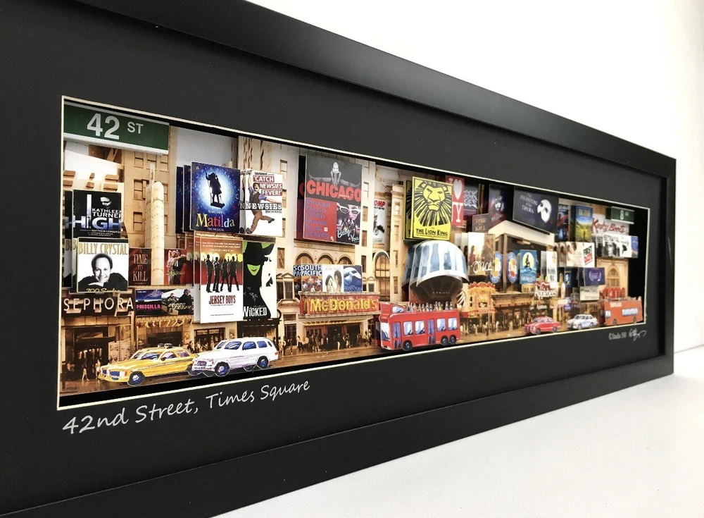 This one-of-a-kind 3D paper cut artwork depicts the iconic 42nd Street in New York City, featuring LED lights that bring the scene to life. Measuring 24 inches in width, 10 inches in height, and 1 inch in depth, this piece is framed and ready to hang. The artwork is handmade and signed by artist Ge Wang, who created a detailed 3D representation of the street, complete with copyrights and a certificate of authenticity. This piece is perfect for any art enthusiast or lover of New York City, and would make a great addition to any collection.