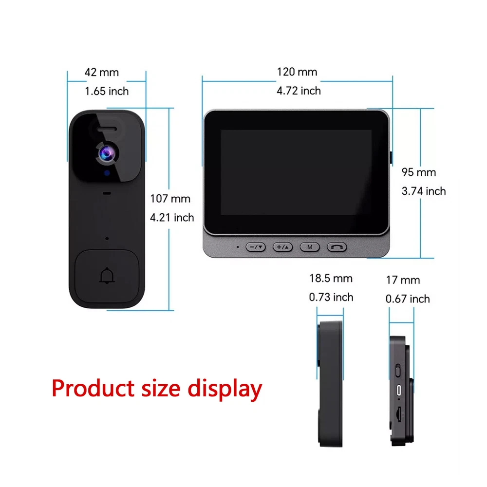Product Detail: Note:If you have any questions, please contact us before open any case, we promise will solve the problem for you. Thanks! Features: *4.3-inch Large Screen: Easily view the situation outside the door with a clear glance, no need to fix it behind the door, allowing freedom of movement. *Long Battery Life: Built-in large-capacity lithium battery, ultra-long battery life. It is recommended to use the screen with power plugged in, and the continuous use time of the screen without power plugging in is: 2H. *High Definition Video: Utilizing 300,000 high-definition pixels, it provides clear and detailed recordings of visitors' faces and items at the door. *Wireless Two-Way Intercom: With a 2.4G wireless signal, the doorbell and display screen can communicate in real-time, eliminating the need for wiring or WiFi. *Easy Installation: The device can be easily installed without the need for drilling holes and supports both and punching installation methods. Specifications: *Product Name:Smart video doorbell *Material:ABS *Size:Doorbell: 107*42mm, Display: 120*95mm *Color:black *Battery capacity: doorbell 800mAh, display 400mAh *Charging method: TYPE-C charging *Power supply voltage: 5V 1A *Display: 4.3 inches Package Content: 1 x Doorbell 1 x Display 1 x Charging cable 1 x Mounting sticker 1 x Screw 1 x Instruction manual Note: 1. The real color of the item may be slightly different from the pictures shown on website caused by many factors such as brightness of your monitor and light brightness. 2. Please allow slight manual measurement deviation for the data. Note: 1. Please allow minor deviation due to manual measurement. 2. Due to the difference between different monitors, the picture may not reflect the actual color of the item. 3. Communication is the best way to solve the problem. If you have any problems after purchasing, please contact us in time, before opening return or case. Payment: We accept PayPal ONLY currently. Payment must be made within 3 business days. Shipping: 1. Item will be shipped within 1-5 business days from CN Stock or US Stock according to the item location. 2. Sometimes the ship date will be delayed due to a shortage. We will inform you via message. 3. Please leave available address and phone # in delivery information. Seller are not responsible for wrong address. 4. Please indicate your personal requirement such as colors, packages, value of declaration etc. at PayPal's message when make payment. 5. We will NOT responsible for any delay during delivery including but not limited to customs postage checking, strike, force measure etc. Customs Declaration: Import duties, taxes and charges are not included in the item price or shipping charges. These charges are the buyer’s responsibility. Please check with your country’s customs office to determine what these additional costs will be prior to biddingying. Return & Refund: Returns are accepted within 30 days. Please read the item description and check the pictures carefully before bidding. Return or refund is available only if item DOA or there's error in item description causing the item not fitting your need. In such cases, seller pays for all related shipping cost if any. Returns are also acceptable if buyer purchased this by mistake and item still in good condition for reselling. Buyer is responsible for all related shipping cost. Feedback: As long as you are happy with your purchase, please kindly leave us for it is very important for our store performance. If there is any problem with your order, please contact us and give us a chance to resolve your problem Before leaving us a negative feedback.