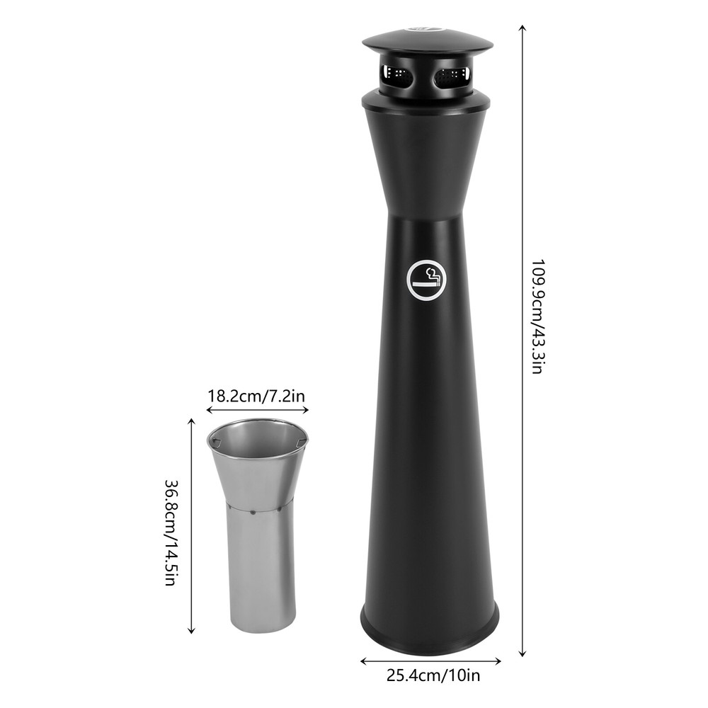 Description Littering cigarette butts in public places may cause potential safety hazards. To avoid this, our cigarette end collector with an inner barrel is the ideal choice for you. It can be set up in public smoking areas, your home, and anywhere else there is a need. With its elegant appearance, it blends into the surrounding environment, silently advocating a more civilized and environmentally friendly lifestyle, inviting every passer-by to participate in this green revolution of respect and love. Package Included 1* Cigarette End Collector with Inner Barrel welcome Description Littering cigarette butts in public places may cause potential safety hazards. To avoid this, our cigarette end collector with an inner barrel is the ideal choice for you. It can be set up in public smoking areas, your home, and anywhere else there is a need. With its elegant appearance, it blends into the surrounding environment, silently advocating a more civilized and environmentally friendly lifestyle, inviting every passer-by to participate in this green revolution of respect and love. Key Features Sturdy and Durable: 201 stainless steel with a baking paint process makes this product resistant to corrosion, rain, and rust, and not easy to deform, so it can be used outdoors for a long time. User-friendly: The 43.3in height is designed for adult height, you can easily throw cigarette butts into the collector without bending over. The four-sided opening design allows you to throw ash from four directions at once, making it suitable for high-traffic areas. Thoughtful Design: The mesh extinguishing panel makes it easy to extinguish your cigarette butts, which is designed to keep cigarette butts separate from other rubbish and also prevent fires. Powerful Function: Throwing cigarette butts into the collector can reduces the workload of sanitation workers, and it can guide the public to form good habits and bring convenience to society. Large Capacity : With a large inner barrel ( 7.2*14.5in ) , it can hold about 1000 cigarette butts. The high capacity avoids frequent cleaning and reduces cleaning effort. Practical Waste Bin: When you have guests, you don't have to worry about them littering your yard or patio with cigarette butts, keeping your space clean. In addition, its removable inner bucket can be used as a separate bin, which is very convenient. Easy to Clean: The simple structure and smooth surface allow you to directly rinse with water or wipe the exterior with a damp cloth. Additionally, you can remove the inner barrel and clean it separately. Installation-free: You can use the product directly after receiving it on the ground without additional installation, which saves you time and energy. Modern Appearance: The classic black scheme and cylindrical shape make this product easy to integrate into the surrounding environment, which is beautiful and practical. Good Customer Service: We stand behind all our guests and look forward to assisting you with your purchase. It is our pleasure to answer your confusion and questions. The end of the story between us is not "we sell and you buy". Details Carrying Handle: The handle design makes it easy for you to take out and move the inner barrel. Rainproof Top: Thanks to its cleverly designed rainproof top, the inner part of the product stays dry even in wet weather, preventing unpleasant odors. Lid&Chain: The lid protects the inner barrel, and the chain makes it easy to hang the lid when you open it, providing you with more convenience. Application It is suitable for indoor and outdoor places such as yards, terraces, gardens, offices, corridors, business halls, restaurants, hotels, shopping centers, malls, public smoking areas, office buildings, pubs, homes, and so on. Specifications Color: Black Material: 201 Stainless Steel Process: Baking Paint Style: Modern Shape: Cylindrical Special Feature: Removable Bucket Assembly Required: No Mounting Type: Floor Standing Recommended Uses For Product: Outdoor/Indoor Capacity: About 1000 Butts Inner Barrel Size(D*H): 18.3*36.83cm/7.2*14.5in Product Size(D*H): 25.4*110cm/10*43.3in Package Size: 108*26.5*26.5cm/42.52*10.43*10.43in Gross Weight: 5kg/11.02lbs Net Weight: 4.4kg/9.7lbs Package Included 1* Cigarette End Collector with Inner Barrel Notes Please allow the slight color difference caused by the shooting light and the 1-3 cm error due to manual measurement, and make sure you do not mind before ordering. Payment Delivery details Terms of sales About us Contact us Payment We accept ebay payment 。 Fees such as import duties, taxes are not included in the item price or shipping costs. These charges are the buyer's responsibility. Delivery details Shipping: 2-9 working days to: USA Terms of sales We maintain high standards of excellence and strive for hundred percent customer satisfaction. Feedback is very important to us. We hope that you contact us immediately before you give neutral or negative feedback, so that we can address your concerns. It is impossible to address issues if we do not know about them! About us Your satis faction is our ultimate goal. We work hard to earn your trust and future business. Our certified technicians have tested each item before shipping. The unit comes with 1 year limited warranty on all manufacturing defects. a) If you receive a defective item, you may return it or ask for a discount. Please contact us within 14 days after you receive the package. b) What you returned must be intact and in its original packaging as re? u. Customer is responsible for shipping costs of the returned item. c) We will cover the cost of shipping back t with the shipping rate indicated in the registration page. We will send you a new unit or refund the full payment you paid. Thank you. Contact us Business Hour Business Hour: Monday To Friday: 8:30 AM to 5:00 PM (Beijing China time) Due to time zones, our reply to your questions may not be immediately. But within above working time, we will reply your email