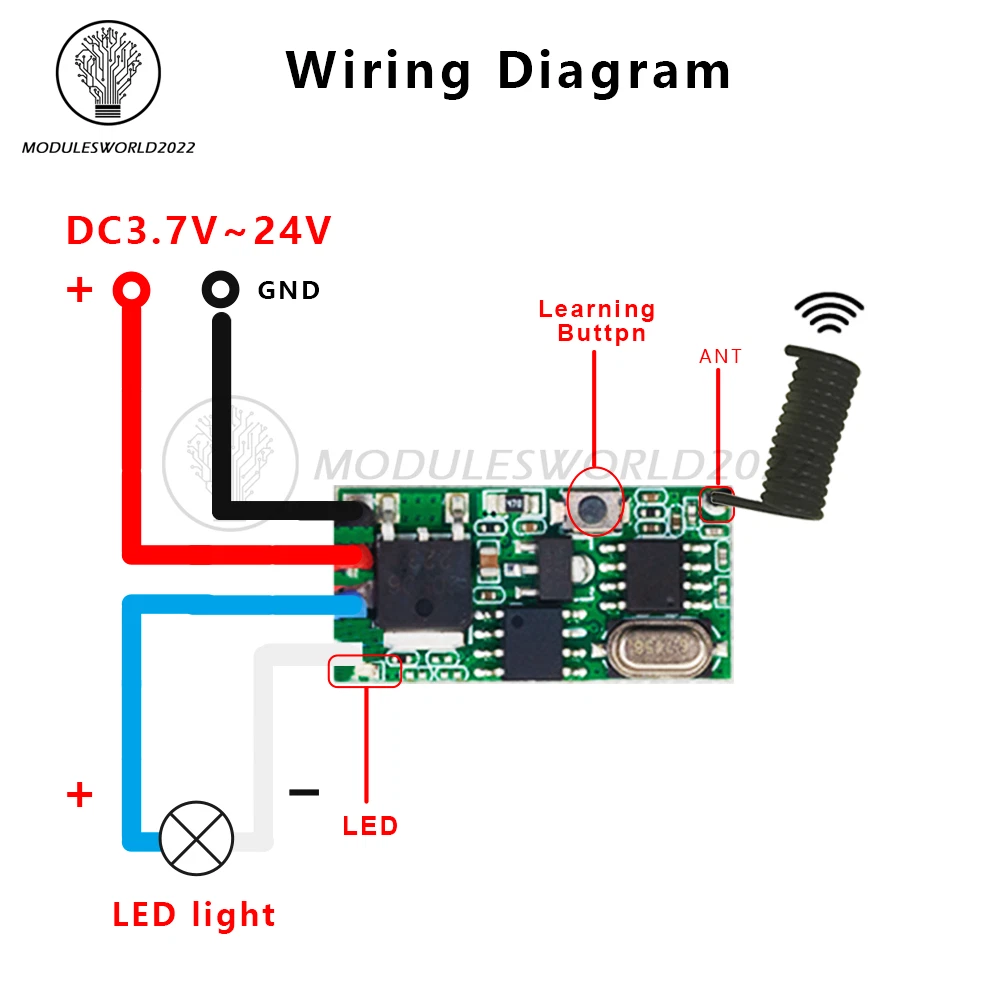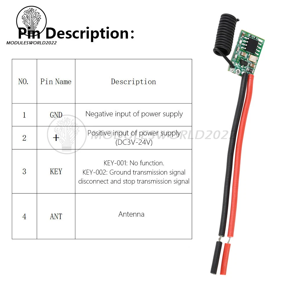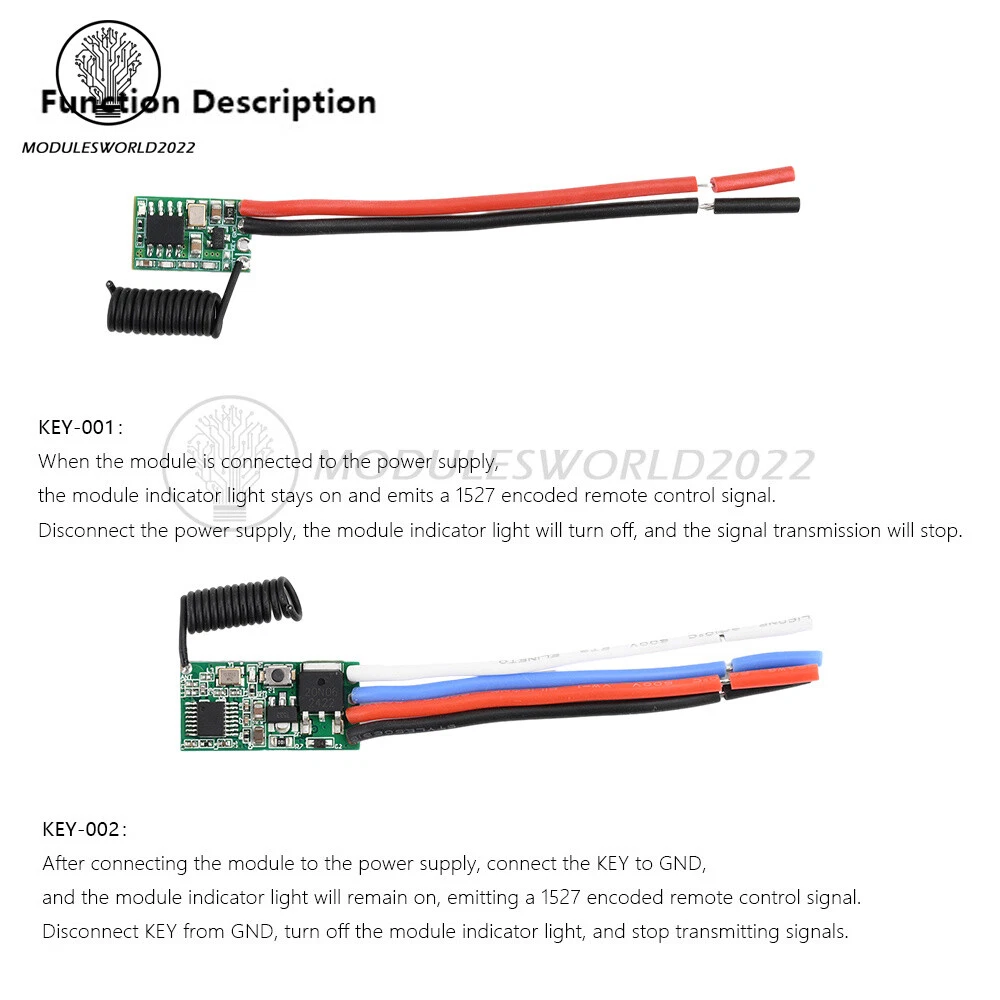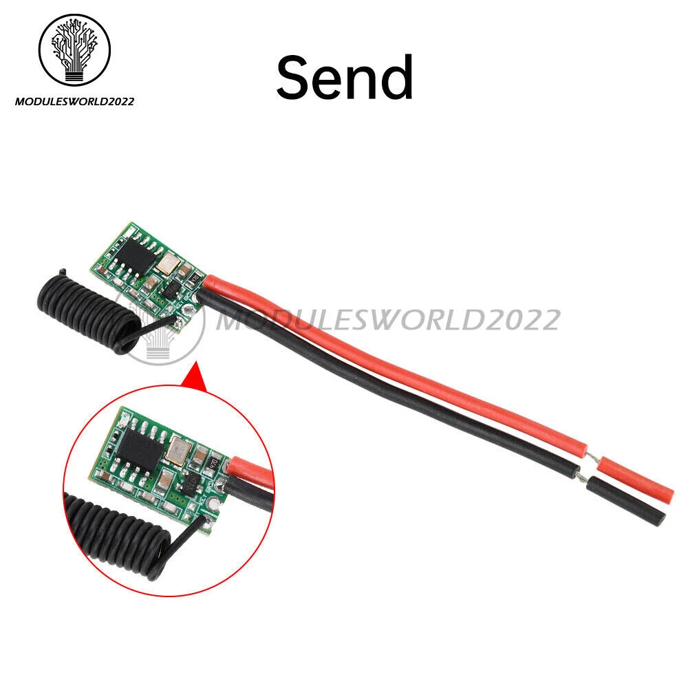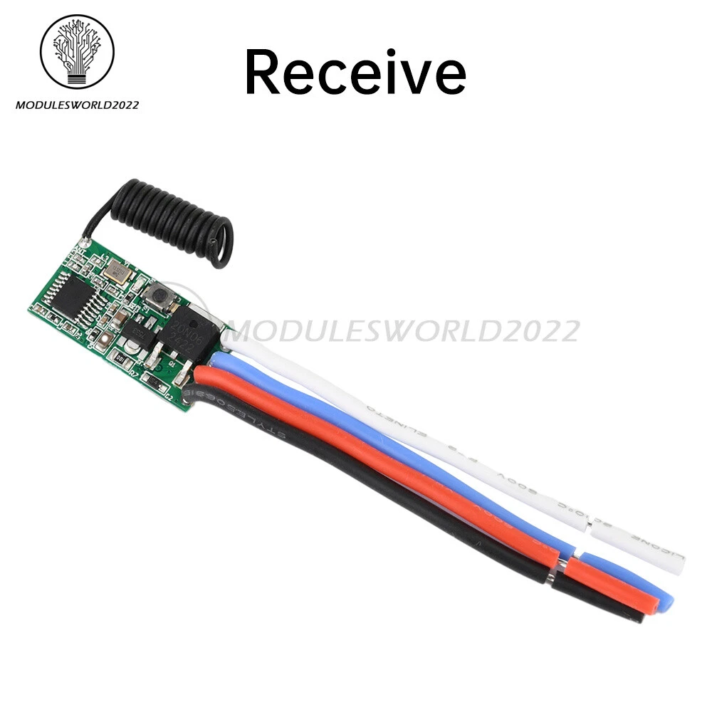 Store Categories Store Categories Other Product View Details Features 1. Easy to use, clear and simple wiring at a glance, stable and reliable performance, high sensitivity, long distance, low power consumption. 2. Extremely easy to set and reset, with 4 operation modes (momentary/toggle/locked/delay mode) programmable. 3. The signal of the wireless switch can pass through walls, floors and doors, and can control the receiver stably at a reliable distance. 4. High load capacity: Maximum load is 2A, which can effectively control high power LED lights and electrical appliances. 5.Application scope: wireless remote control switch, remote motor control, security system, access control system, smart home, etc. Specification Working voltage: Transmitter module: DC 3V-24V Receiver module: DC 3V-24V Frequency: 433-433.92MHz Transmit power: ≥10 dBm Transmitting distance: 100m-300m (open and unobstructed) Transmit power consumption: 5-6mA, no power consumption when not transmitting signals Package includes 1 x Module Shipping Policy Payment Method Returns Policy Shipping Policy Payment Method Returns Policy Home Payment Shipping About us Contact us Copyright©2018 datacaciques Home Payment Shipping About us Contact us Store Categories Store Categories Other Product View Details Features 1. Easy to use, clear and simple wiring at a glance, stable and reliable performance, high sensitivity, long distance, low power consumption. 2. Extremely easy to set and reset, with 4 operation modes (momentary/toggle/locked/delay mode) programmable. 3. The signal of the wireless switch can pass through walls, floors and doors, and can control the receiver stably at a reliable distance. 4. High load capacity: Maximum load is 2A, which can effectively control high power LED lights and electrical appliances. 5.Application scope: wireless remote control switch, remote motor control, security system, access control system, smart home, etc. Specification Working voltage: Transmitter module: DC 3V-24V Receiver module: DC 3V-24V Frequency: 433-433.92MHz Transmit power: ≥10 dBm Transmitting distance: 100m-300m (open and unobstructed) Transmit power consumption: 5-6mA, no power consumption when not transmitting signals Package includes 1 x Module Shipping Policy Payment Method Returns Policy Shipping Policy We will arrange shipping for you within 24 Hours after payment cleared except the holidays. -We ship items to Worldwide. Thank you! -we will ship out the order in 1-2 business days after payment cleared .Since it is international shipping ,delivery time is about 15--28 business days to arrive to most countries. Payment Method We accept PayPal payment ONLY, and must be received within 5 days from the date of purchase. 2. It is easy and safe for you to pay by credit cards, debit cards, bank transfers and PayPal account balances. 3.Buyers are responsible for import duties,custom fees and taxes, if any, please check your country. Returns Policy 1.We believe our items are so outstanding. We are convinced you will be happy with your Purchase. 2. If you do not satisfy with our items. Please simply return to us within 30 Days in original condition. Just pay for the returned postage. Then we can issue full refund or resend the item to you after the returned item arrived at our warehouse. 3. Please include your eBay ID and item number with any email requests.