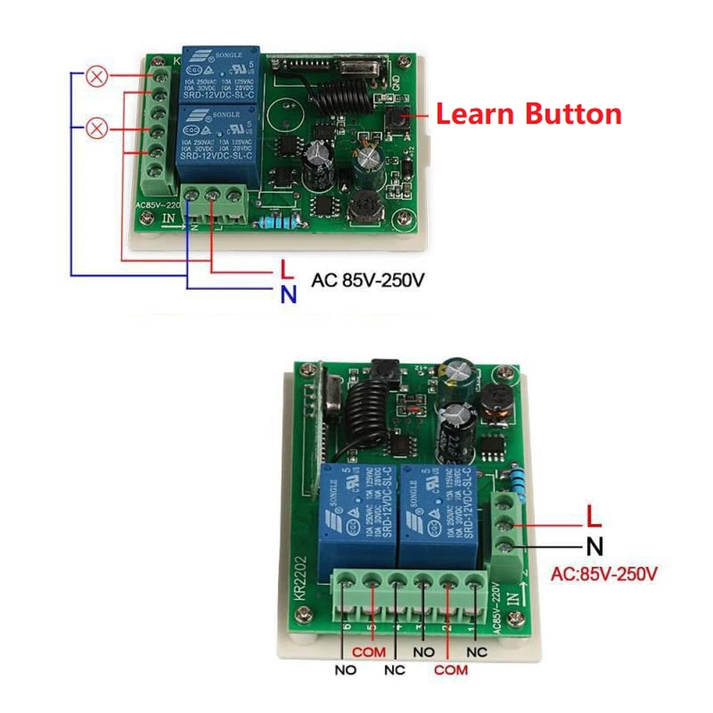 Product Description 433Mhz Universal Wireless Remote Control Switch AC 85-250V 2CH Relay Receiver Module & RF 433 Mhz for Light Switch Specifications: Input Voltage: AC 85 ~ 250V Quiescent Current: <8.5MA RF working mode: superheterodyne Receiving Sensitivity: >97dbm Remote control distance: Approx. 50 meter Decoding mode: MCU software decoding Remote storage: 16pcs Support remote type: learning code (1527) Model switching: Momentary&Toggle&Latching Wiring type: Fixed terminal Operating Frequency: 433MHz Remote control battery: 1* CR2032 batteries(Included) Remote control size: 61x29x10mm Features: 1. Mainly used in lighting, garage doors, rolling shutter doors, remote control curtains, DC motors, motor lifting, electric doors, windows, lifting equipment, gateways, elevators, industrial control and security industries, etc. The complete wireless intelligent remote control system has a wide range of uses, especially suitable for wired door and window control systems and anti-theft alarms to realize the system transfer from wired to wireless. 2. More intelligent design can make our lives more convenient. 3. In order to prolong the service life of the receiving board, the company does not recommend controlling high-power loads. When controlling 220V, it is recommended to control a maximum of 500W per channel. Instruction Manual: 1. Clear code: Push the learning button on the receivers for 8 times , the codes will be wiped.After clearing the code, all the remote controls need to be re-paired in order to control the receiver again. 2. Learning the Code:(Momentary) Push the learning key on the receiver once, initiate momentary setting mode.Just wait for the LED switches off.Push the remote button, LED indicator on the receiver board will flash briefly and switches off. After 3 seconds, the LED indicator will switch on again, indicates remote and receiver are successfully paired. Learning the Code: (Toggle) Push the learning key on the receiver twice, initiates toggle setting mode.After few seconds, the LED switches off.Push the remote button, LED indicator on the receiver board will flash briefly and switches off. After 3 seconds, the LED indicator will switch on again, indicates remote and receiver are successfully paired. Learning The Code (Latching): Latching mode require two different buttons, the first one for "ON", the second one for "OFF".For example: button A = ON , button B = OFF. Push the learning key on the receiver 3 times, initiate latching mode setting. After few seconds, the LED indicator on the receiver will flash briefly and switches off. Push the remote button A, LED flashes 5 times. Push the remote button B, LED flashes 5 times. 3 seconds later, the LED indicator will switch on again, indicates remote and receiver are successfully paired. A = ON , B = OFF. Package Includes: 1X Receiver 1X Remote control(Included 1* CR2032 battery) Notes: 1. Please do not charged operation, you should shut off the power, and operation after testing and correct electricity. 2. Please promptly change battery when remote control voltage is insufficient (when the battery voltage is insufficient, generally get close transmitting). 3. Please pay attention to avoid metal mask,large equipment,strong interference electromagnetic filed when using wireless RF products, and avoid too short distance between the remote control and receiver board. 4. Please avoid abnormal using of the product.Abnormal using will reduce product performance and life, when seriously it may damage the products and even make danger for your safe. Payment Shipping Returns Contact Us We accept all verified payments from ebay. Orders will be shipped after receiving cleared payment. Payment due within 7 days after auction ends and for buy it now listings. We ship most of our orders within 24 hours, and may up to 48 hours for. If you want faster shipping way. Please contact us before making payment. Sometimes due to problems with our transportation company system, your shipping information may be delayed to update. We recommend that you try again after 3-4 days. If you still haven't checked the shipping information, you can contact us by ebay message. Always believe we can figure things out with communication, if it comes to return, the pacakge must be intact and the same as you receive. If you have any questions, please feel free to email our service specialists 24 Hours a Day, 7 Days a Week. We will reply you ASAP. Return/refund is accepted within 30 days after the buyer receives the item. NO exchange will be accepted after 30 days from the date when the item is received. Please contact us first before returning your product!!! If you have any questions, our Customer Service staffs welcome you to email us. We strive to answer all questions and resolve any problems as quickly as possible. You can contact us 7*24, we will reply at the first time, and we will surely solve your problems. Note: 1.We try our best to reply to your emails as soon as possible, however, due to high volume of daily incoming emails and time zone difference, we may not be able to reply your emails immediately. Please allow 1 business days for us to response. If you do not receive any reply from us, please check your email ensuring your mailbox has not reached full size. 2.Due to some ISP SPAM filter settings, you may not be able to receive our replies; if you have problems receiving our emails, you may need to use a different email account to contact us. 3.Please give us the opportunity to resolve any problem. We understand the concerns and frustrations you might have, and will try our best to resolve the issues. Please email us before leaving any negative feedback or open any dispute on PayPal. 4.We care about our valued customers, and will always try to help you. So if you have any problems, please e-mail us immediately. Payment We accept all verified payments from ebay. Orders will be shipped after receiving cleared payment. Payment due within 7 days after a