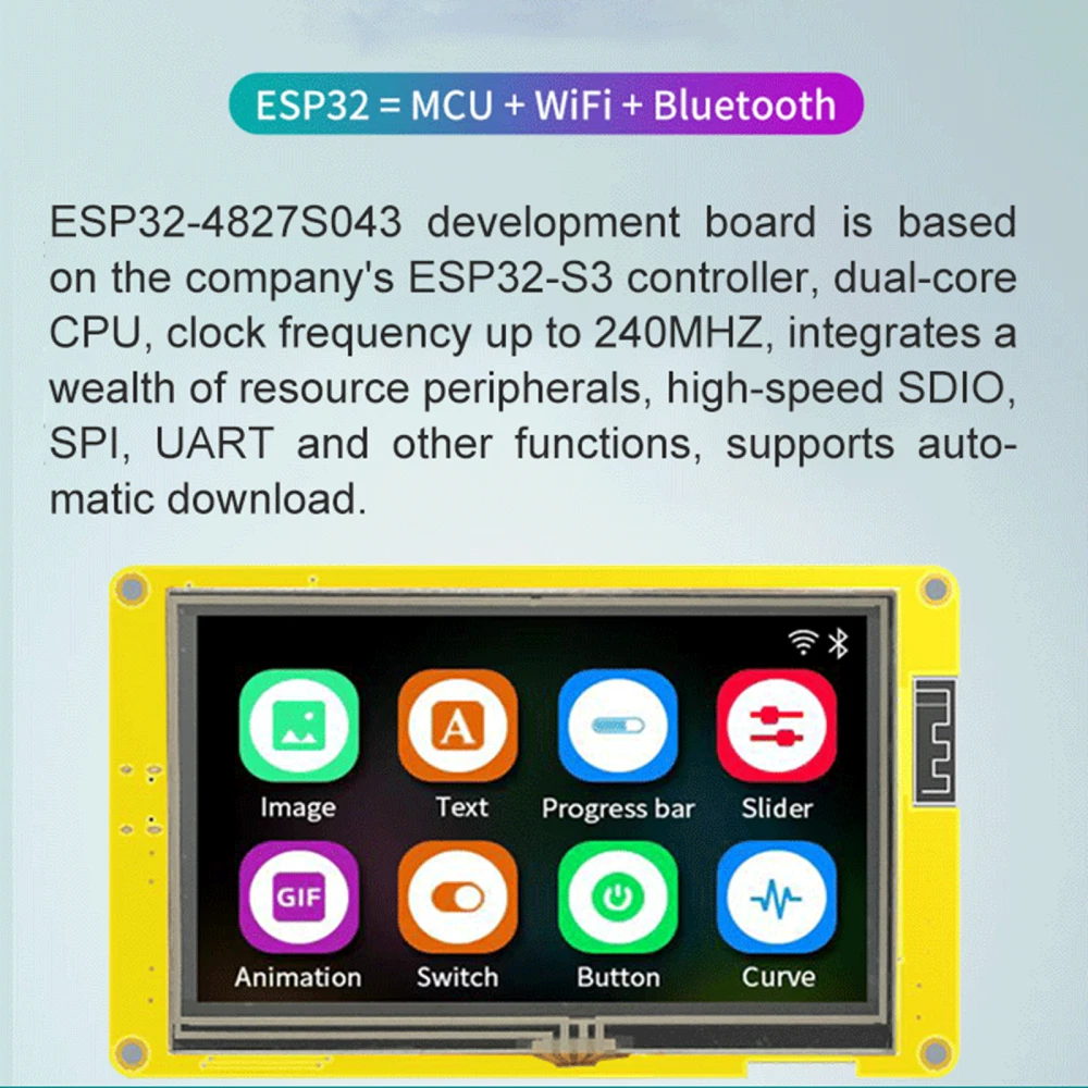 You may also like 12V LED 28cm Pre Wired LED Light Lamp Bulb For DIY Home Decoration Eight Colors 3.89 USD 3.68 USD Universal 12V 433MHz Electric Cloning Gate Garage Door Open Remote Control Fob 4.99 USD 3.68 USD 12V Mini Solenoid Electric Control Push-Pull Cabinet Drawer Door Electric Lock 4.89 USD 3.68 USD 10pcs Prank Funny Magic Trick Joke Special Lifelike Fake Cockroach Roach Toy 1.99 USD 3.68 USD 6pcs Guitar String Nails Solid Brass Bridge Pins Abalone Dot Inlay Acoustic d 10.99 USD Free shipping Replacement Treadmill Magnetic Sensor Speed Sensor for Running Machine Repairs 6.99 USD 3.68 USD Product Description 4.3in 480*270 ESP32-S3 Arduino LVGL WIFI&Bluetooth Smart Display Screen Module f Features: ESP32-4827S043 development board is basedon the company's ESP32-S3 controller, dual-core CPU, clock frequency up to 240MHZ, integrates a wealth of resource peripherals, high-speed SDIO, SPI, UART and other functions, supports automatic download. ESP32-4827S043 development board, which gives full play to the development of the internet of things, is areal internet of things development tool with a control-lable display screen, which can be used for APP remotecontrol, remote environmental data collection, remotedata fusion, remote parameter settings and other loT development applications. The development of the remote IOT app uses blank app software, which can customize the personalized interface on the terminal device, with rich built-in controls and beautiful U interface. You can customize the app control module and interface, which is very suitable for making an app interface that meets your own requirements. Specifications: Working voltage: 4.75-5.25V SPIFlash default: 32Mbit RAM internal: 520KB Wi-Fi: 802.11b/g/n/e/i Bluetooth: 4.2BR/EDR and BLE standard Support interface (2Mbps): UART, SPI, I2C, PWM Support TF card, maximum support 4G IO port: 9 Serial port rate default: 115200bps Spectrum range: 2400 ~2483.5MHz Antenna form Onboard PCB antenna, gain 2dBi Image output format: JPEG (only OV2640 support), BMP, GRAYSCALE Transmit power: 802.11b: 17±2dBm (@11Mbps), 802.11g: 14±2dBm (@54Mbps), 802.11n: 13±2dBm (@MCS7) Receiving sensitivity: CCK, 1Mbps: -90dBm CCK, 11Mbps: -85dBm 6Mbps(1/2BPSK): -88dBm 54Mbps (3/464-QAM): -70dBm MCS7 (65Mbps, 72.2Mbps): -67dBm Power consumption Turn off the flash: 180mA@5V Turn on the flash and adjust the brightness to the maximum: 310mA@5V Security WPA/WPA2/WPA2-Enterprise/WPS Working temperature -20 ℃~ 70 ℃ Storage environment -40 ℃~ 125 ℃, <90%RH Package include: 1* ESP32-S3 4.3 inch screen Shipping Contact Us We ship most of our orders within 24 hours, and may up to 48 hours from US Warehouse. In 2-5 working days, you will receive your items. Sometimes due to problems with our transportation company system, your shipping information may be delayed to update. We recommend that you try again after 3-4 days. If you still haven't checked the shipping information, you can contact us by ebay message. If you have any questions, our Customer Service staffs welcome you to email us. We strive to answer all questions and resolve any problems as quickly as possible. You can contact us 7*24, we will reply at the first time, and we will surely solve your problems. Note: 1.We try our best to reply to your emails as soon as possible, however, due to high volume of daily incoming emails and time zone difference, we may not be able to reply your emails immediately. Please allow 1 business days for us to response. If you do not receive any reply from us, please check your email ensuring your mailbox has not reached full size. 2.Due to some ISP SPAM filter settings, you may not be able to receive our replies; if you have problems receiving our emails, you may need to use a different email account to contact us. 3.Please give us the opportunity to resolve any problem. We understand the concerns and frustrations you might have, and will try our best to resolve the issues. Please email us before leaving any negative feedback or open any dispute on PayPal. 4.We care about our valued customers, and will always try to help you. So if you have any problems, please e-mail us immediately. Shipping We ship most of our orders within 24 hours, and may up to 48 hours from US Warehouse. In 2-5 working days, you will receive your items. Sometimes due to problems with our transportation company system, your shipping information may be delayed to update. We recommend that you try again after 3-4 days. If you still haven't checked the shipping information, you can contact us by ebay message. Contact Us If you have any questions, our Customer Service staffs welcome you to email us. We strive to answer all questions and resolve any problems as quickly as possible. You can contact us 7*24, we will reply at the first time, and we will surely solve your problems. Note: 1.We try our best to reply to your emails as soon as possible, however, due to high volume of daily incoming emails and time zone difference, we may not be able to reply your emails immediately. Please allow 1 business days for us to response. If you do not receive any reply from us, please check your email ensuring your mailbox has not reached full size. 2.Due to some ISP SPAM filter settings, you may not be able to receive our replies; if you have problems receiving our emails, you may need to use a different email account to contact us. 3.Please give us the opportunity to resolve any problem. We understand the concerns and frustrations you might have, and will try our best to resolve the issues. Please email us before leaving any negative feedback or open any dispute on PayPal. 4.We care about our valued customers, and will always try to help you. So if you have any problems, please e-mail us immediately. powered by 12Pcs PH2 Impact Driver Bit Set Magnetic Phillips Screwdriver Drill Bits Tool 11.99 USD 3.68 USD Retro TV DIY Enlarger Amplifier Magnifier Magnifying Glass Appearance Vintage 9.59 USD 3.68 USD 5Pcs USB 