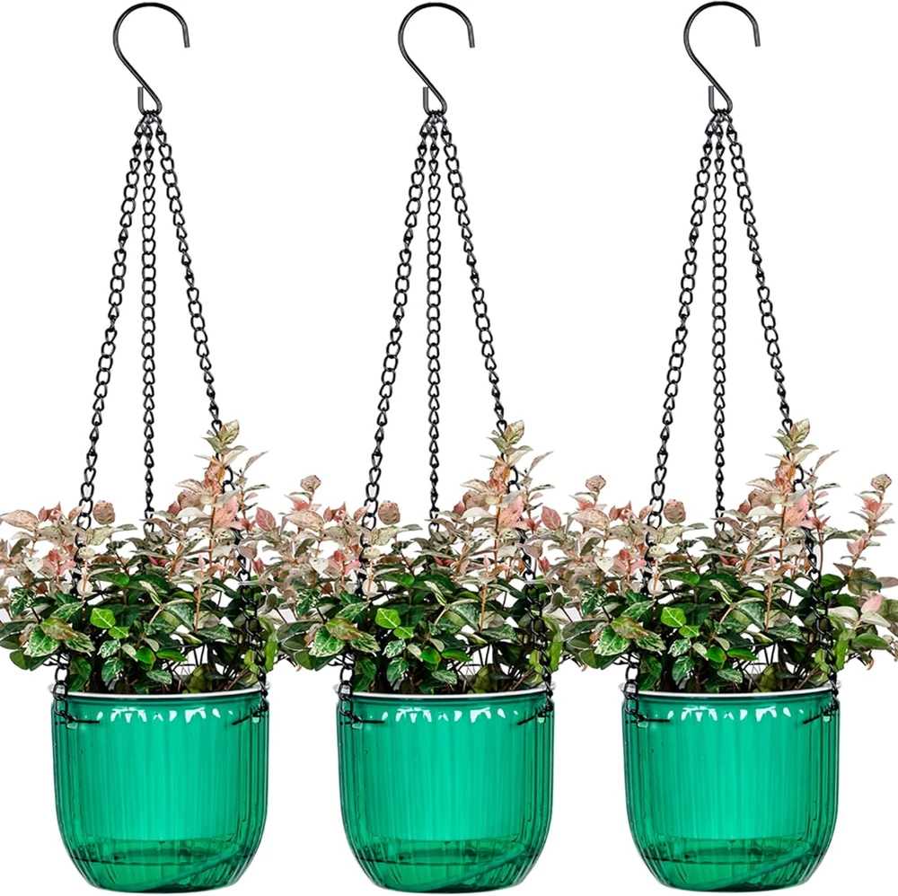 Clear As Glass: High quality transparent PET materials make our plastic hanging pot for plants as clear as glass. Visible water level from any angle. Easy for you to see how much water in the hanging flower pot. Hanging Self Watering Planters: The hanging baskets for indoor plants come with 16.5 inch long enough chains and cotton string wicks ropes. Transfer and soak up water from outer pot to inner pot to keep consistent moisture. Outer pot base like a water reservoir allows you to add extra water to offer you more time in between watering for a couple of weeks at least. Water Ecosystem: Our self watering planter pot for indoor plants is 2 in one by lifting the inner pot. The inner planting pot has enough drainage holes to drain water to the bottom of outer pot where the excessive water is accumulated like a water reservoir. Perfect to prevent the problem of drowning plants in water too much, in turn the water reservoir is soaked up by the wick rope to feed plants. Multi Scenario: The indoor plant hanger can be set on table without hanging chains, also be hanging anywhere you want, Great for hanging plants indoor outdoor, suitable for all most plants. Premium Materials: Sturdy coating, thick plating hanging chains can help avoid rusting for outdoor use. Light weight and decently sturdy can coexist due to the thickened high dense PET raw material. Also can be exposed to the sun, harsh winter and they will not fade or crack. Product Description See Through Easily Our hanging plant baskets unique feature high-quality transparent PET, clear as glass, easy to see through and tell how much water in. Good compromise between opacity and hiding the water, keeping an eye and easy monitoring on water level. The hanging outdoor planters, well made and truly give the appearance of real glass but are actually plastic. High Dense Plastic & Durable Coating Chains for Outdoor Hanging wire of the outdoor hanging pots coated with durable plating thoroughly to prevent rusting. 3 hooks make sure of stability and stay secure for wind-resistance. Super thick, high dense PET material realize lightweight and sturdy coexisting. The hanging plant pots exposed to the sun, harsh winter will not fade, crack or peel. Hanging Anywhere or Set on Table Hanging basket planter with removable hanging wire which is easy to be disassembling. Specially-made bottom also make it suitable to be set on table without wires. Attractive color, perfect jewel tone mix of blue and green. Hook large enough to hang on a curtain rod, perfect in house. Innovative Gifts for Plant Enthusiasts, Garden Lovers! High grade transparency plastic gives clear appearance of glass. Fresh, elegant match with lovely plants. Perfect home decor partner for porch, windowsill, kitchen, balcony, garden, office, etc. Self Watering Water is transferred from outer pot to inner pot to help offer consistent moisture. Through a cotton string wick to soak up water, the outer pot base like water reservoir allows you to add extra water because it’ll be soaked it up slowing. You have more time in between watering! Inner Pot with Drainage Net- Plants Grow Healthily Simple Hooks Design Perfect Coexisting of Hanging & Glass Look Well made of plastic actually, sturdy and truly give the appearance of real glass. However, it doesn’t take away too much from the look. It actually ends up being for the better because they're not too heavy for hanging. A great idea and cuts down on the total weight once you add a plant and water to it. Beautiful color looks like glass, perfectly sized for your needs. Inner planting pot hold surprising amount of soil, drainage net drain excessive water to outer pot base which mainly work like a water reservoir. Perfect to prevent problem of drowning plants. Easy to assemble the hooks. Just pass an end of it transversely through a hole on the hanging indoor planters