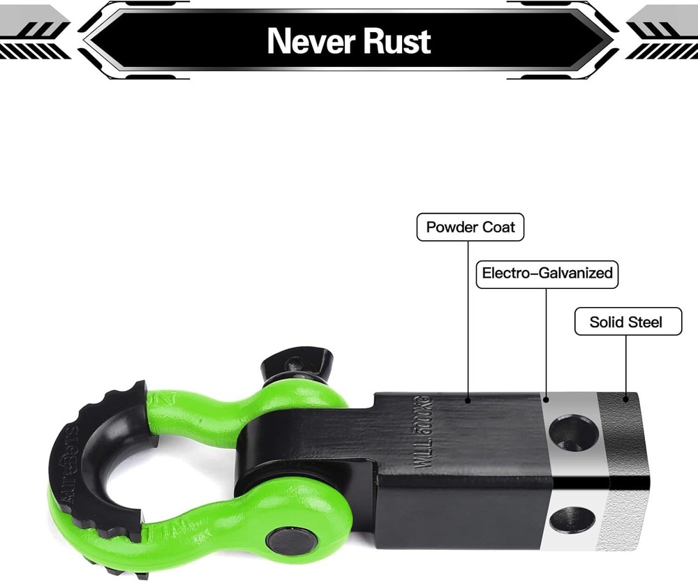 High-strength: our tow hitch receiver consisting of carbon steel with a breakpoint of 45,000 lbs. Shackle silicone isolators to prevent scratching when mounted. This shackle hitch receiver accessory is suitable for all towing applications Anti-rust: hitch receiver anticorrosive with electro-galvanized steel for added durability. The black powder coating provides trailer hitch receiver durable and strong protection against the hardest of conditions Multi-mount design: Shackle hitch receiver with 5/8" screw pin, 3/4 shackles isolator and washer to make it more stability. Dual hitch pin hole design allows the D Rings to swing horizontally or vertically for ease of use Multiple uses: tow hitch shackle fits all standard 2" tow receivers, turning your truck, SUV or any other vehicle into a towing machine built to resist any kind of harsh conditions. The rugged powder-coated finish provides superior corrosion resistance 100% Satisfaction Guarantee: We offer a refined plastic foam case. We offer a 30-day return guarantee. If you have any questions, please feel free to contact us and we will be available to answer your questions