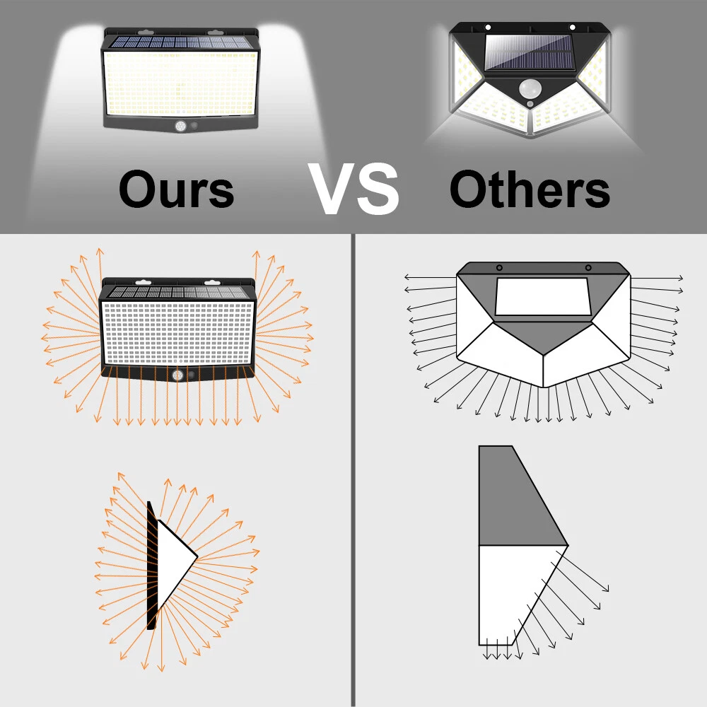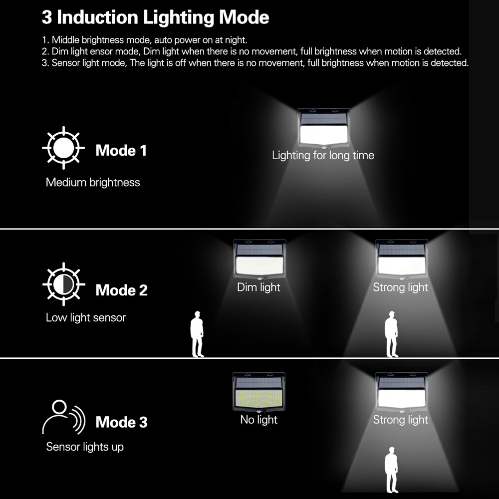 【 Eco-friendly Product 】 468 LED solar wall light added indicator is a product that designed to be energy saving and environmental protecting. It has long durability and long-life span. More than that, it has low fault repair rate and high radiation stability which makes it an awesome product. 【 Easy to Install 】 468 LED solar wall light is very simple to install, no wiring is needed. Just find a spot and Adhere to the wall with the attached double-sided tape to the outdoor well sun-lit location. 【 Easy to use 】 468 LED solar waterproof four-sided human body induction wall light switch front setting is easier to operate. It has 3 setting which you can achieve by pushing the button in the middle. It has intelligent light-sensing sensor and wide range lighting angle. Description and Features 3 Modes Available - Mode 1. Medium Bright: When the night falls, the solar light will maintain 1/2 brightness. - Mode 2. Dim Bright + Full Bright : Slight brightness when no motion is detected. When motion is activated, it lights up in full brightness and turns back to slight brightness when motion is no longer detected. - Mode 3. No Bright + Full Bright : No brightness when no motion is detected. When motion is activated, it lights up in full brightness and turns back to no brightness when motion is no longer detected. - Can be widely used for garden, patio yard, deck garage, pathway porch in most kinds of weather. Weather Resistance - Our units are made of high-impact ABS which can withstand snow, rain and other extreme weather conditions. IP65 waterproof and heatproof, solar powered lights, suitable for most kinds of weathers. 300 ° Wide Angle -The solar wall lights by using exclusive 4-Side Built-in LEDs Wide-angle Lighting Design, the illumination range can be improved up to 300°. So, the coverage area has been upgraded almost three times than before. Sufficient Use Time - It can be used more than 10 hours after charging, which is more convenient. Packing list: Solar Light Screw English manual On Jan 8, 2025 at 03:12:10 PST, seller added the following information:
